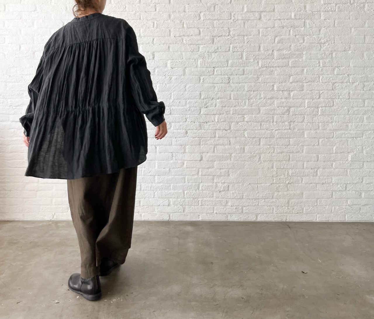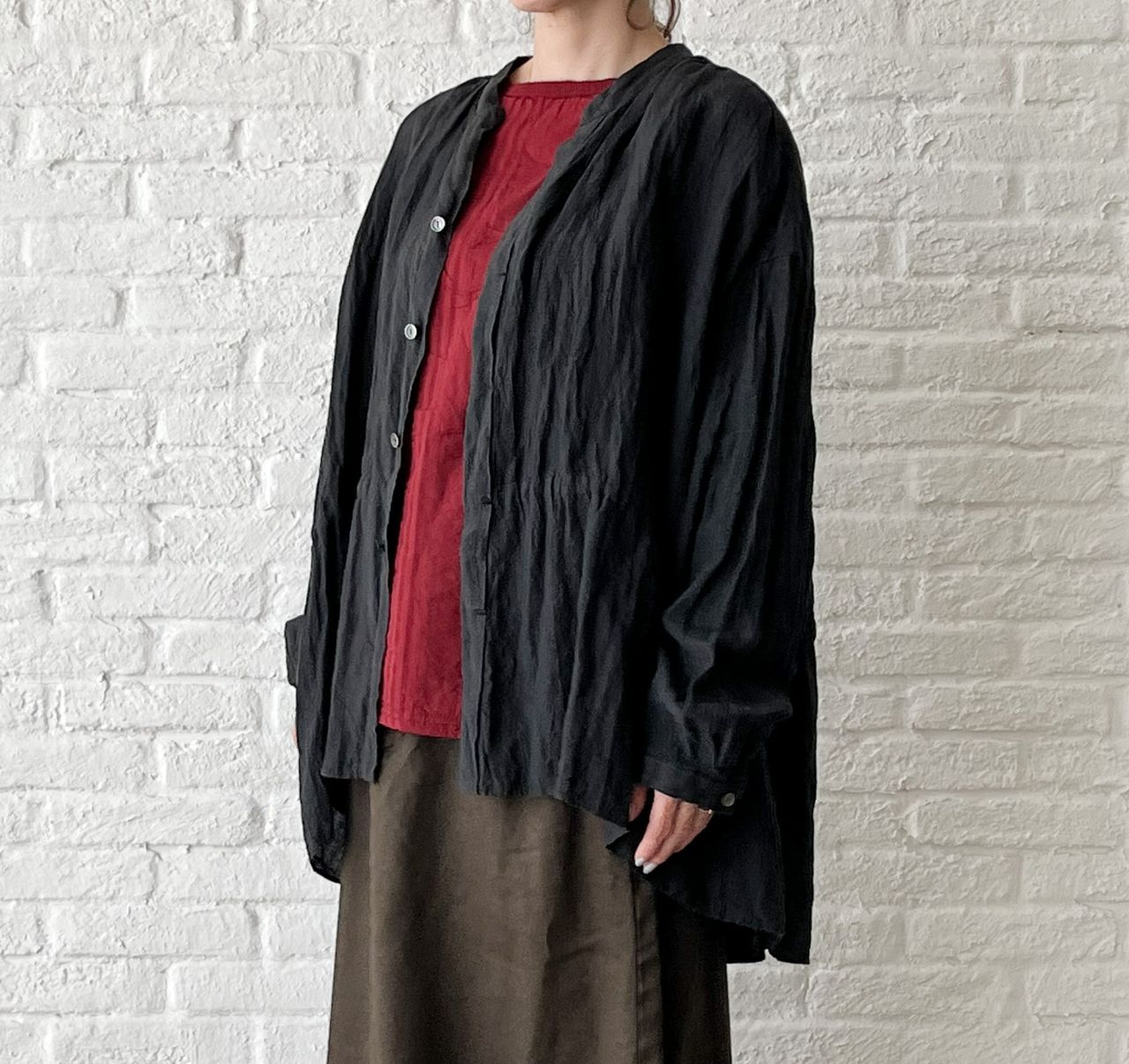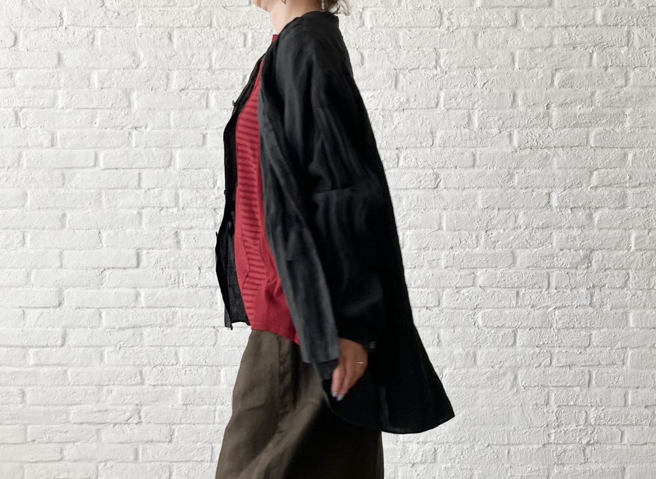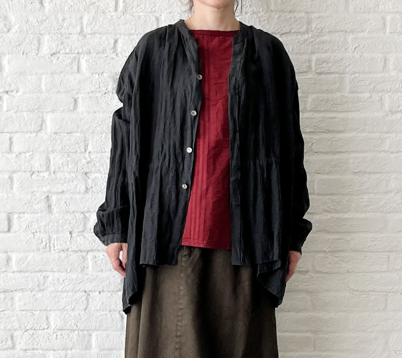 いまはカットソーの上に羽織って、寒くなってきたらシャツとして着て、上にアウターを羽織っていただけます。