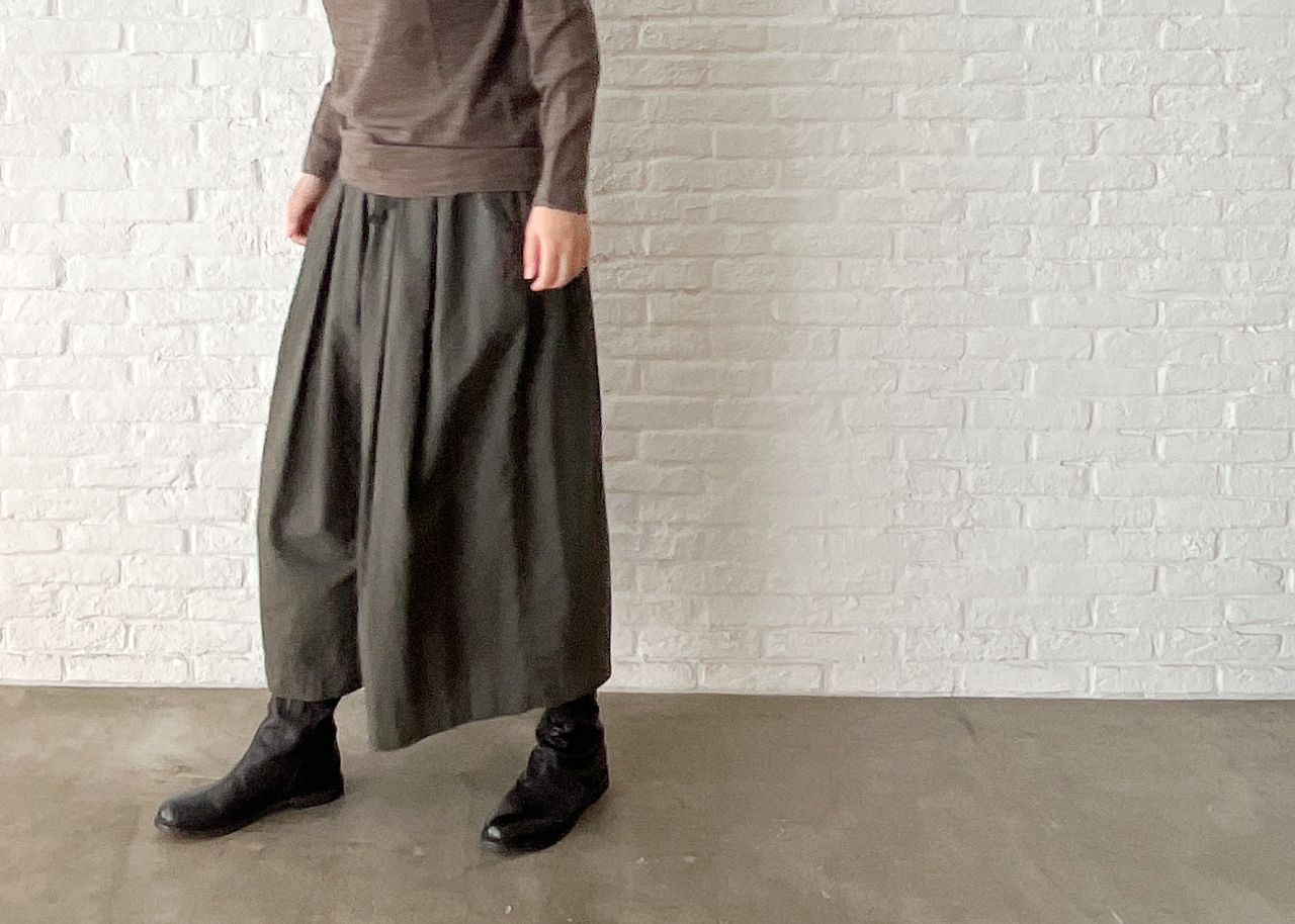 ボリューム感あるシルエットのパンツで、秋冬はブーツとの組み合わせが◎。