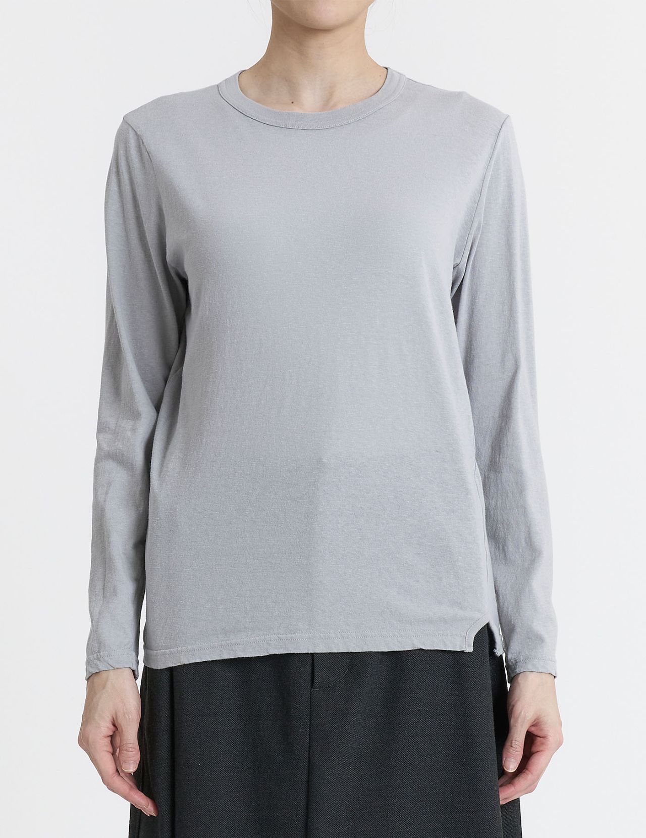 インナーには、チャコールのワンピースと相性の良いサックスのカットソーを中に着ました。