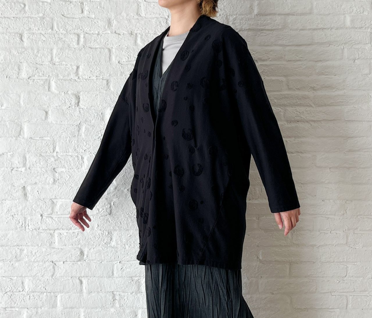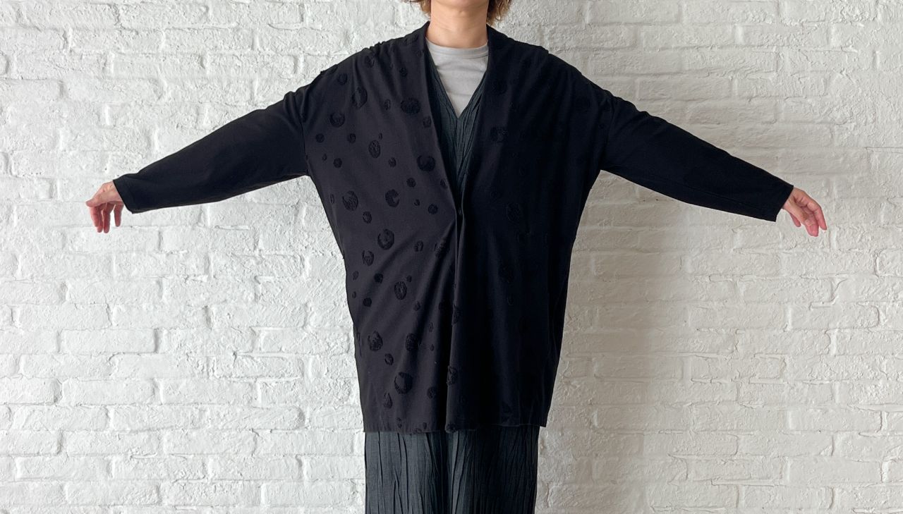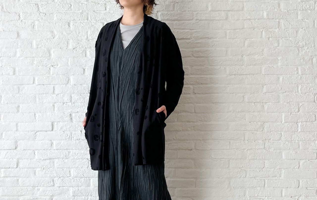 同系色のドット柄が前身頃に入っていますが、同色なのでさりげなく馴染みます。