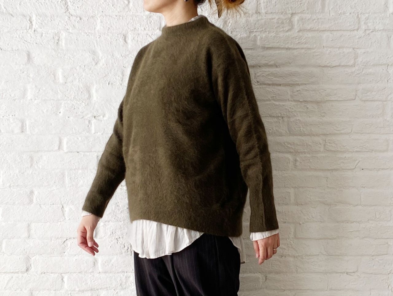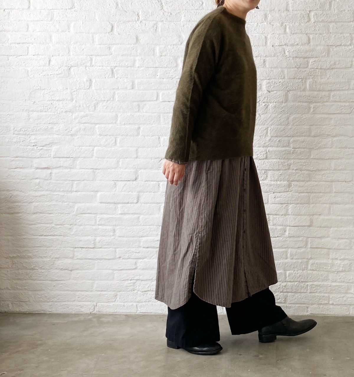 カーキのニット×暗めのブラウンのパンツ。