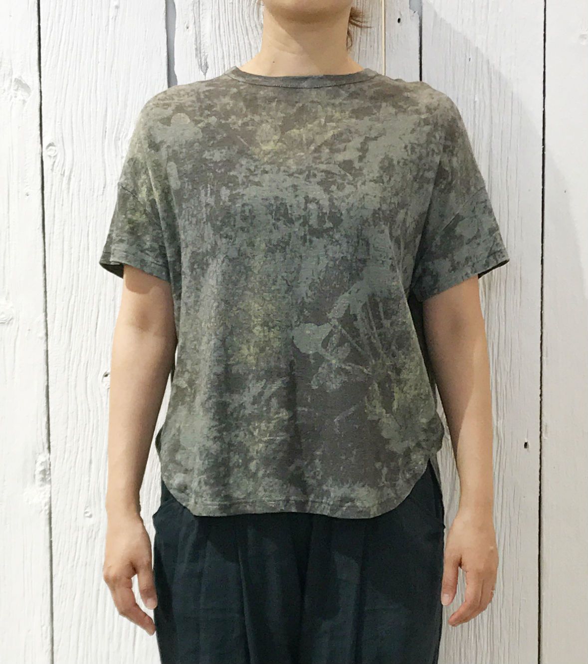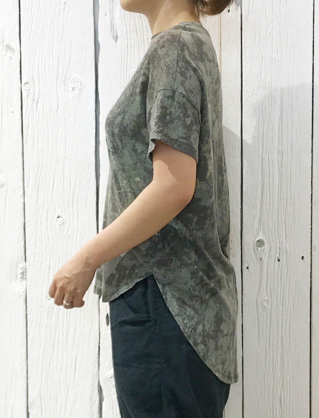 丸首のTシャツですが、後ろがお尻にかかる位長くなっているのが特徴です。