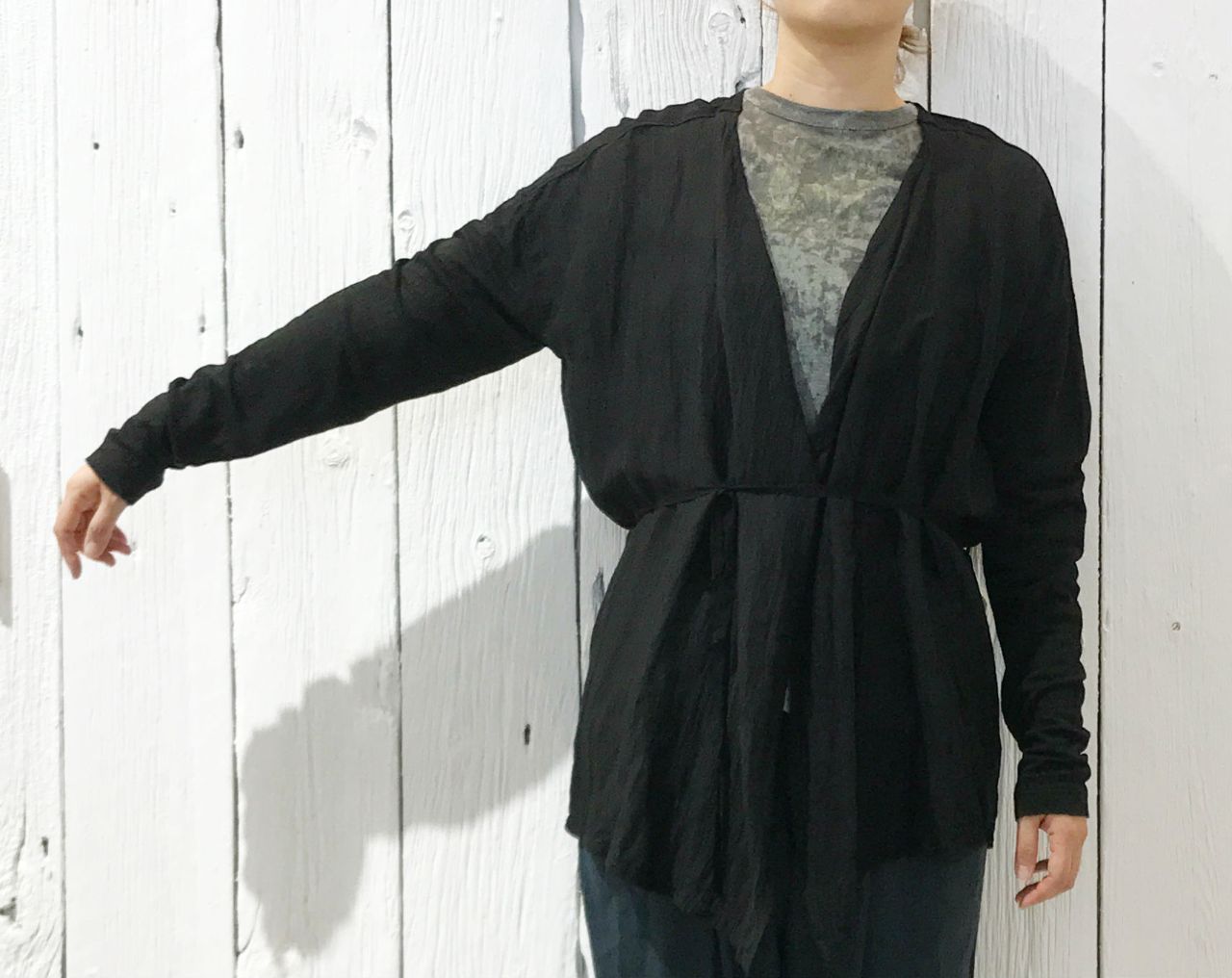 前身頃などには布帛、袖にはカットソー素材を使用したカーディガン。