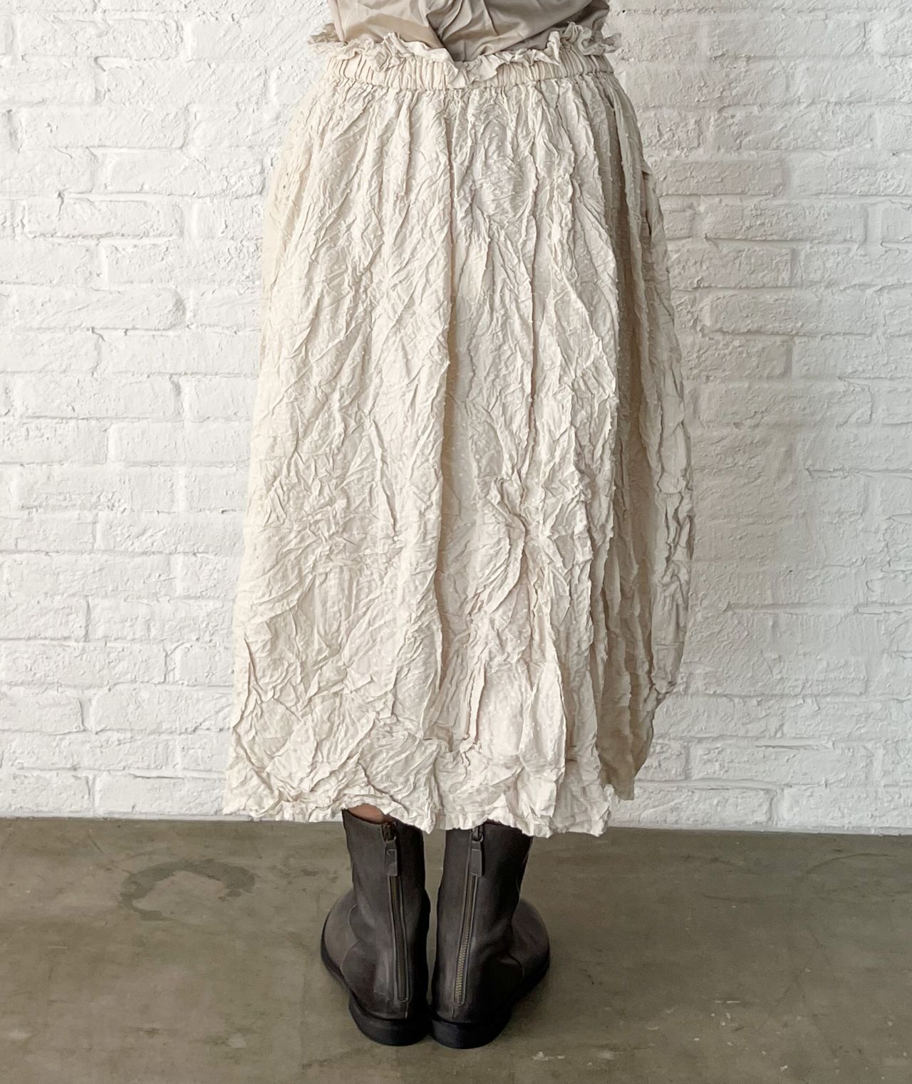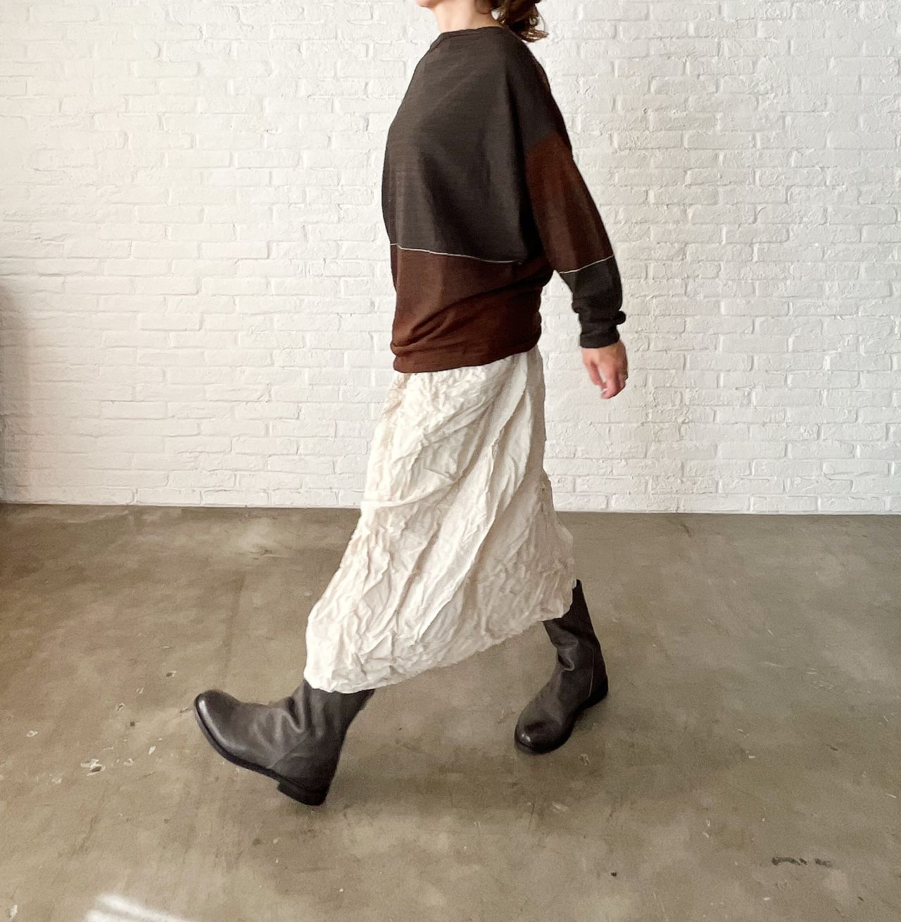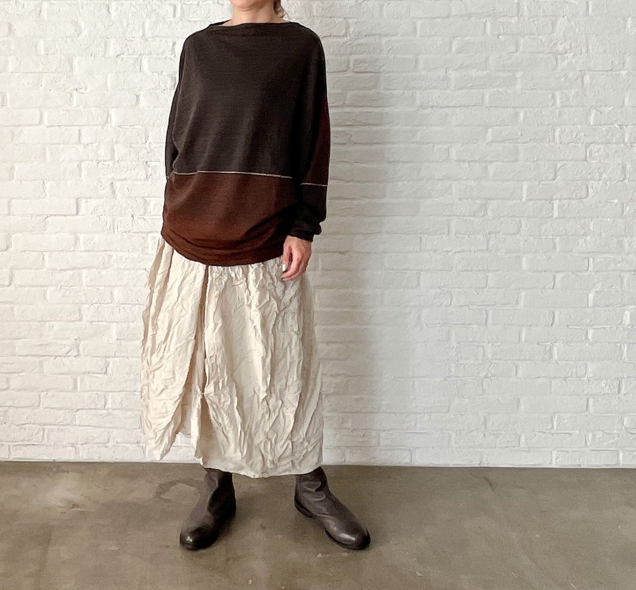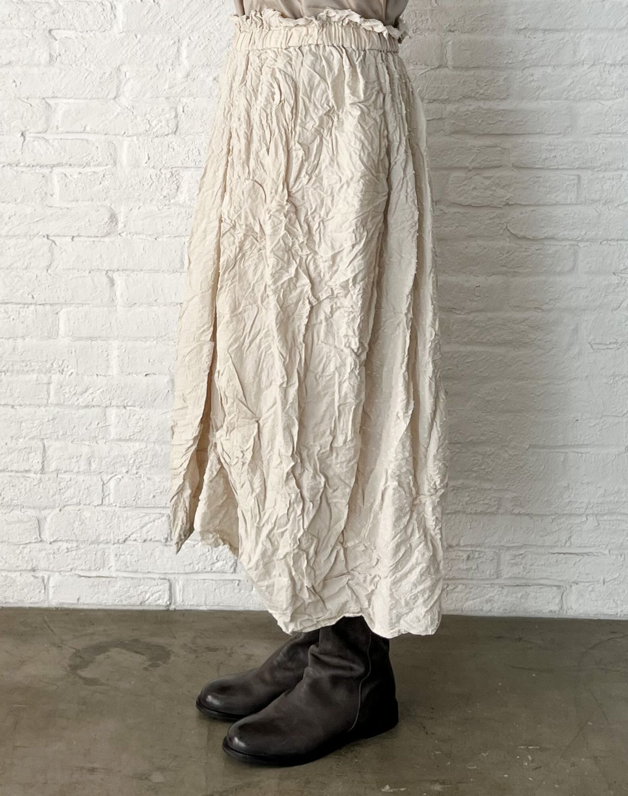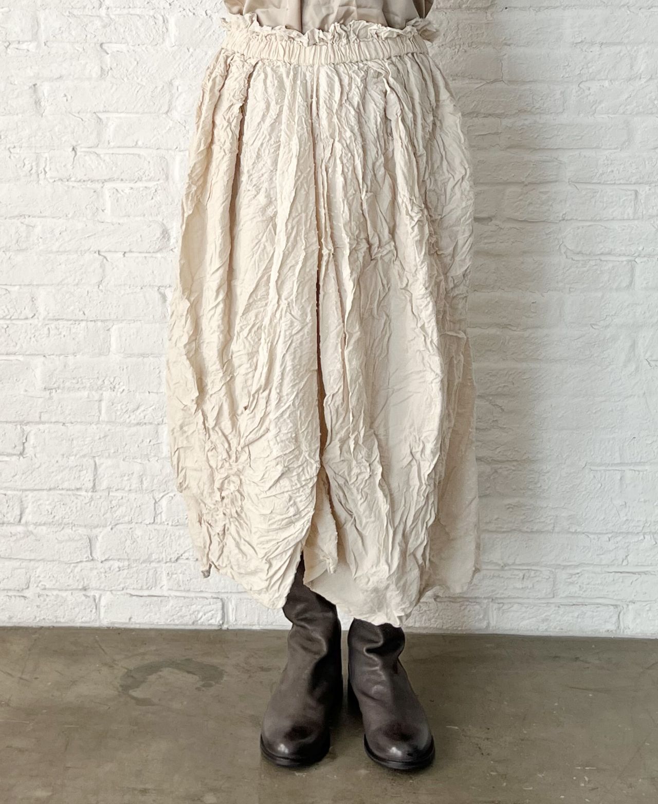 ウエストベルトはゴム+テープで、 イレギュラーなフォルムながらも広がりすぎないシルエット。