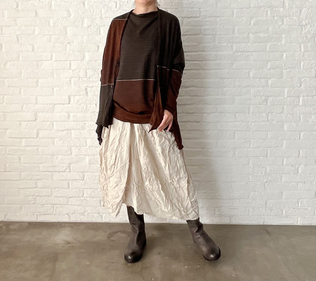 ブラウン系のボトムスやブラウスなどが入荷しているので、合わせていただきやすいようなブ明るいラウンをチョイスしました。