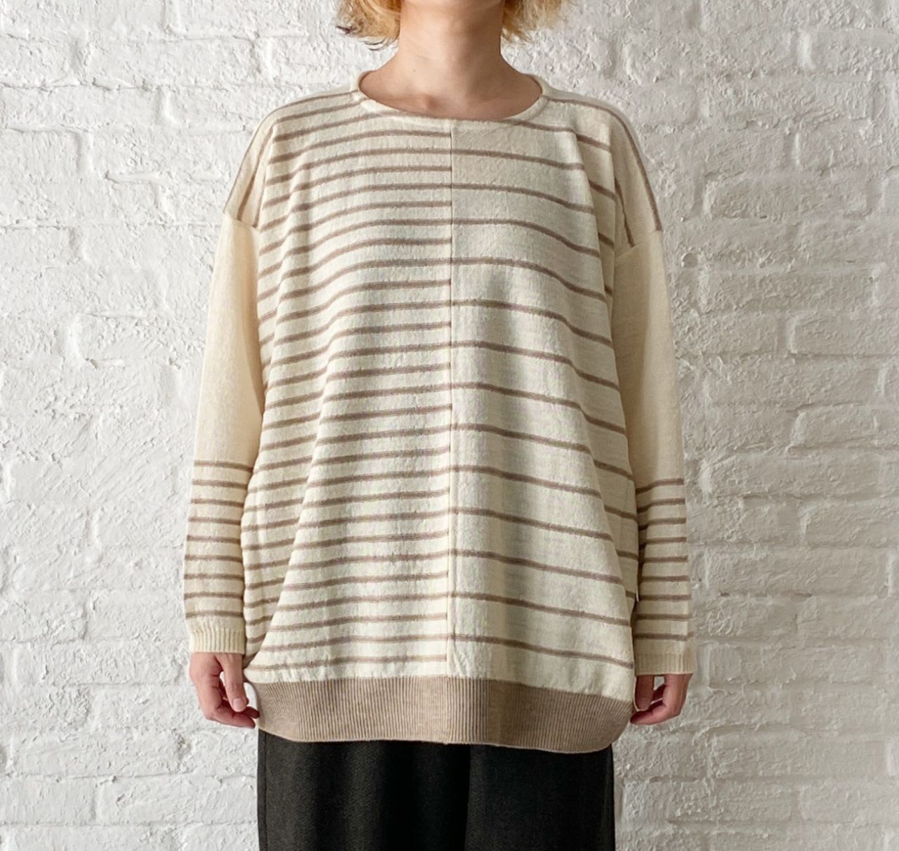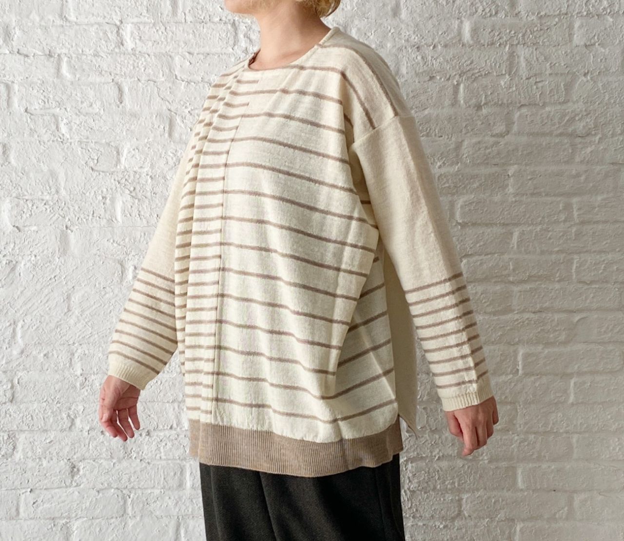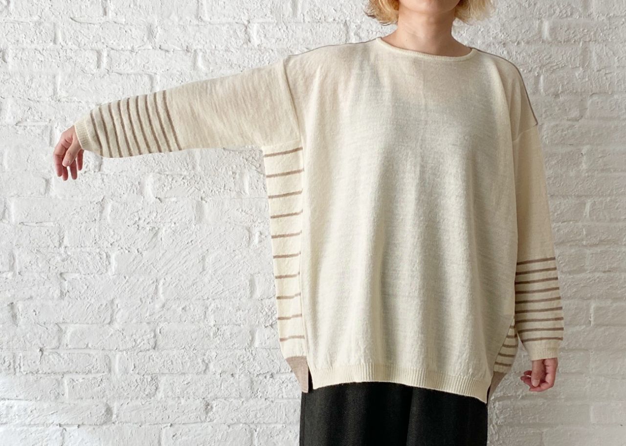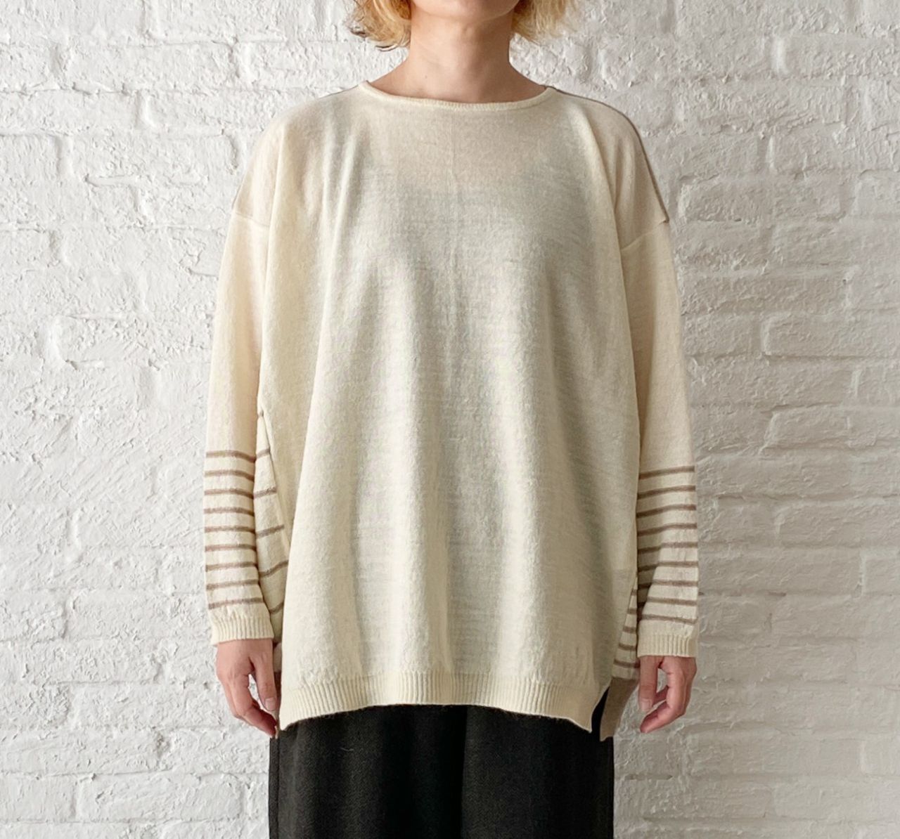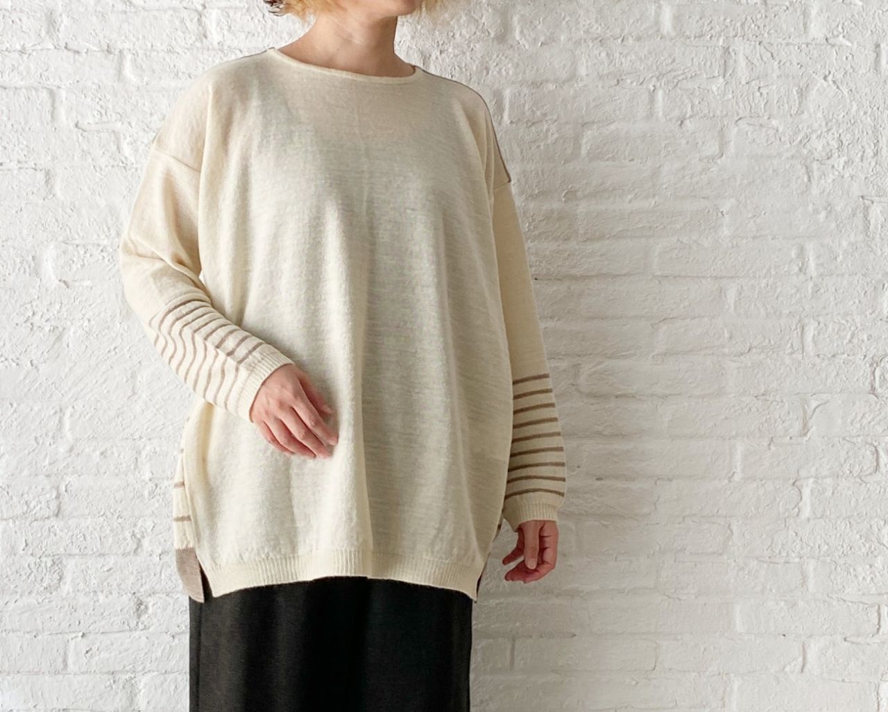 袖にボーダーが入った、ゆったりしたT字のニットプルオーバー。