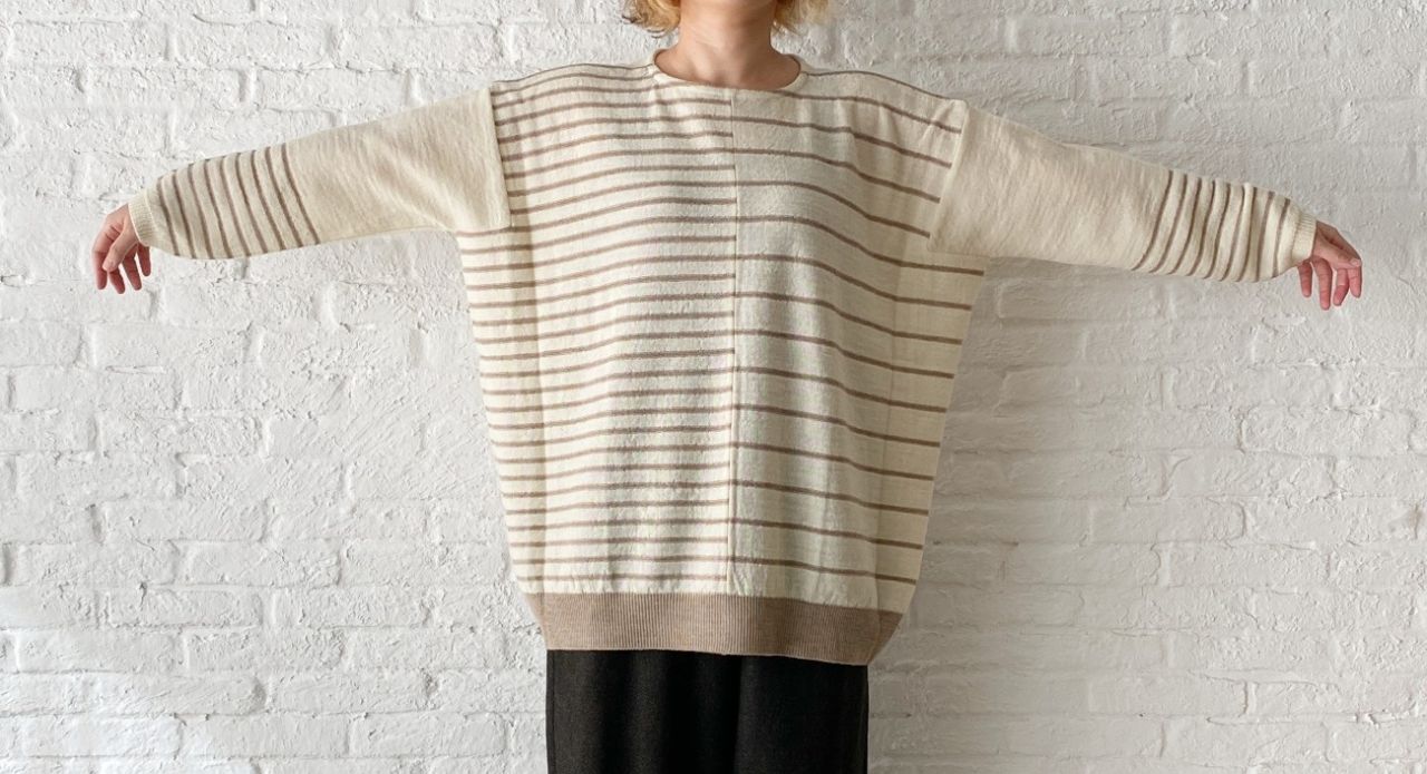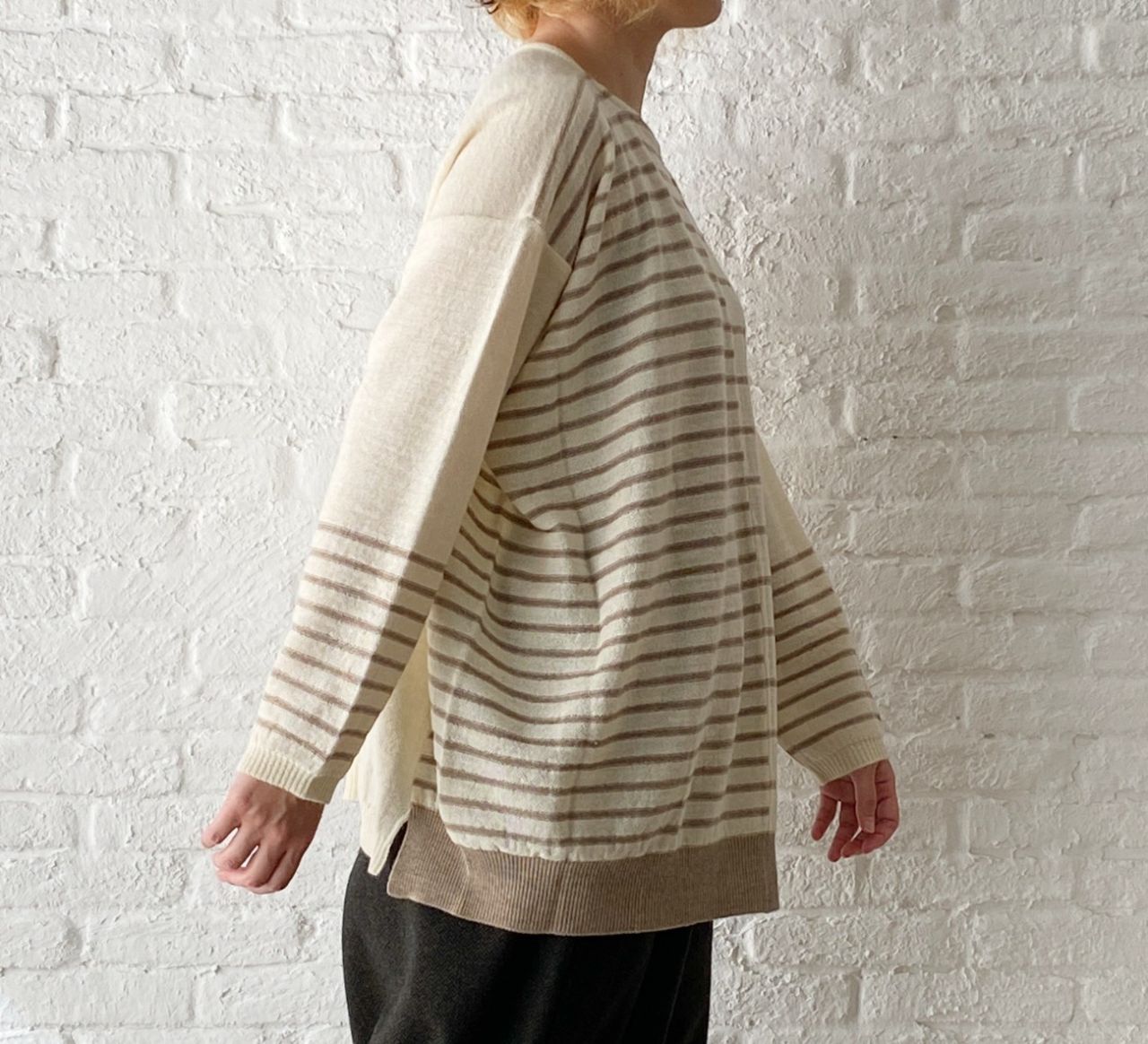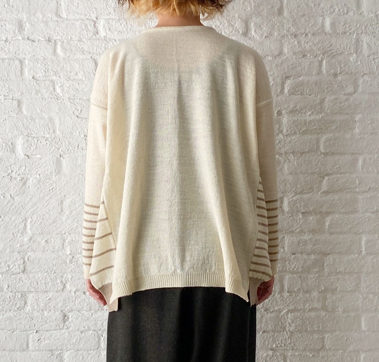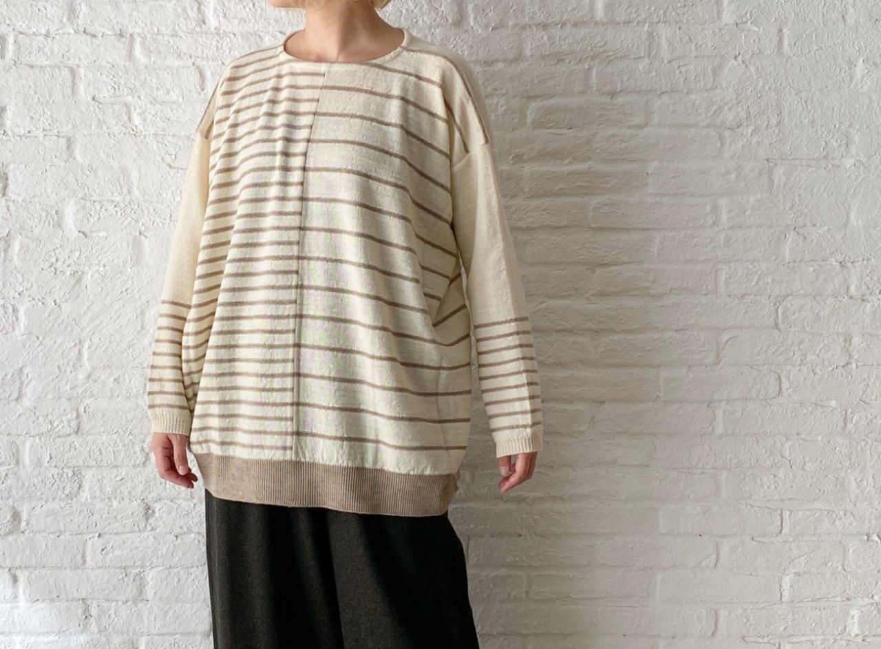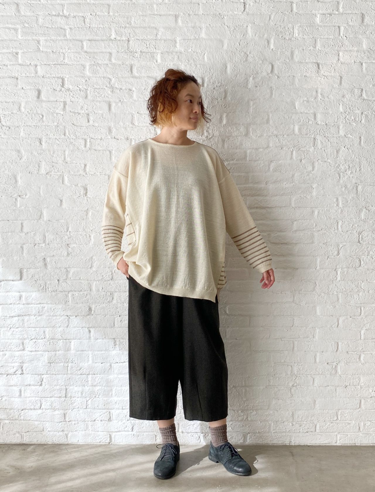袖にボーダーが入った、ゆったりしたT字のニットプルオーバー。