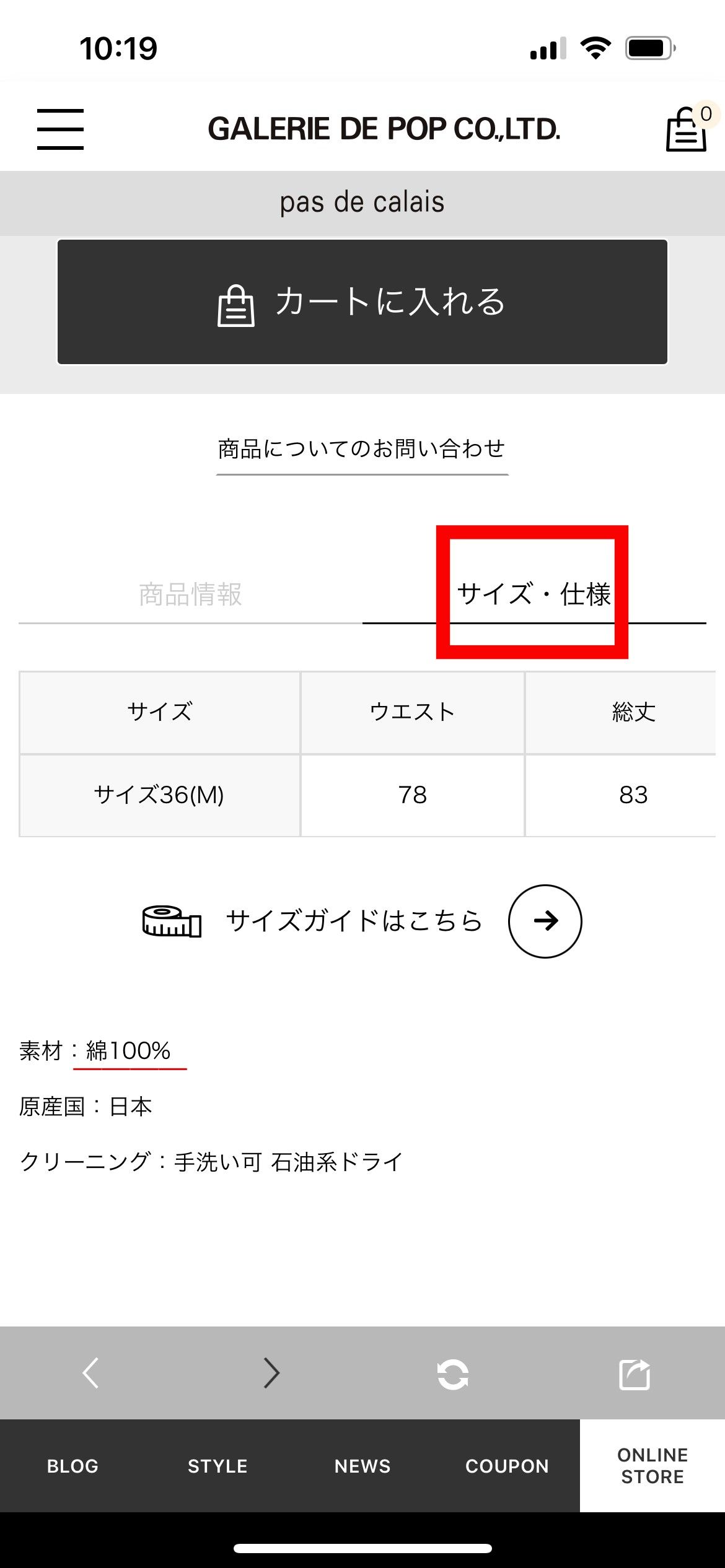 「商品情報」の横にある「サイズ・仕様」をタップしていただくと、サイズ・素材・クリーニングなどがございます。
