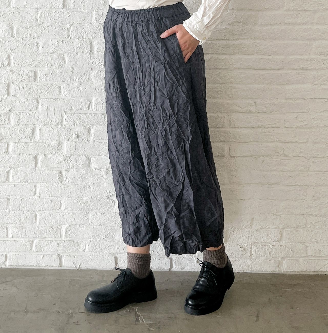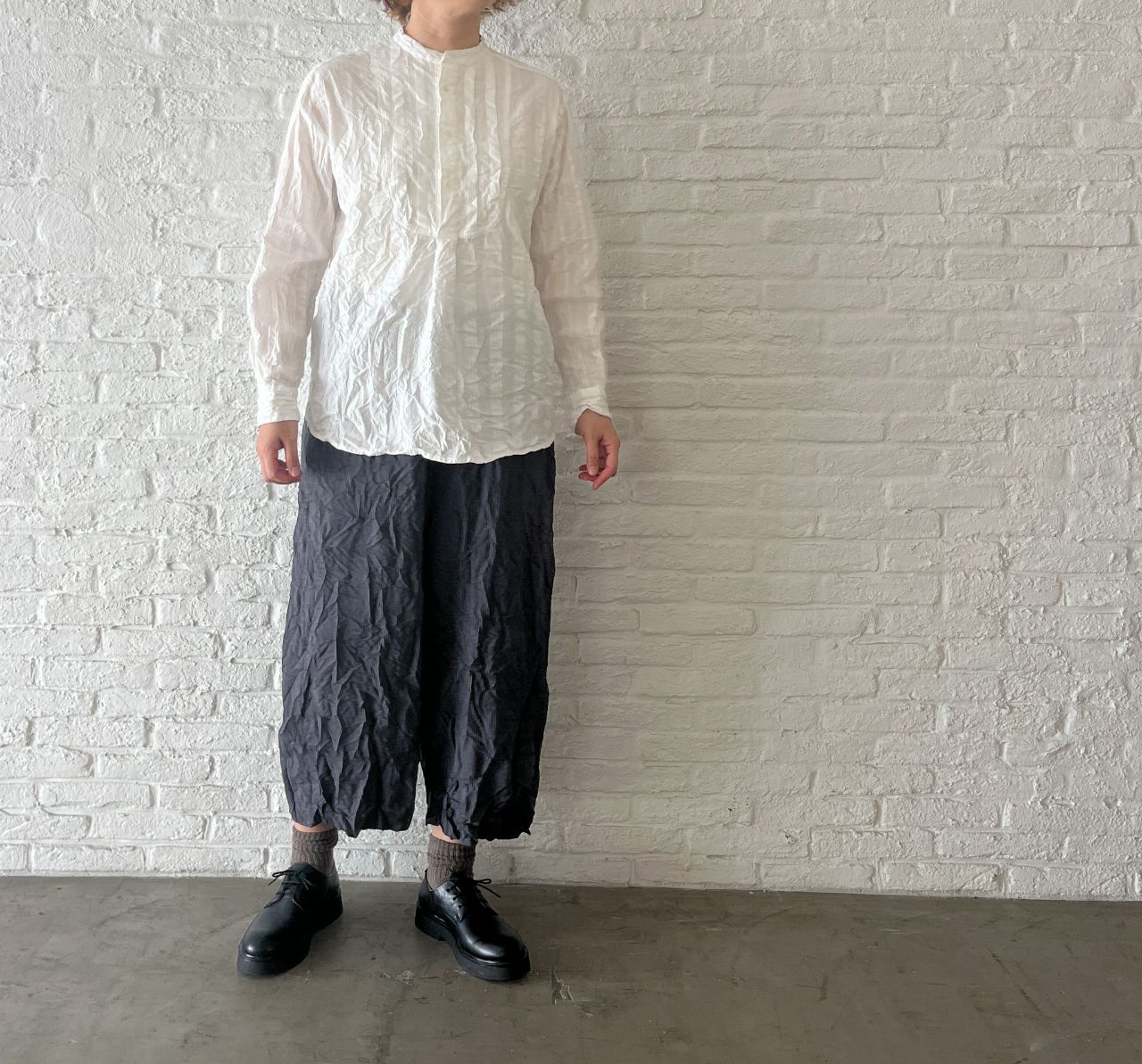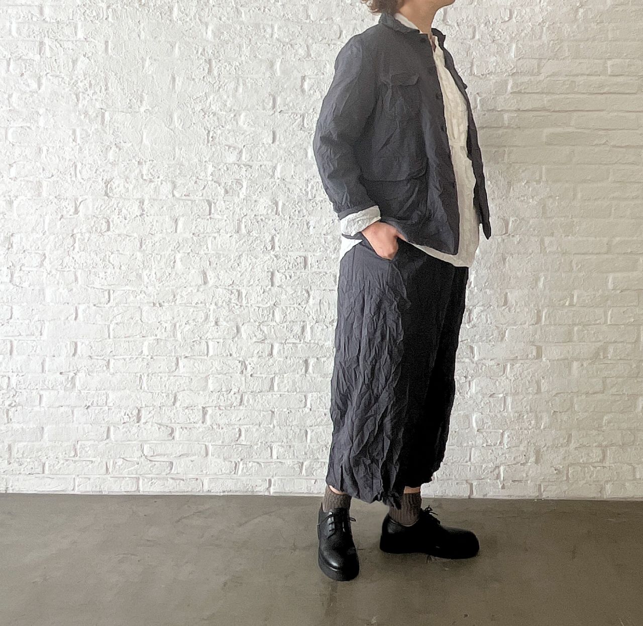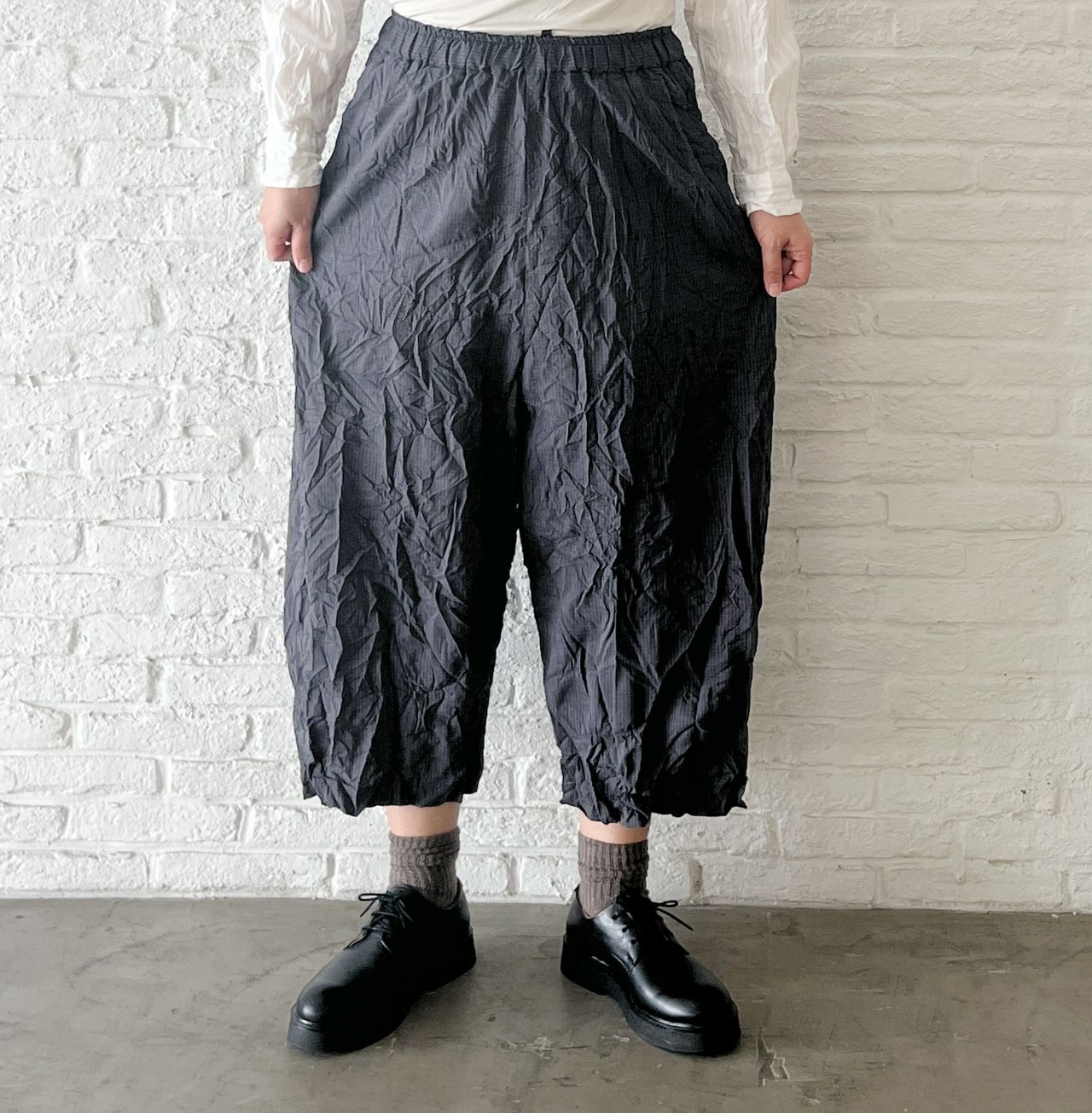 股上深めのサルエルパンツにしわ加工を入れて表情感を出しました。