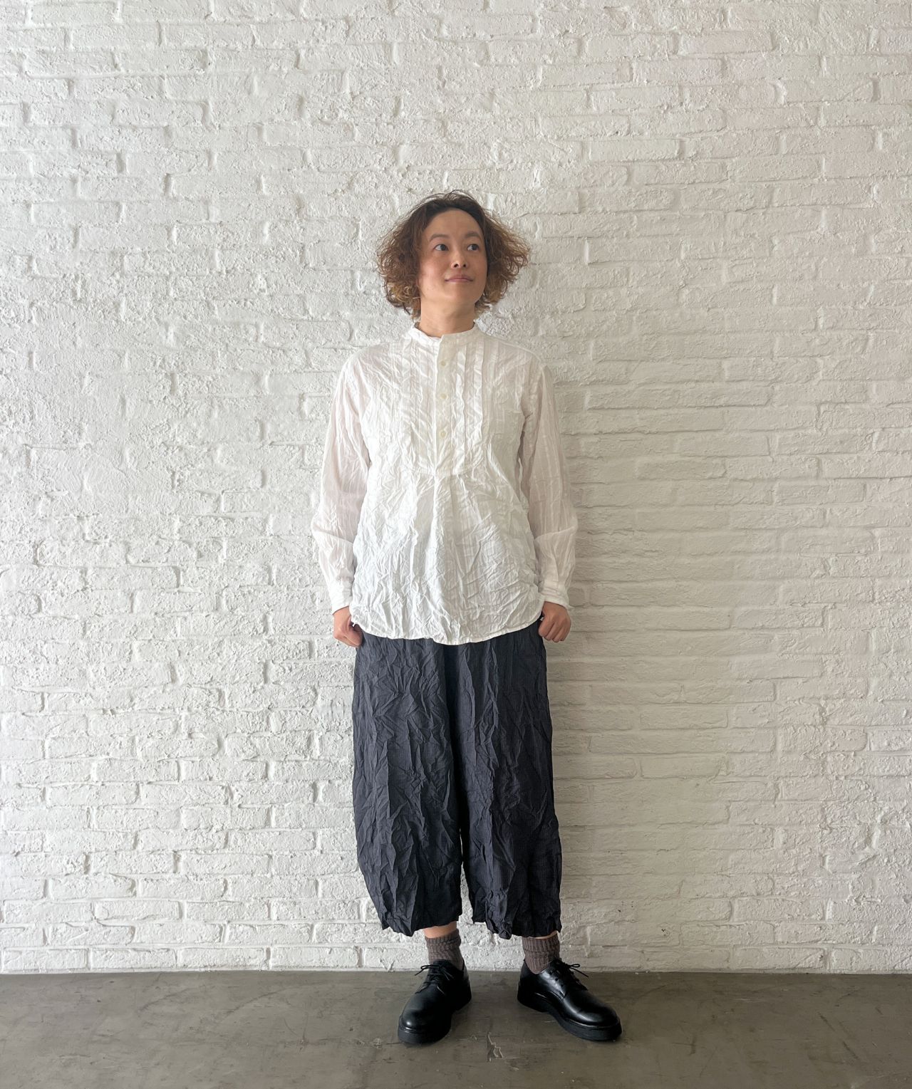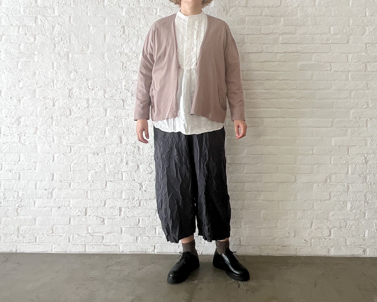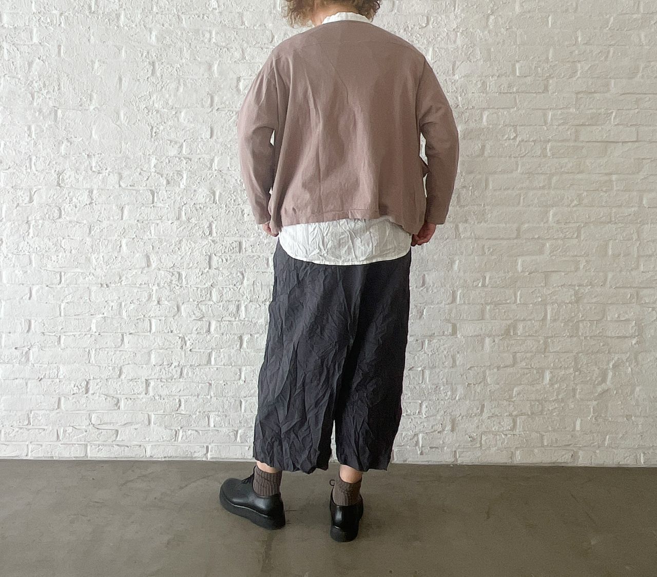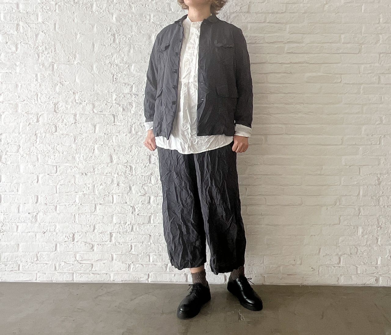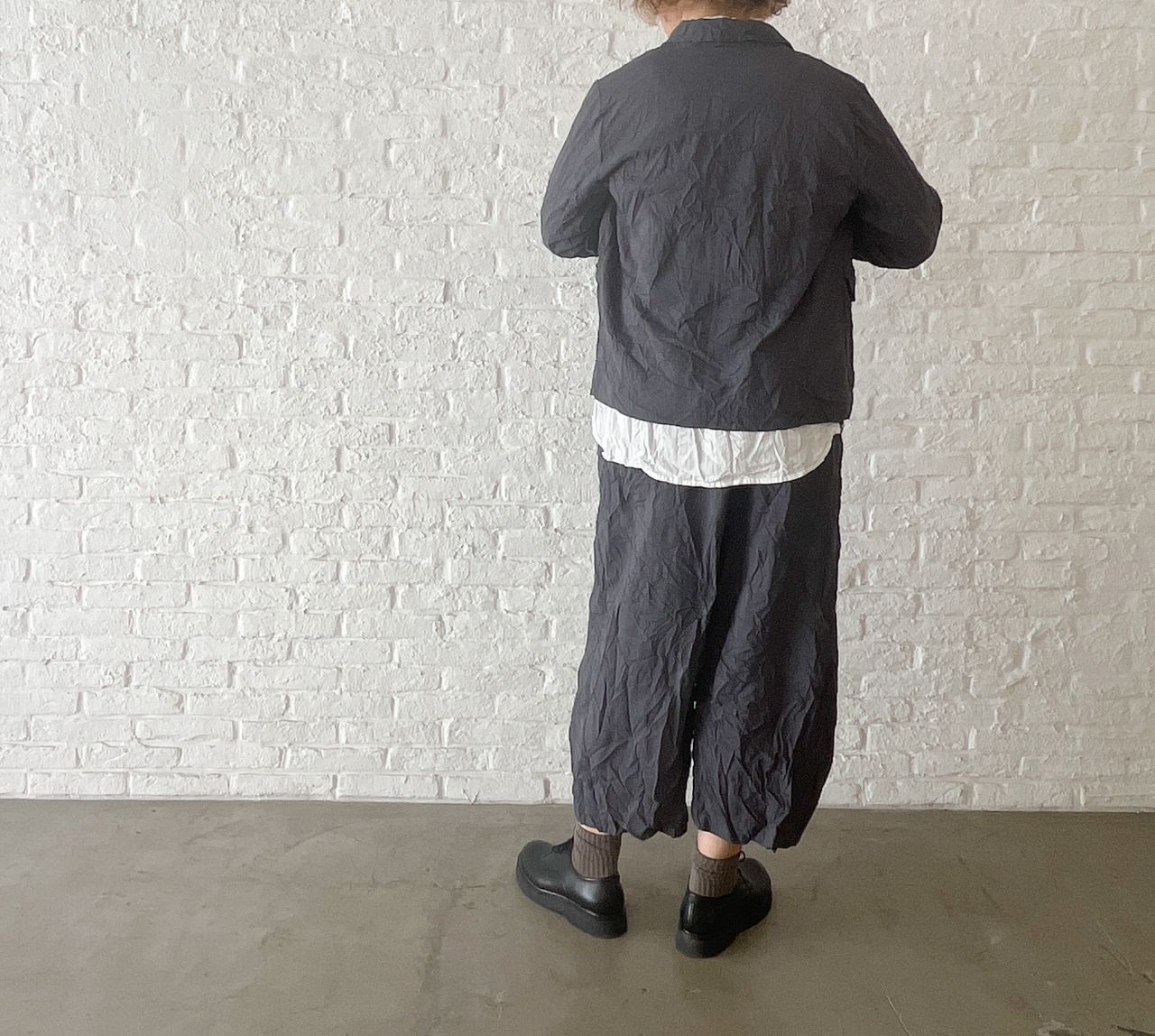 股上深めのサルエルパンツにしわ加工を入れて表情感を出しました。