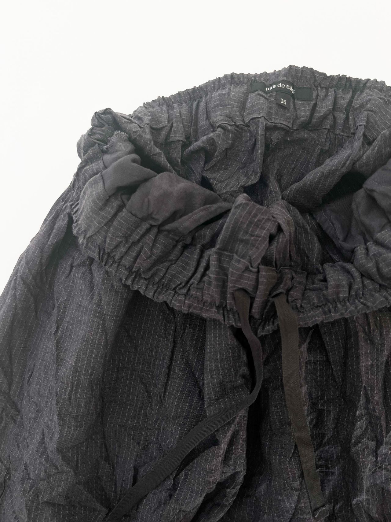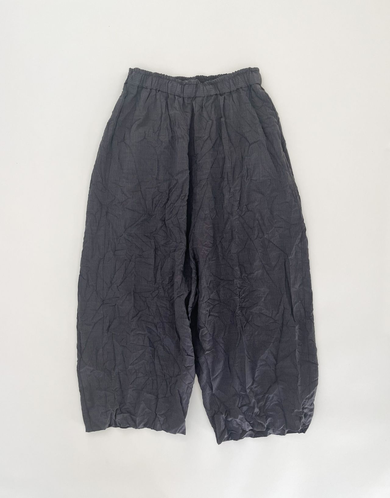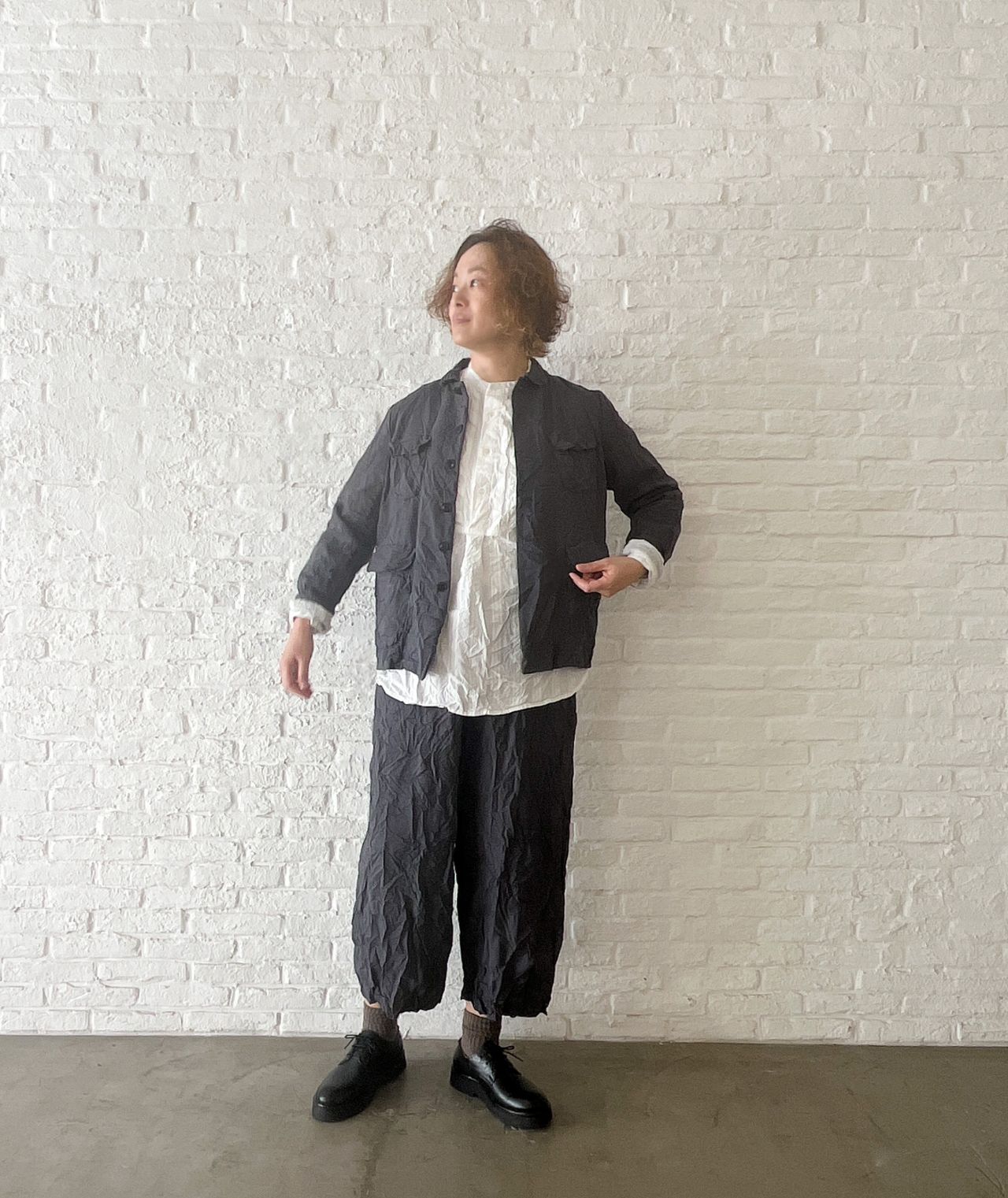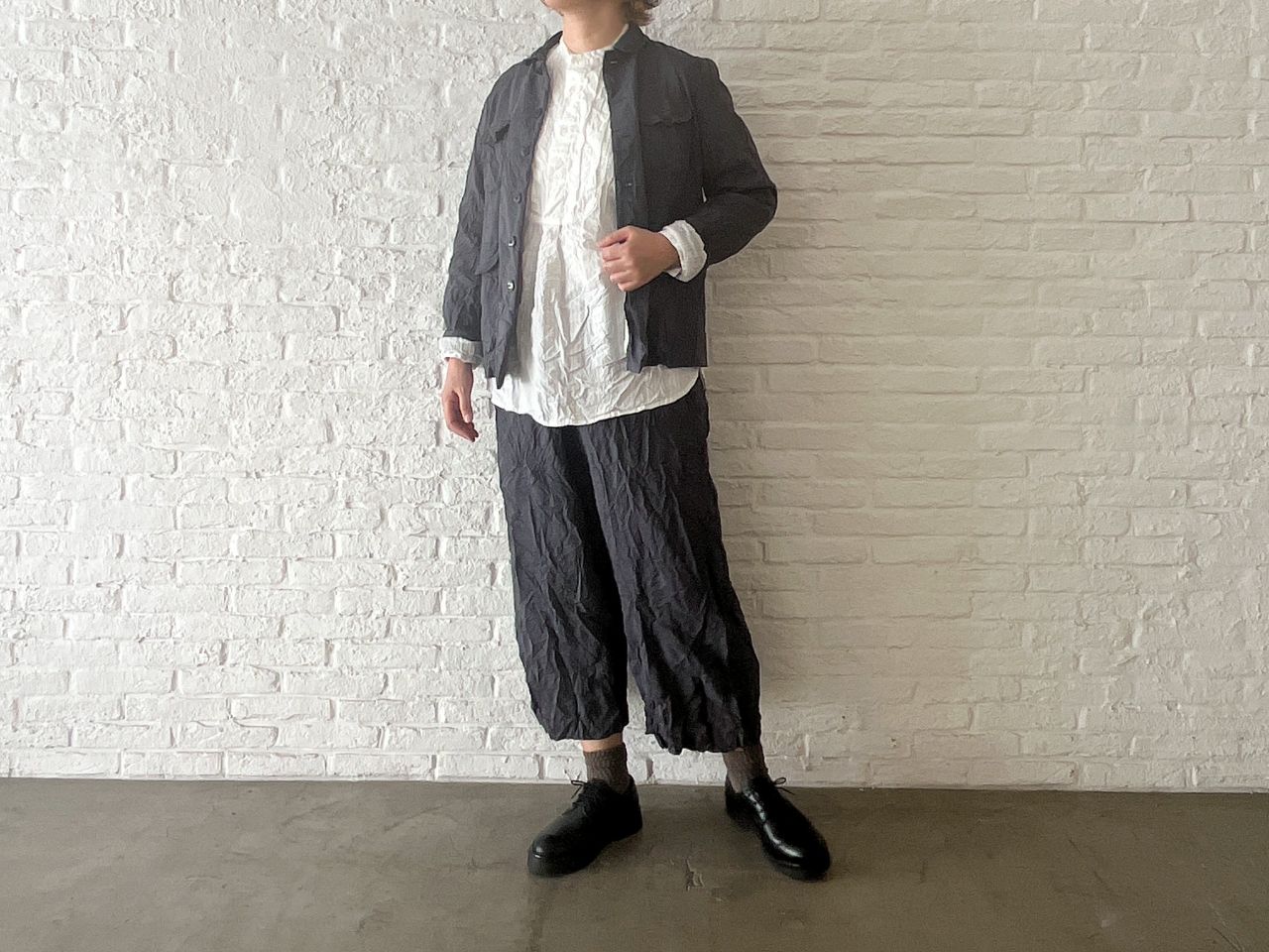 股上深めのサルエルパンツにしわ加工を入れて表情感を出しました。