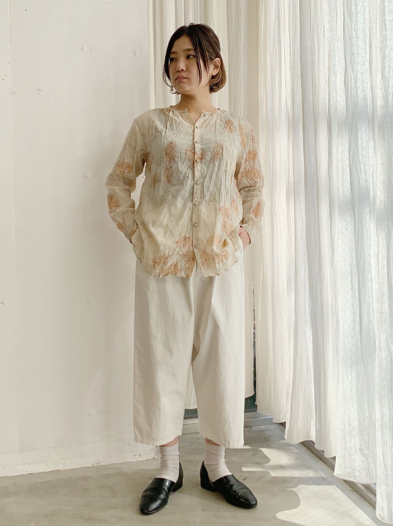 今日は土曜日のブログに続き、もう一つの襟なしタイプの彼岸花プリントブラウスの着回しをご紹介したいと思います。