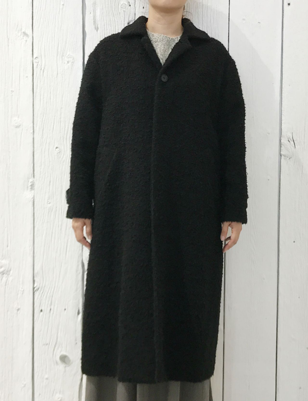 オリジナルのファーモール糸で織ったツイード生地で、モコモコした生地がかわいいコートです。