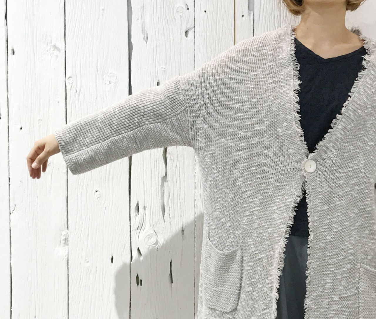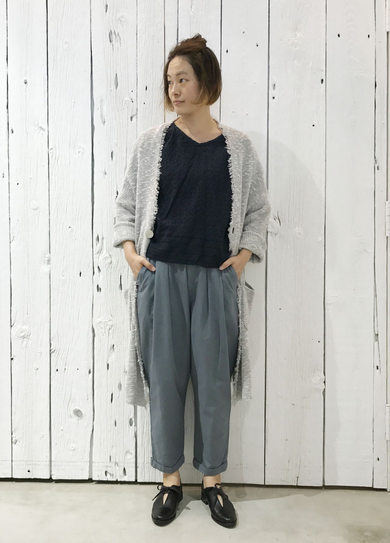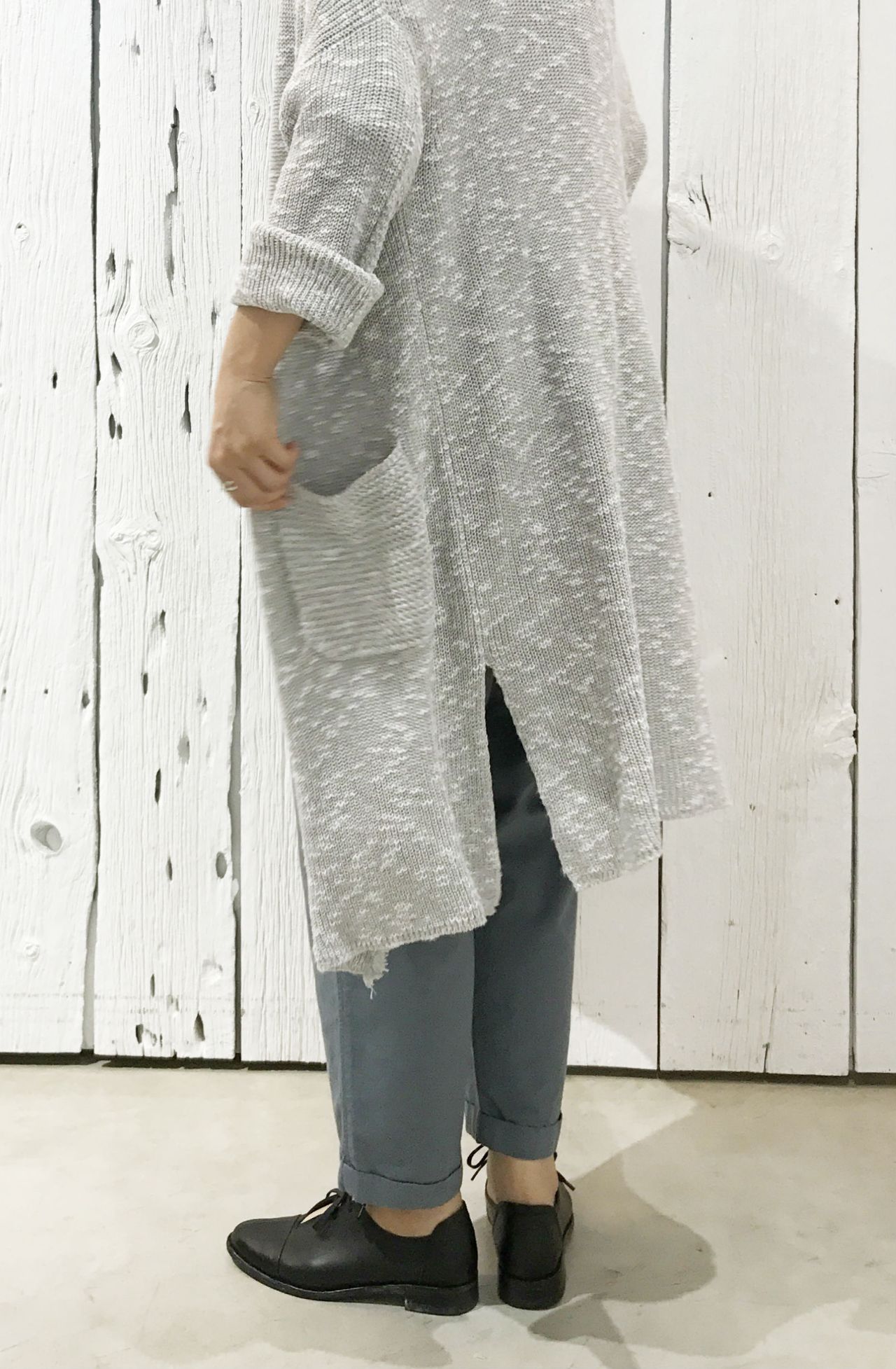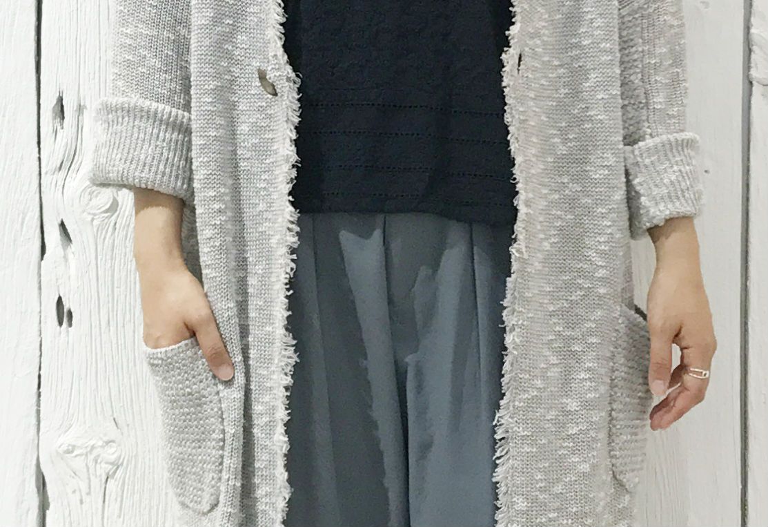 カジュアル感を意識して、ライトグレーのニットカーディガン。