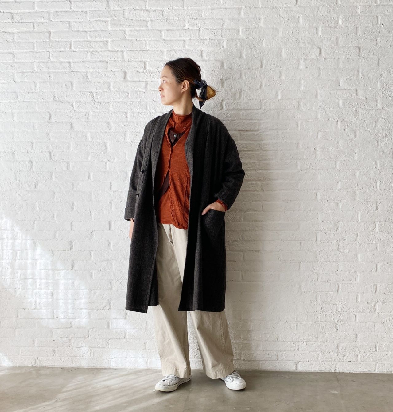 オレンジ と相性の良い、落ち着いたブラウンのアウターで、オレンジを差し色に。