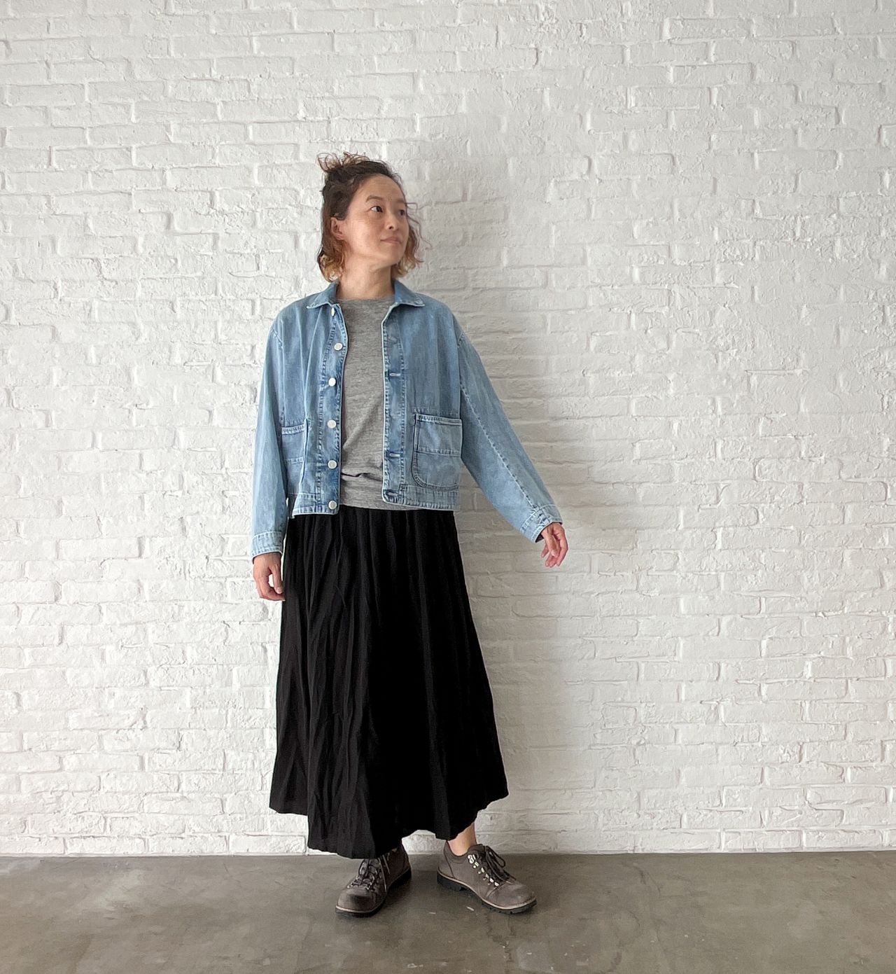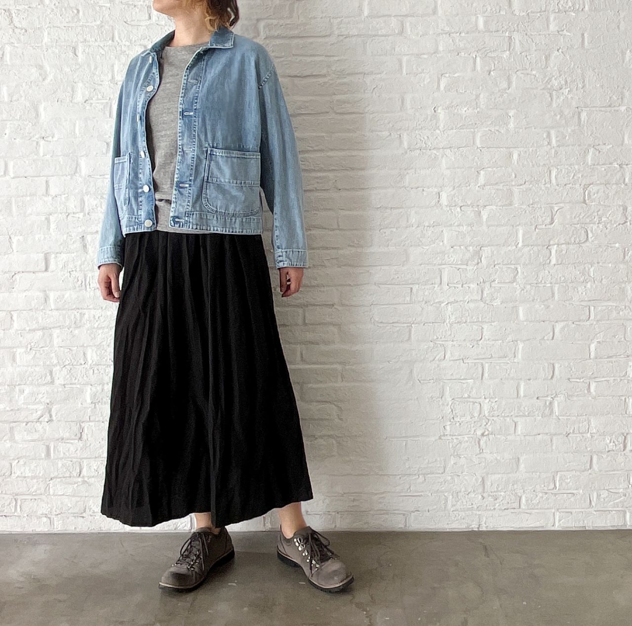 メリハリがつきすぎないで馴染むグレーのカットソーは、肌寒い時期のインナーにおすすめです。