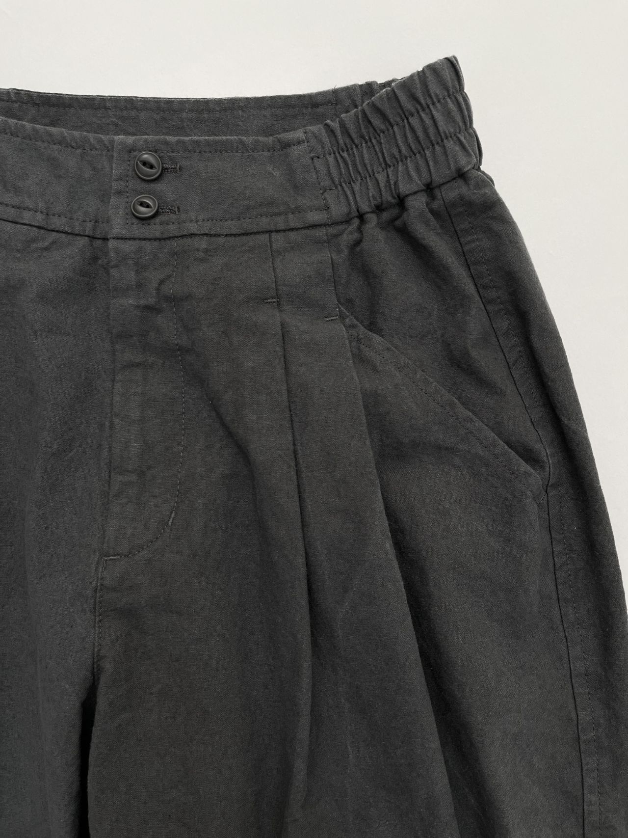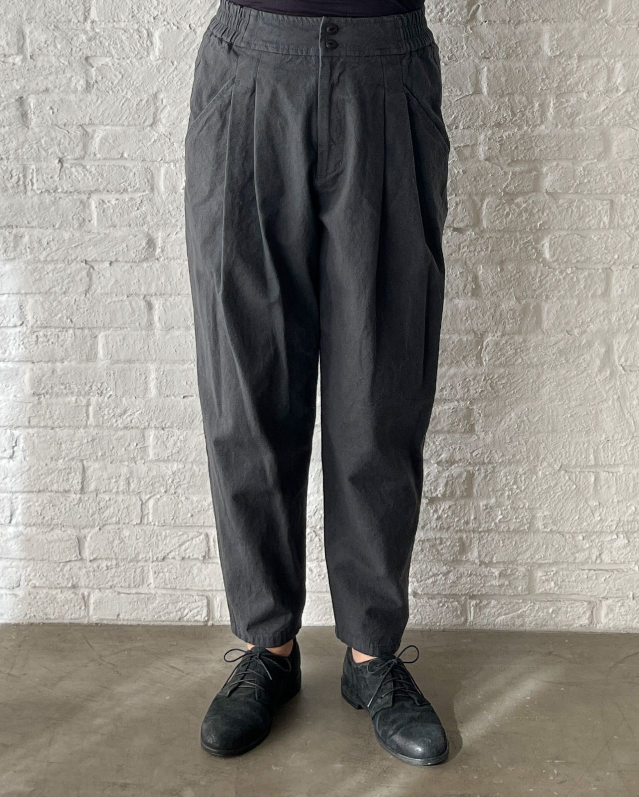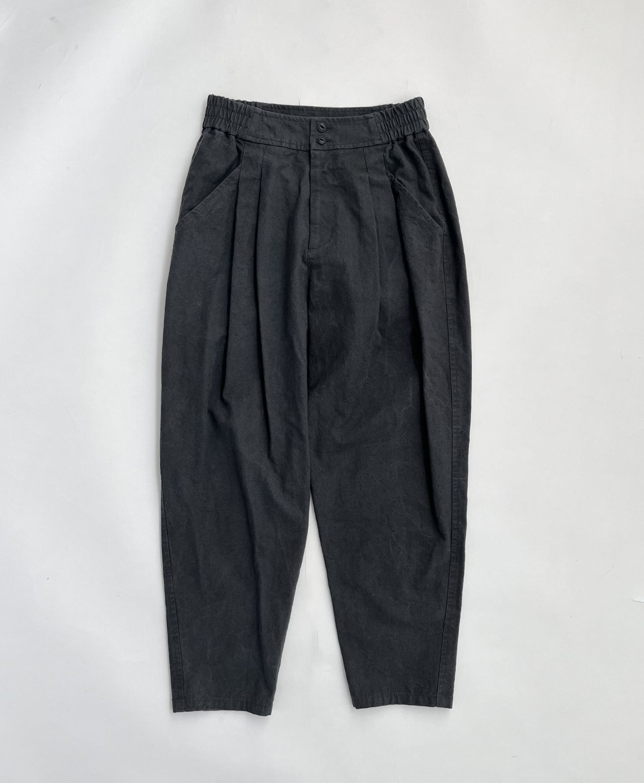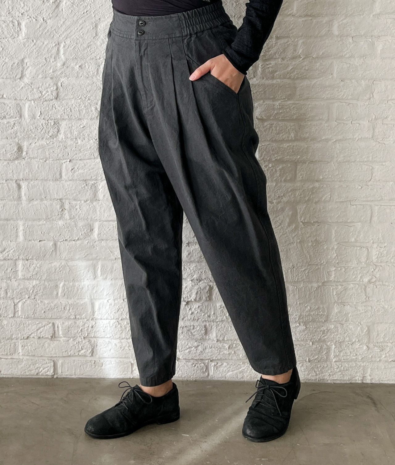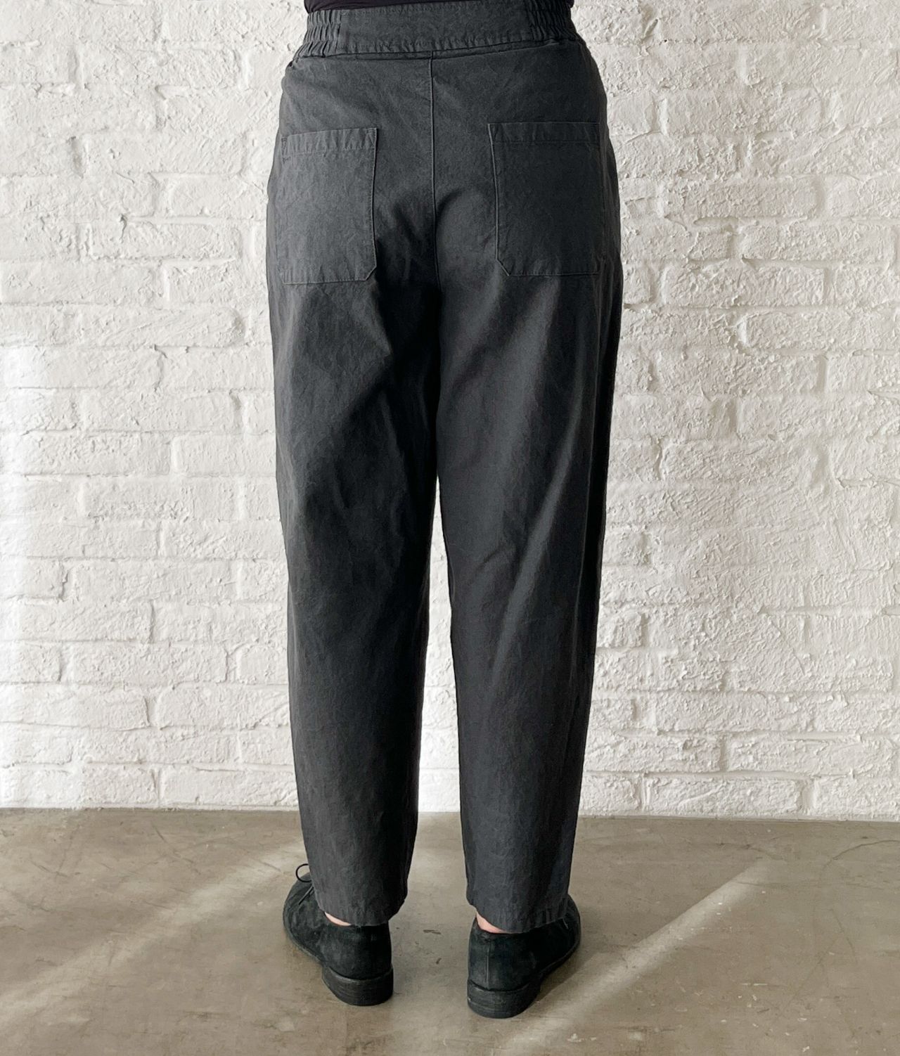 腰回りはゆったり~裾が細くなったテーパードシルエット。