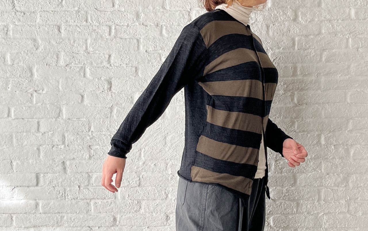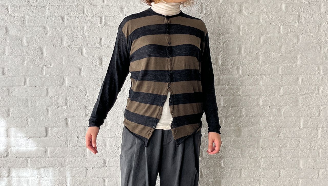 前身頃がボーダー柄で、袖や後身頃は無地の丸首カーディガン。
