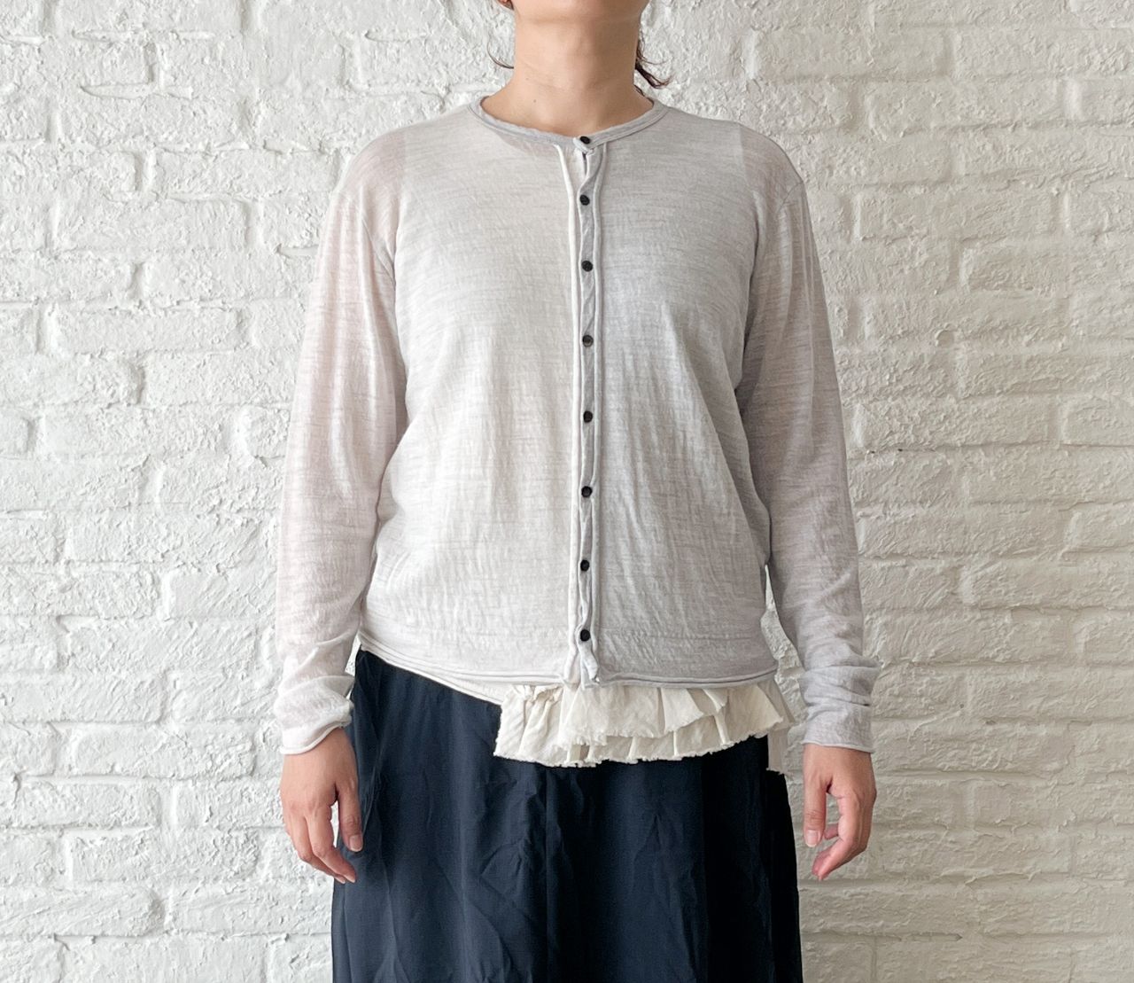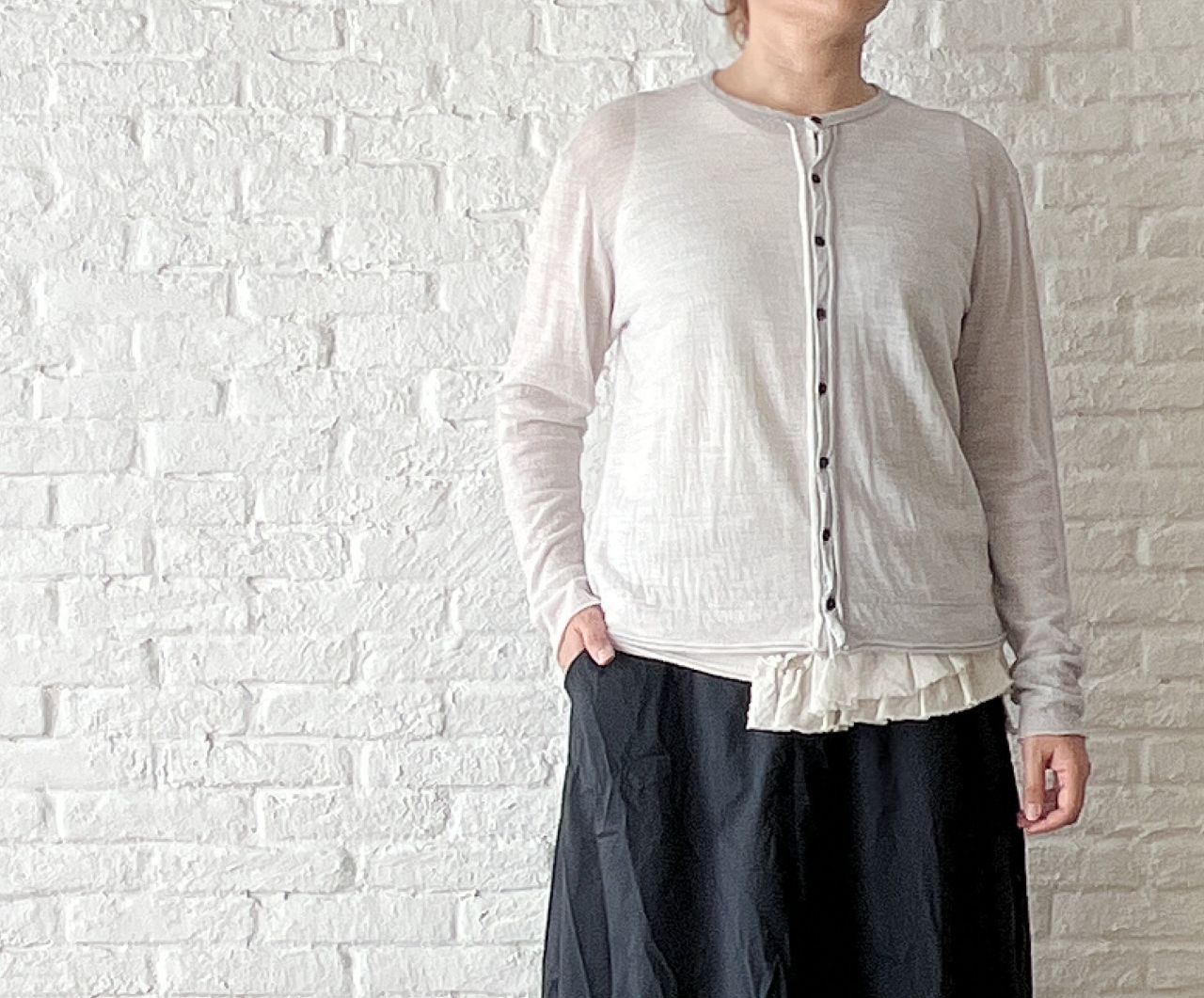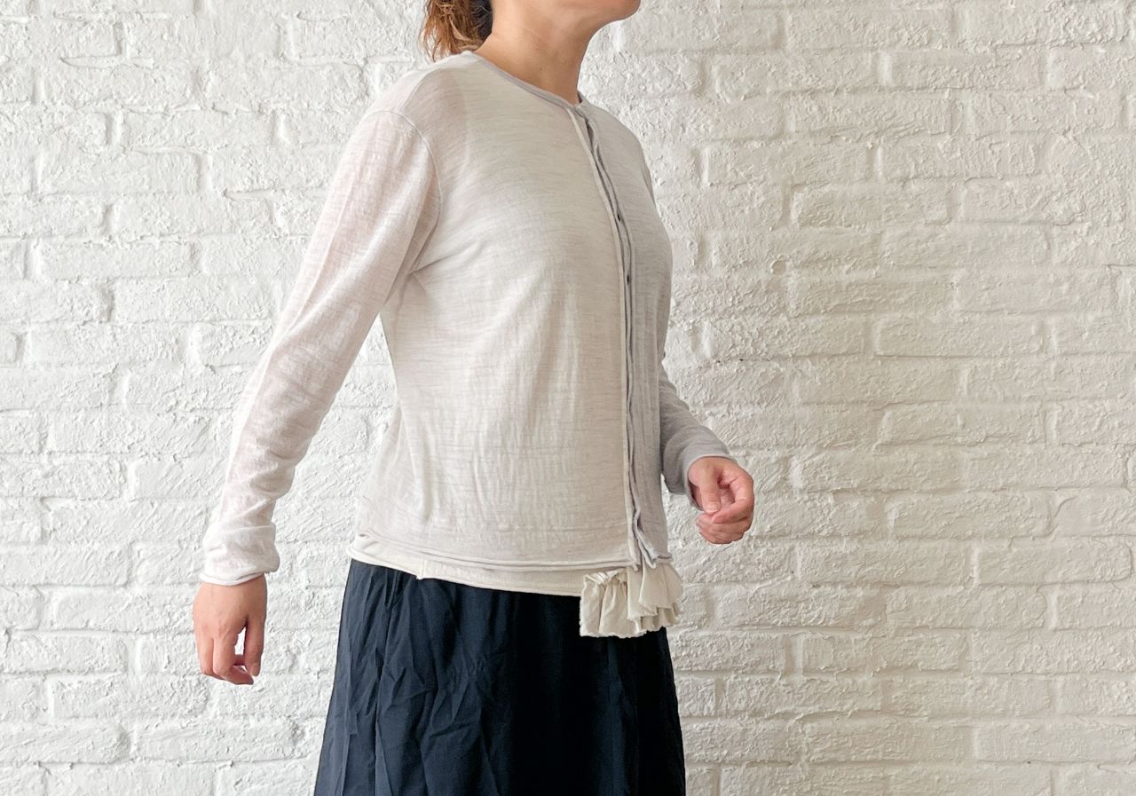 左右で色を切り替えた、ウールガーゼ素材のカーディガン。