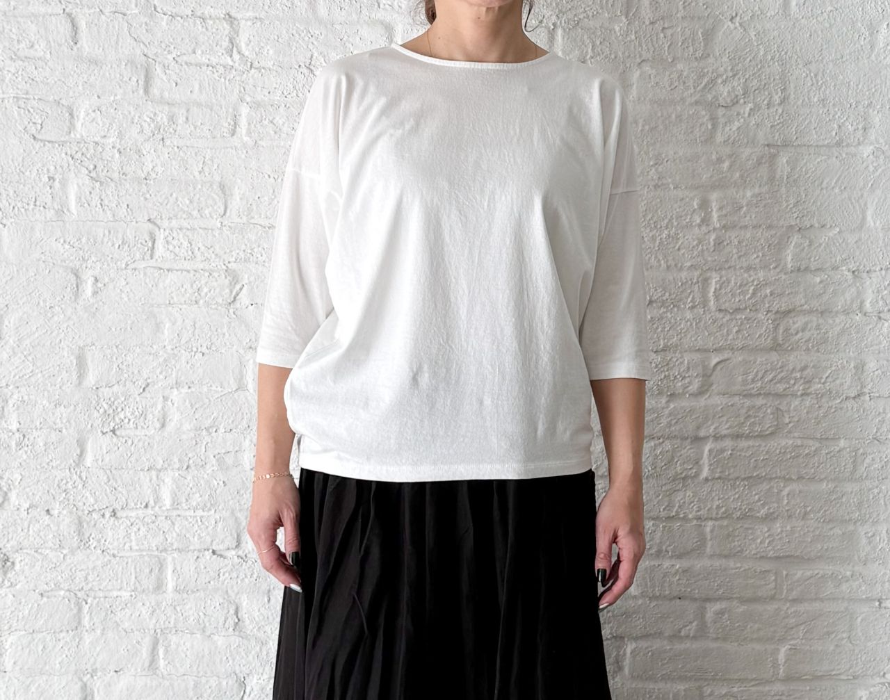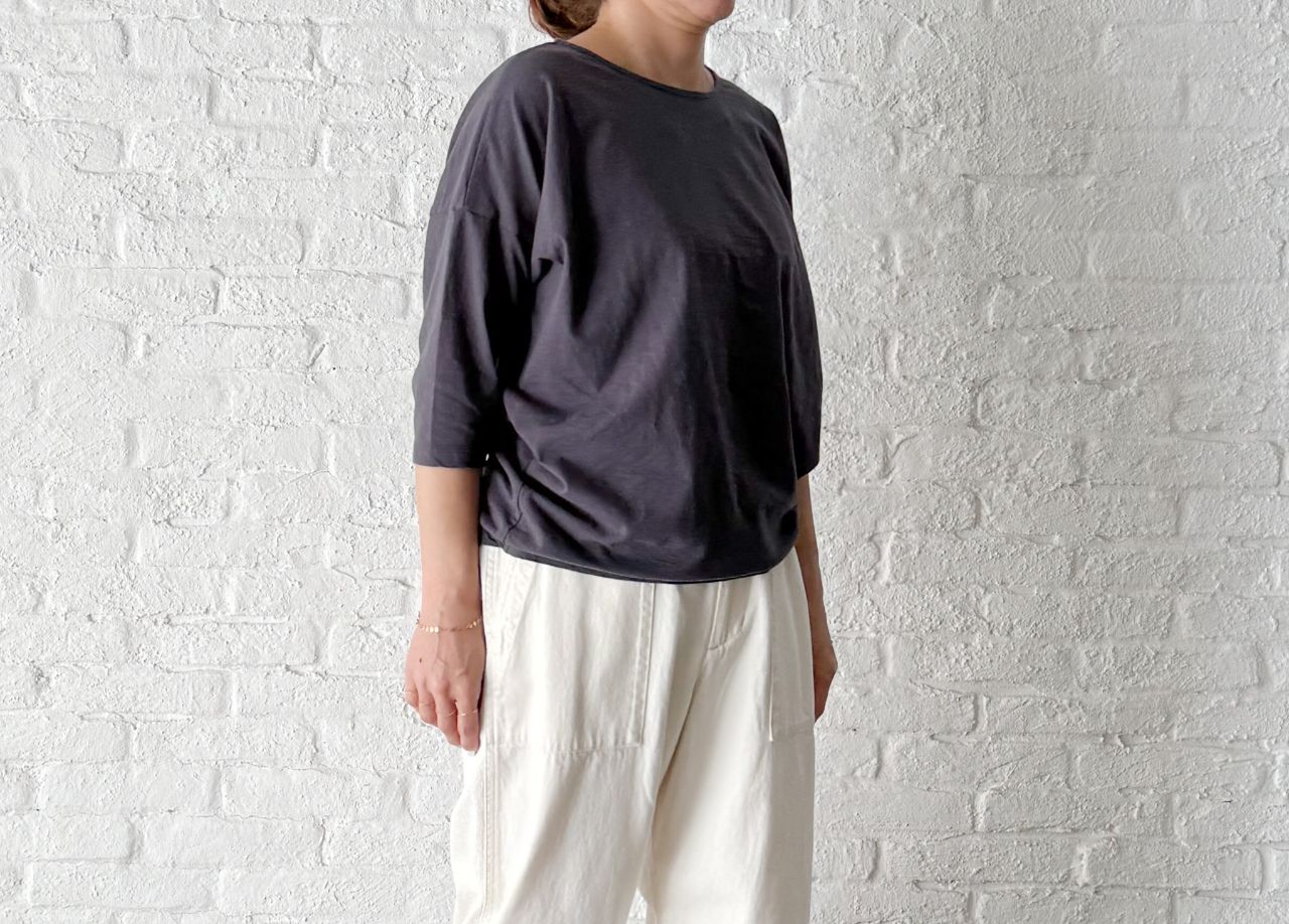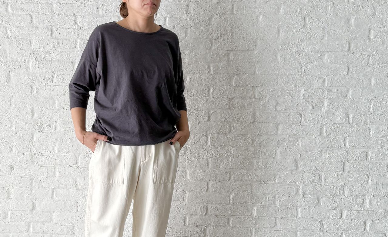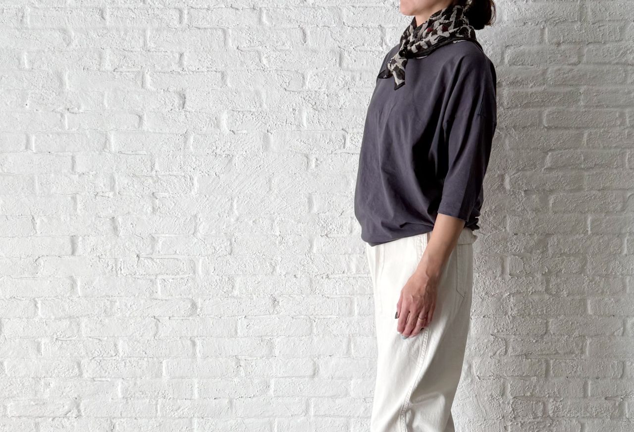 バスト周りがゆったりして裾に向かって少しづつ細めになるようなシルエットです。