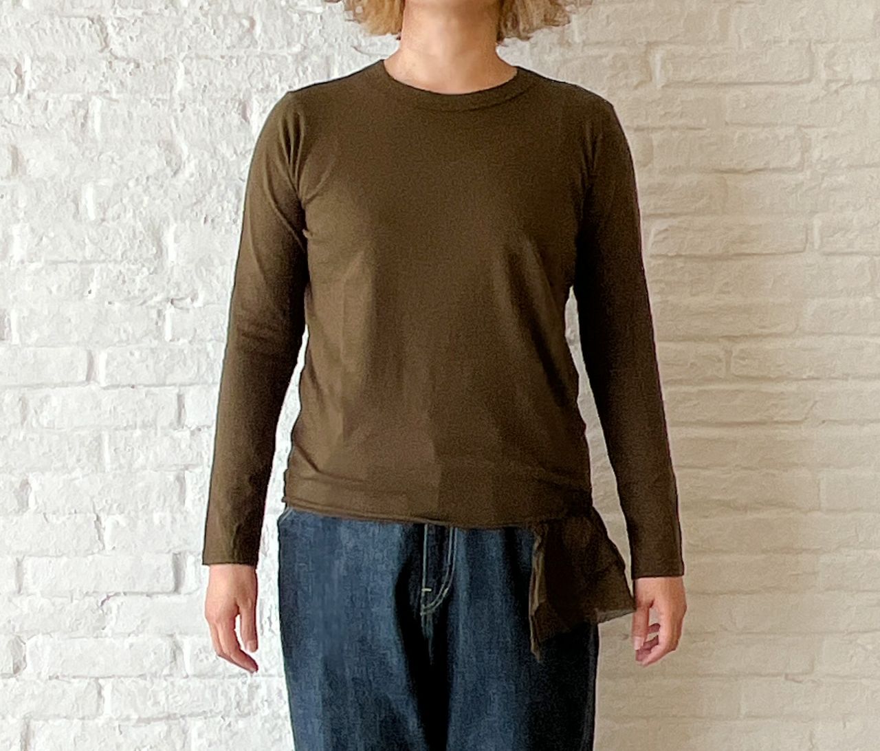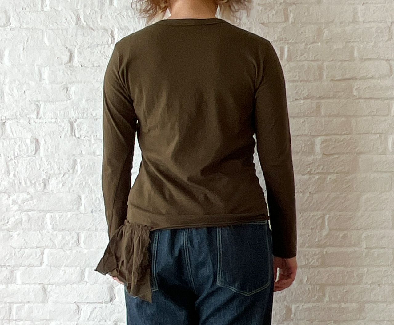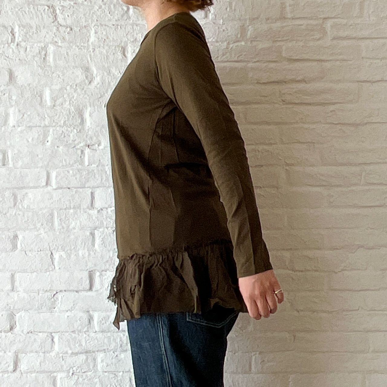 着ることにより両サイドのゆとり分が落ちて、両サイドが長くなります。