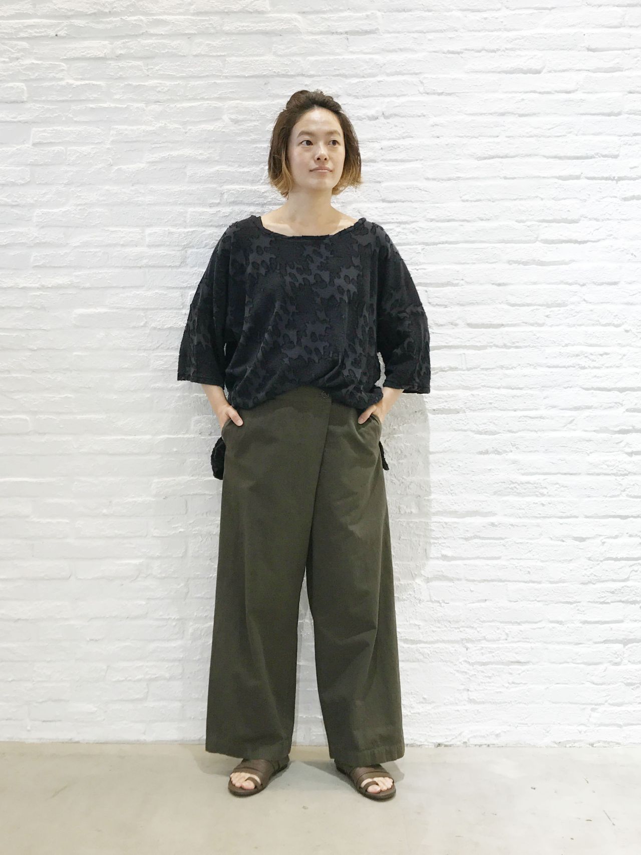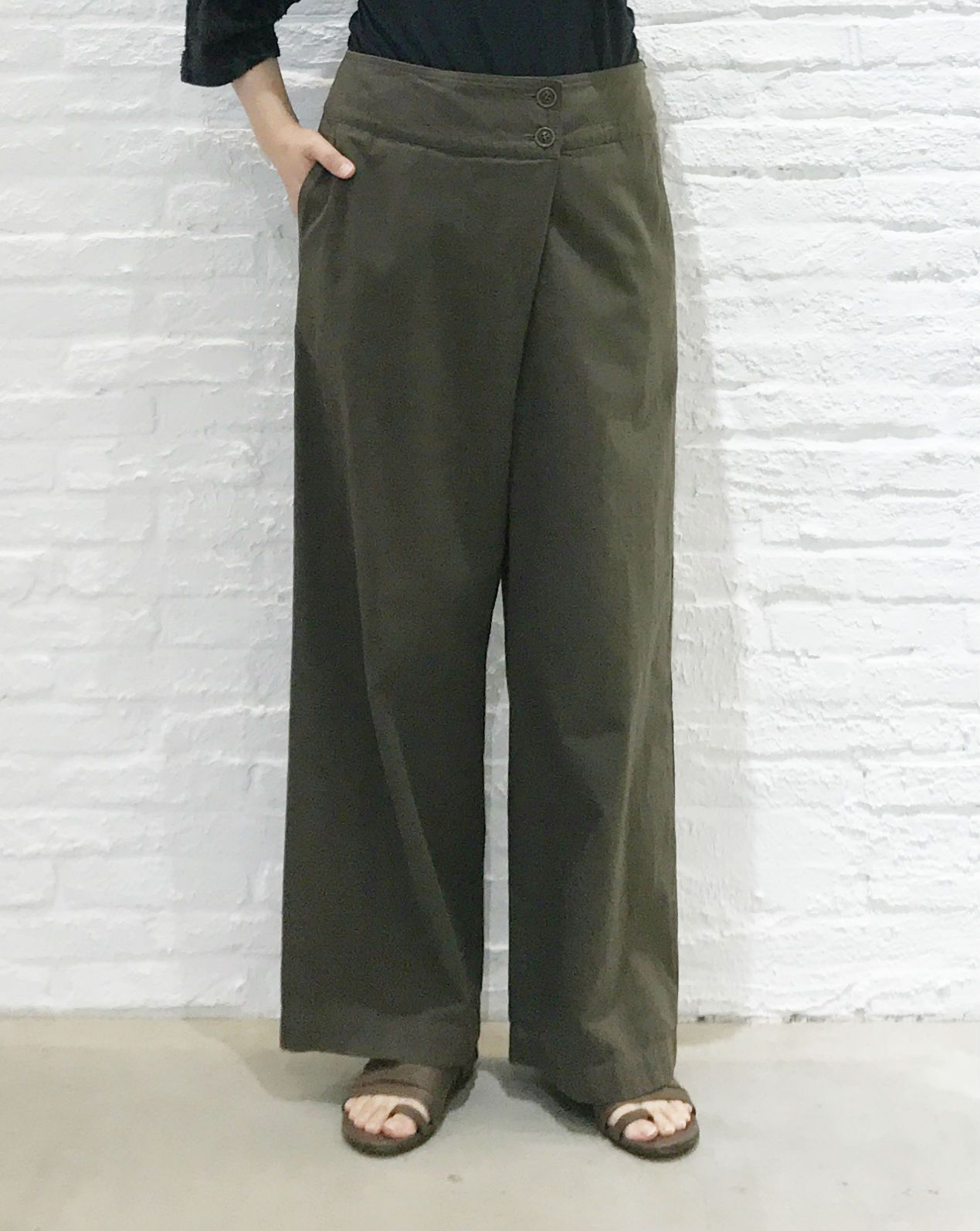カーキのワイドパンツで暗い色合わせでも