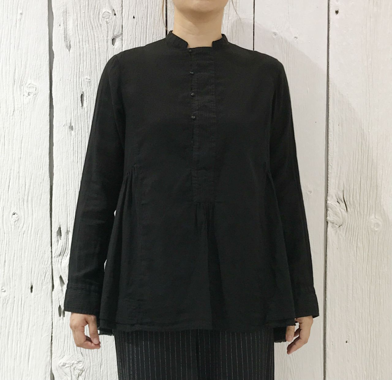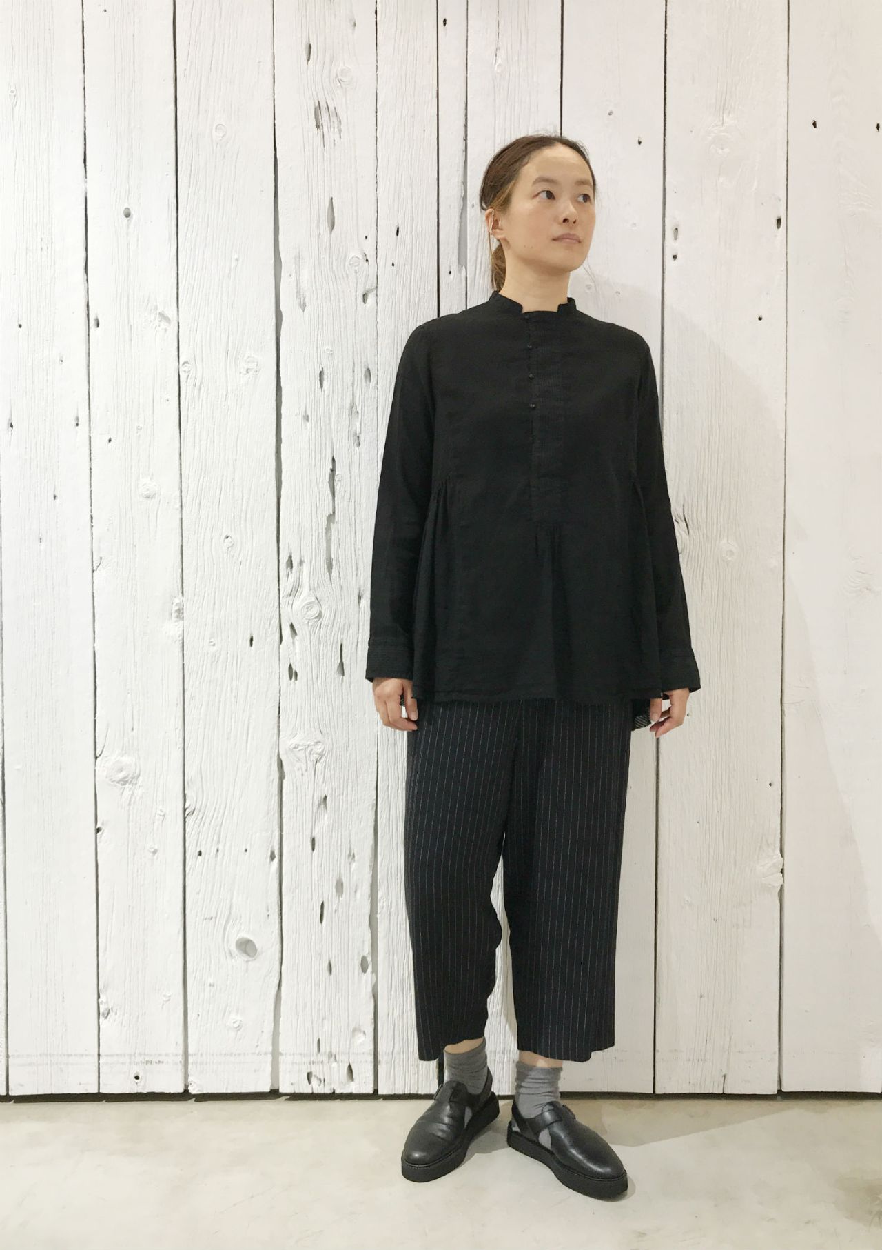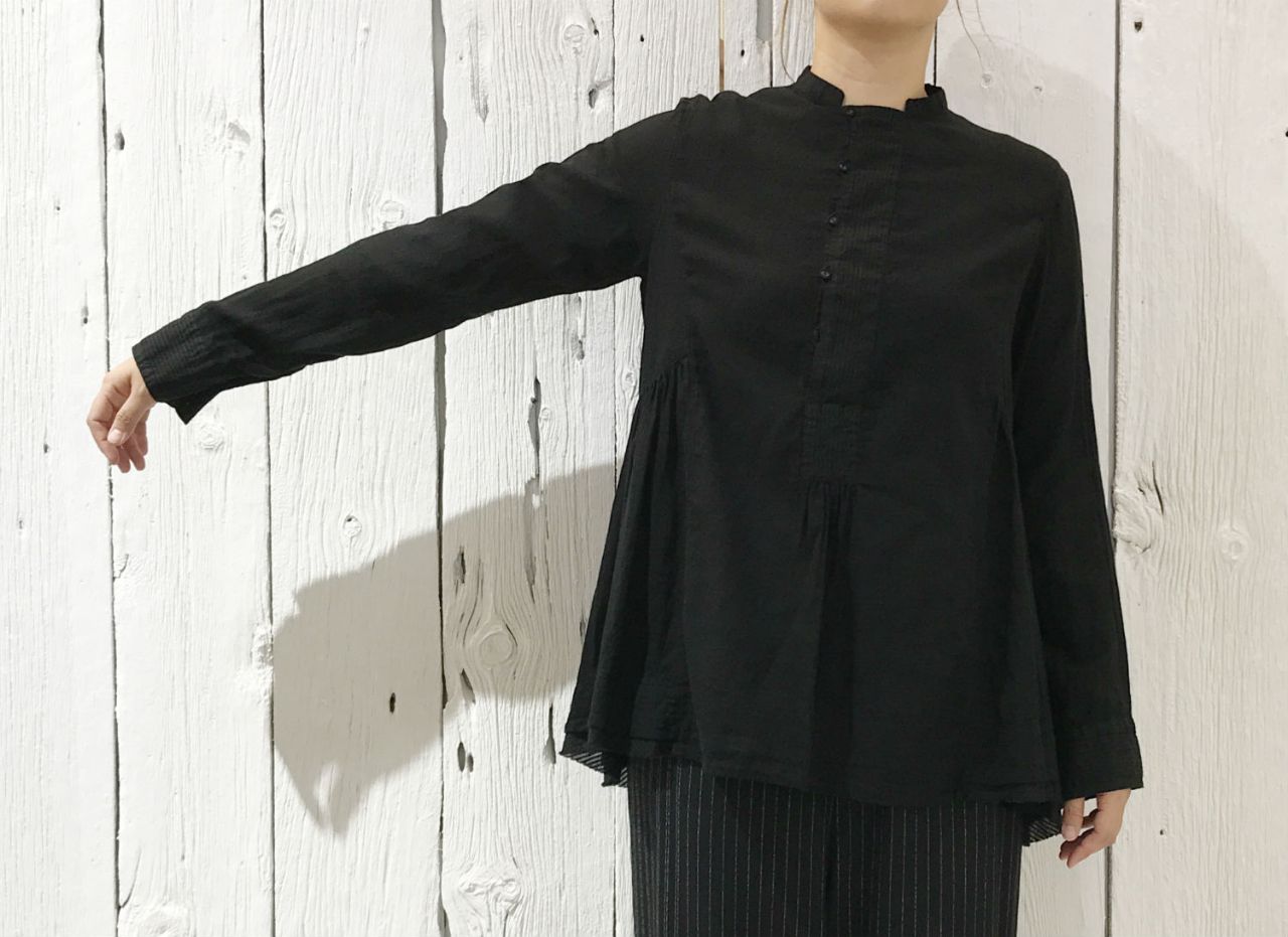 小さなスタンドカラーのブラウスは、両脇にギャザーが入って少し広がるシルエット。