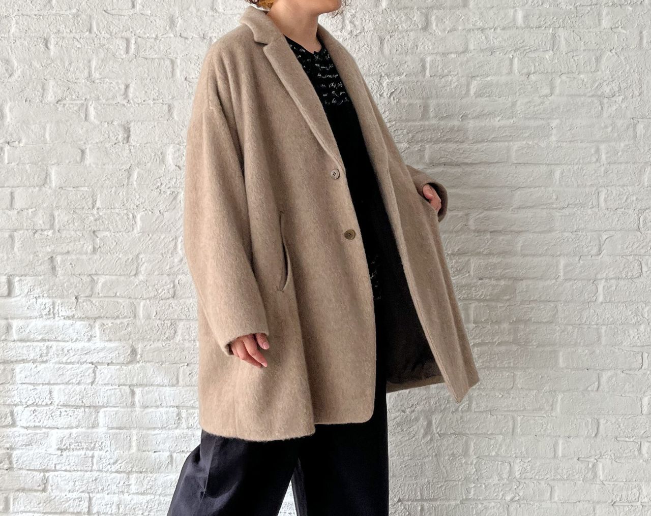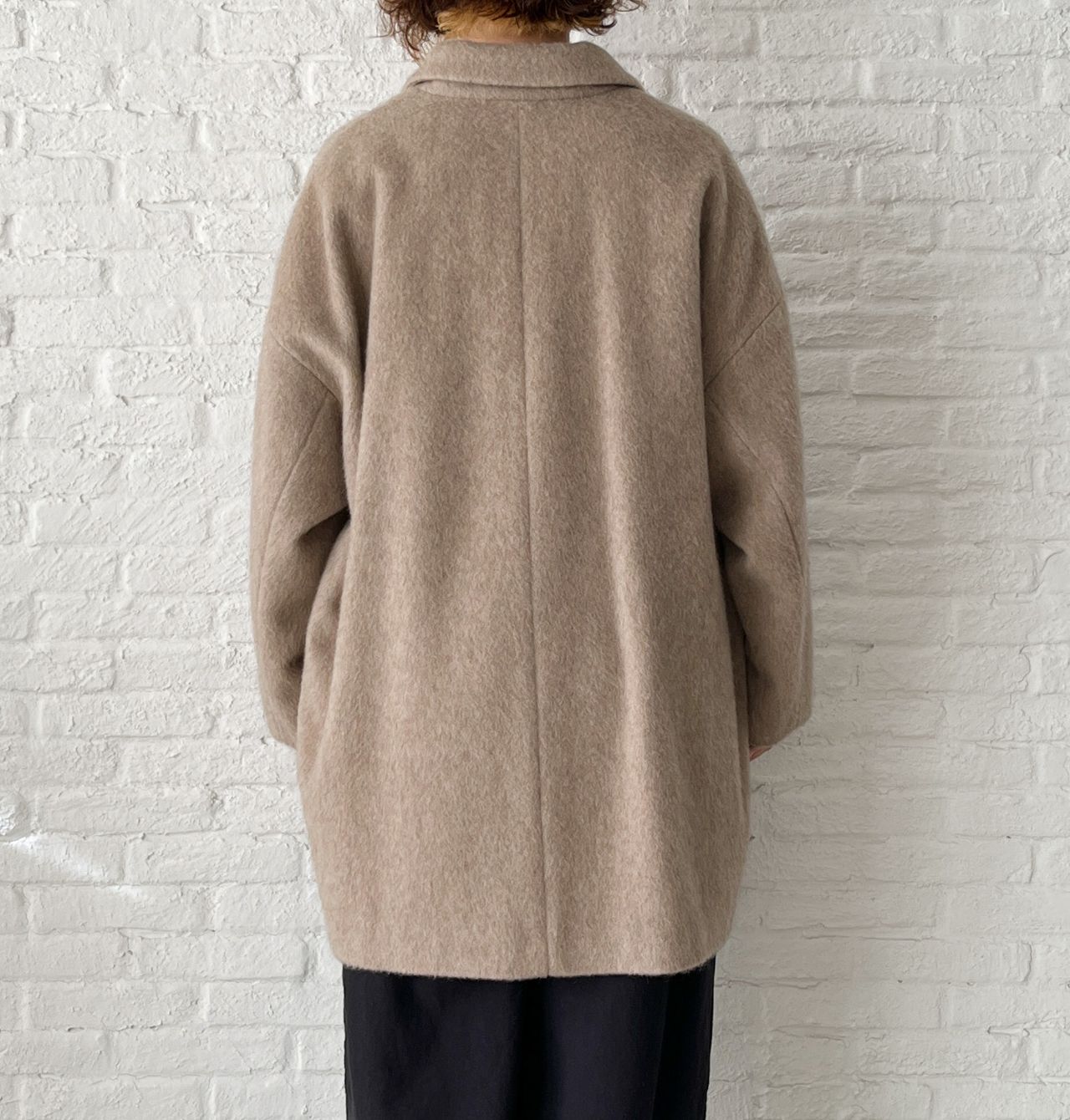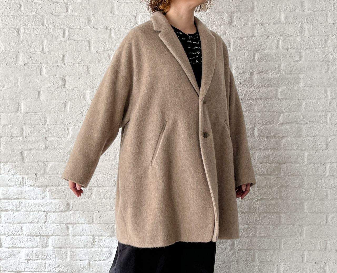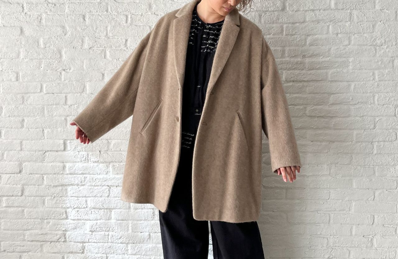 全体的にゆったり。釦はあえて下の方につけた包み込まれるようなシルエットです。