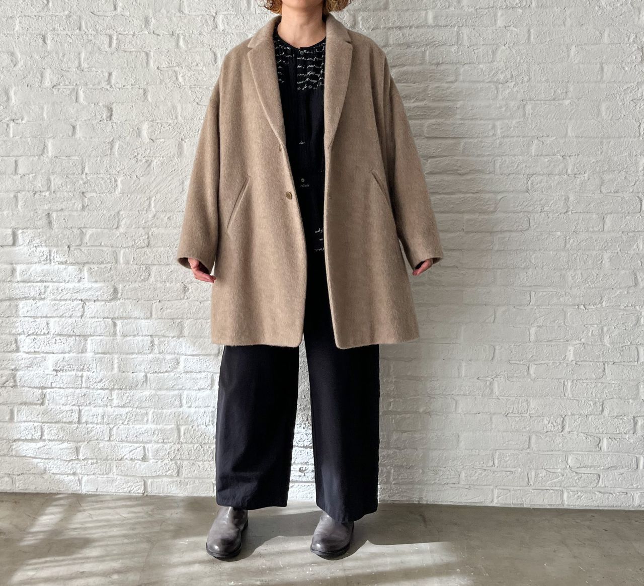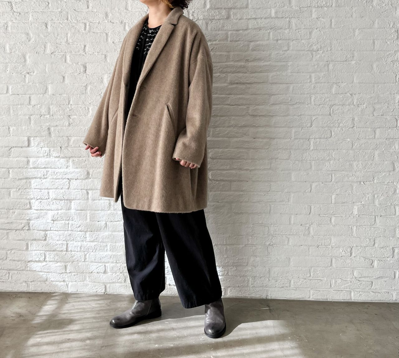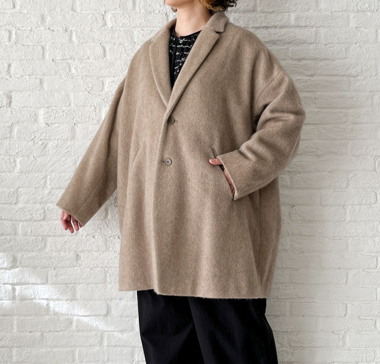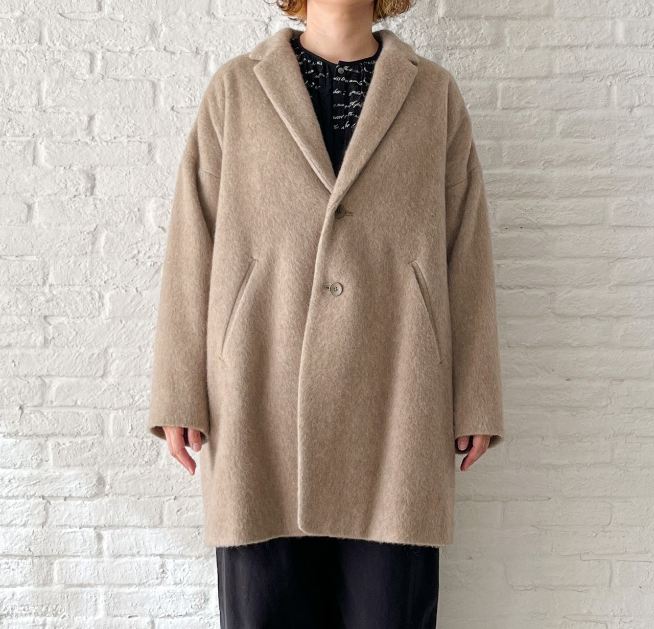 全体的にゆったり。釦はあえて下の方につけた包み込まれるようなシルエットです。
