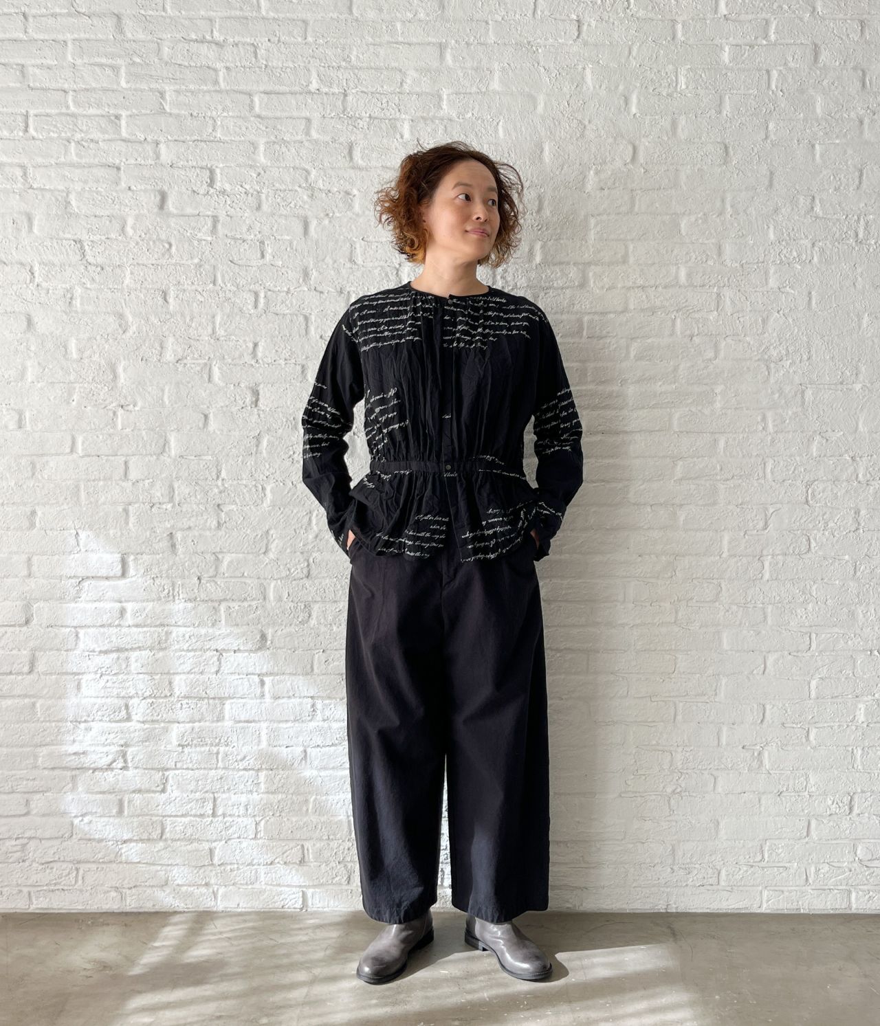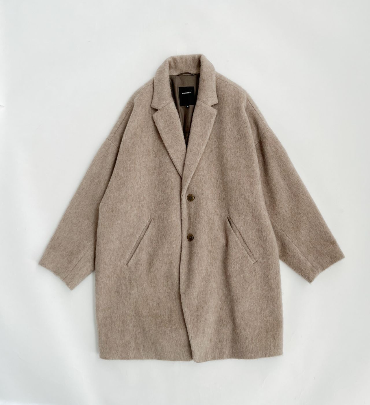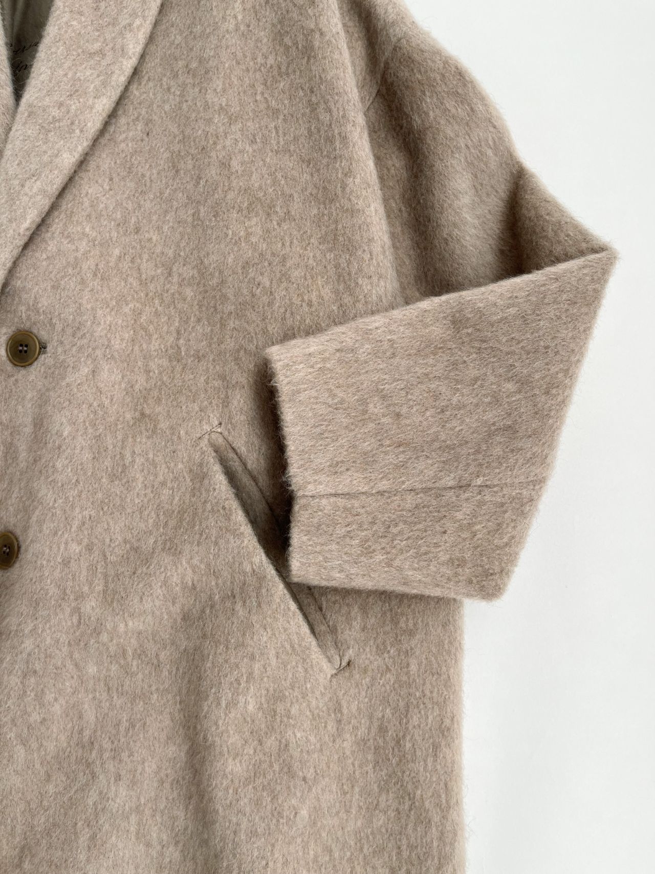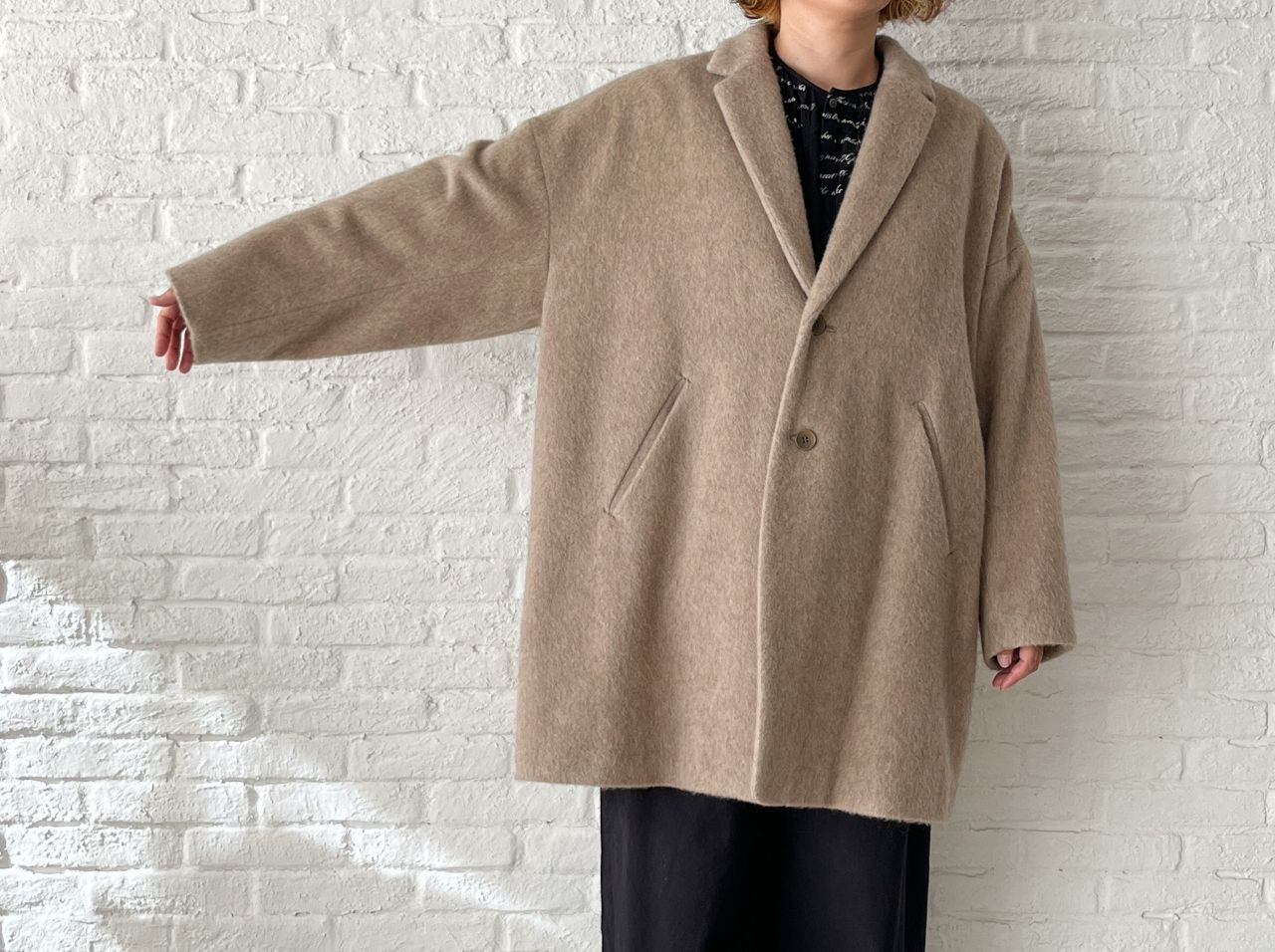 全体的にゆったり。釦はあえて下の方につけた包み込まれるようなシルエットです。