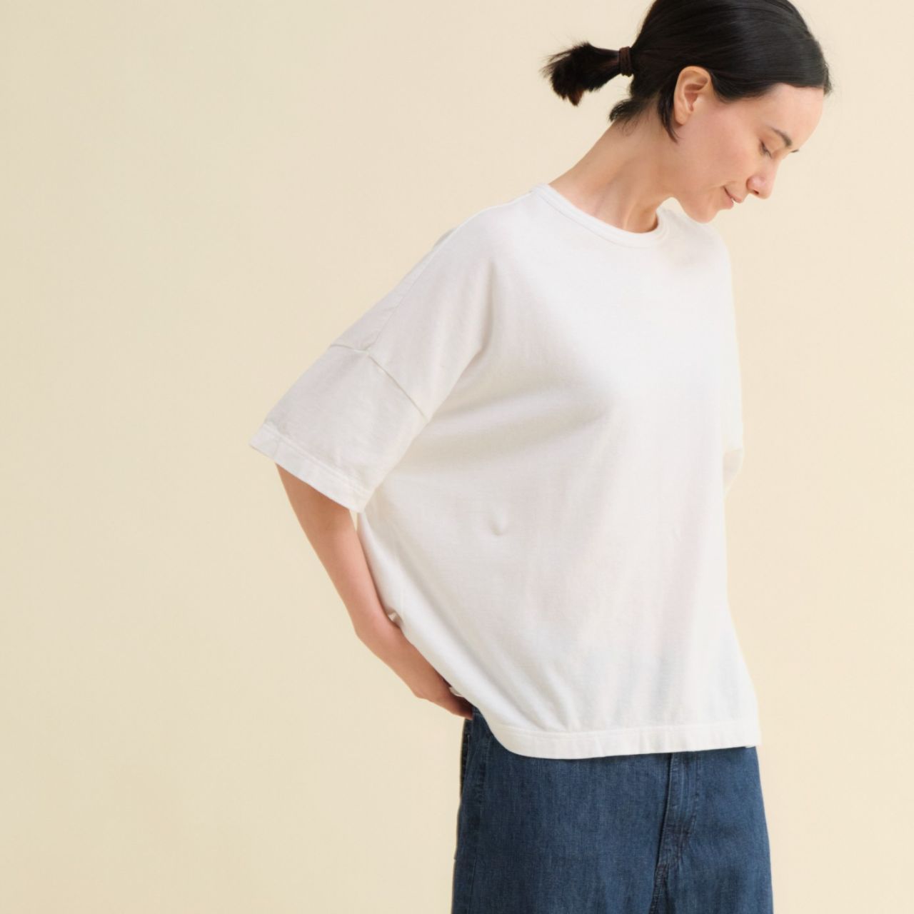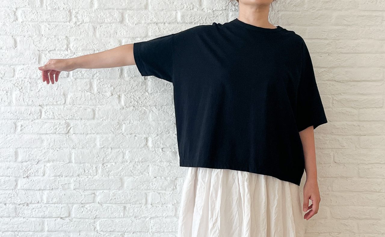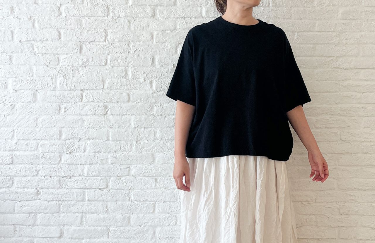 人気のゆったりTシャツで、首元がリブ仕様に。