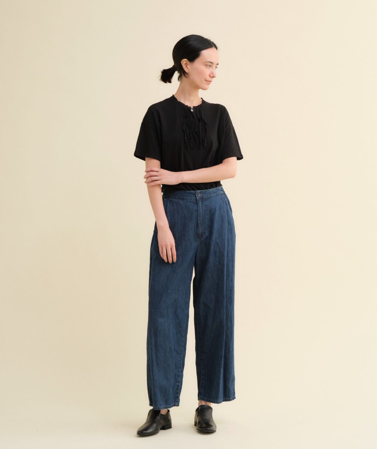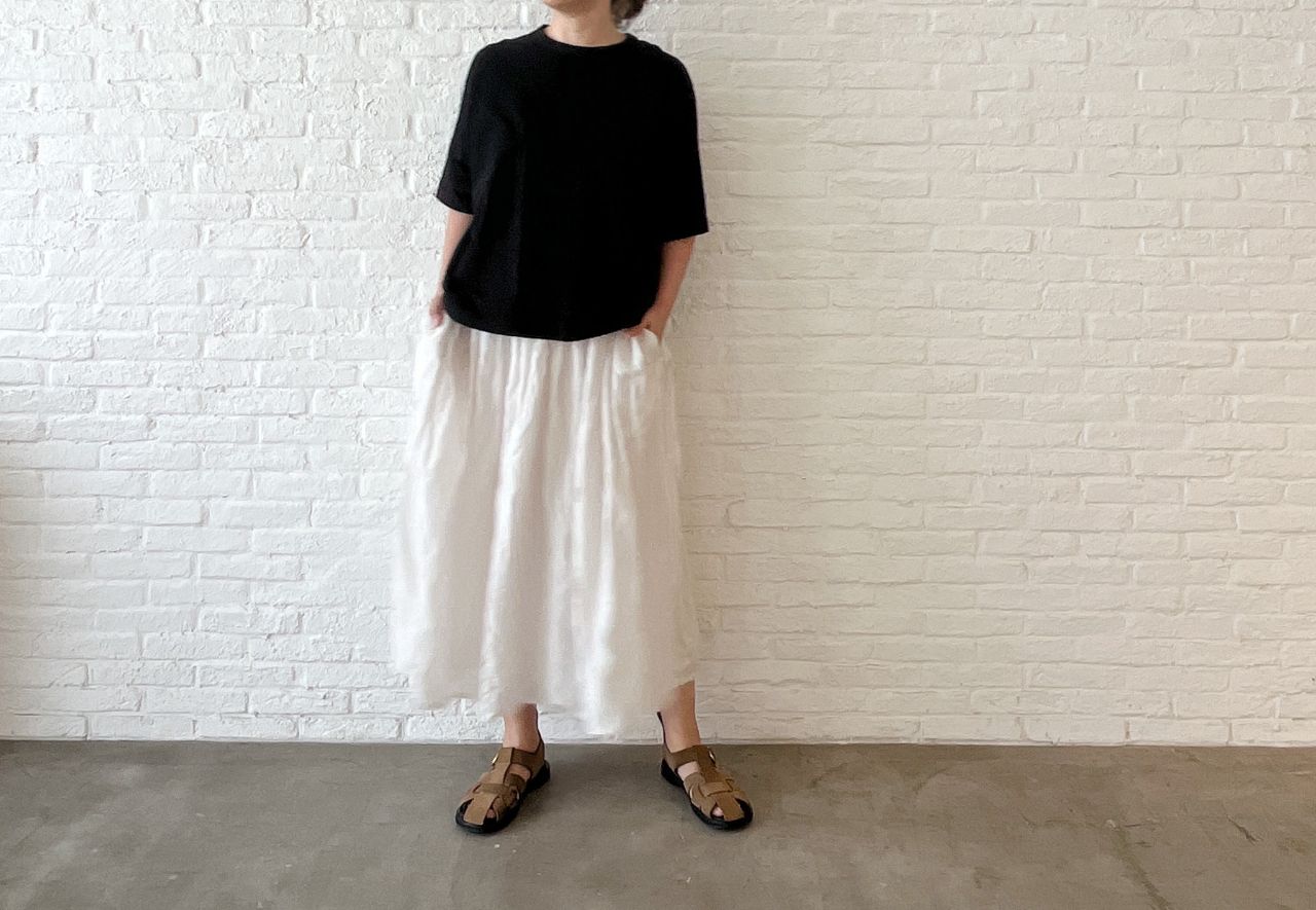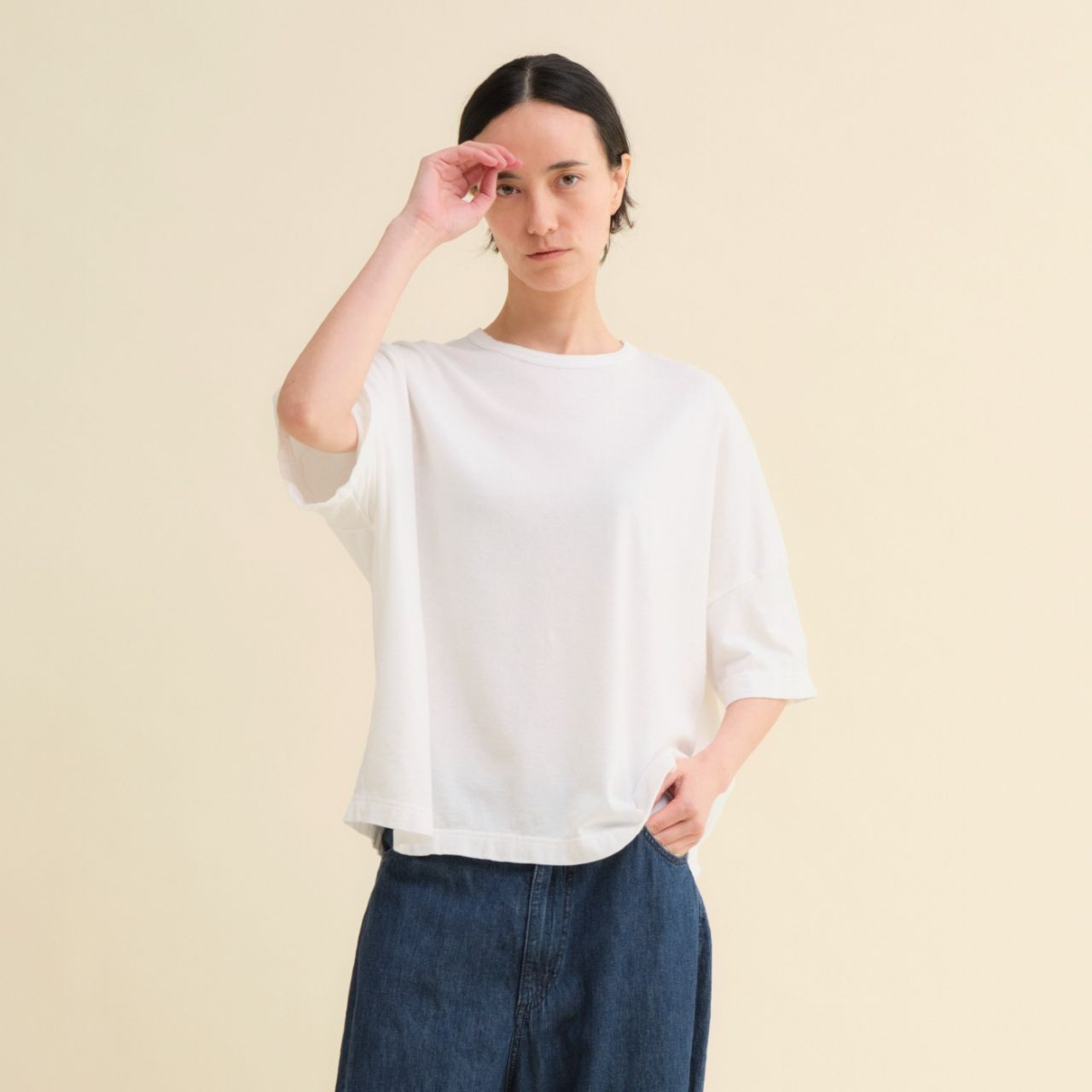 人気のゆったりTシャツで、首元がリブ仕様に。