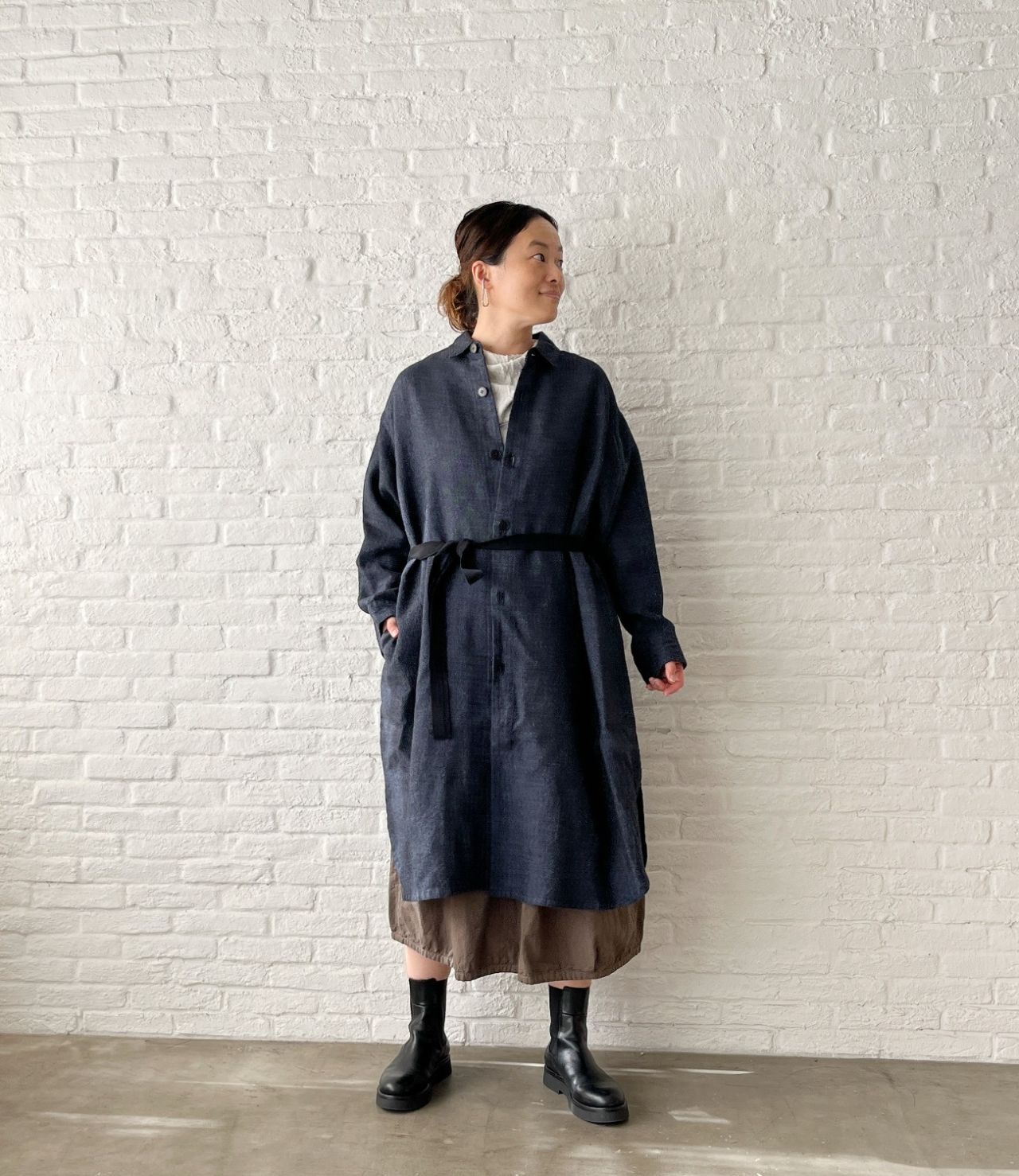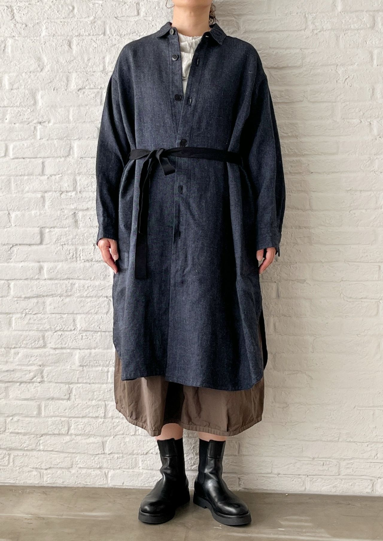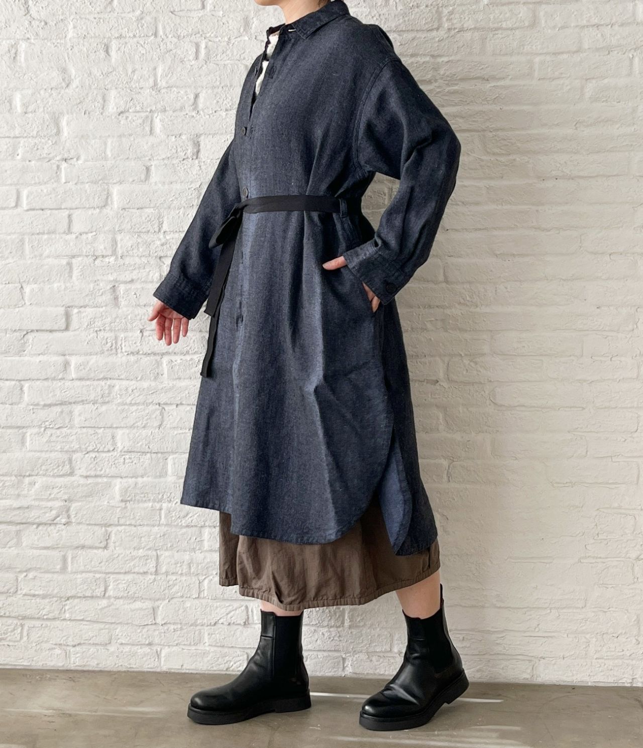 裏地がないので、冬はシャツワンピースとして上からアウターを羽織ったり、中にタートルネックを重ねて。