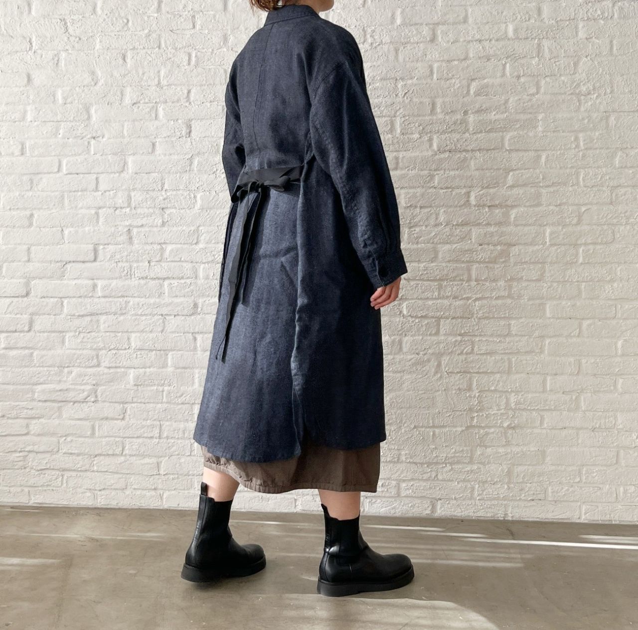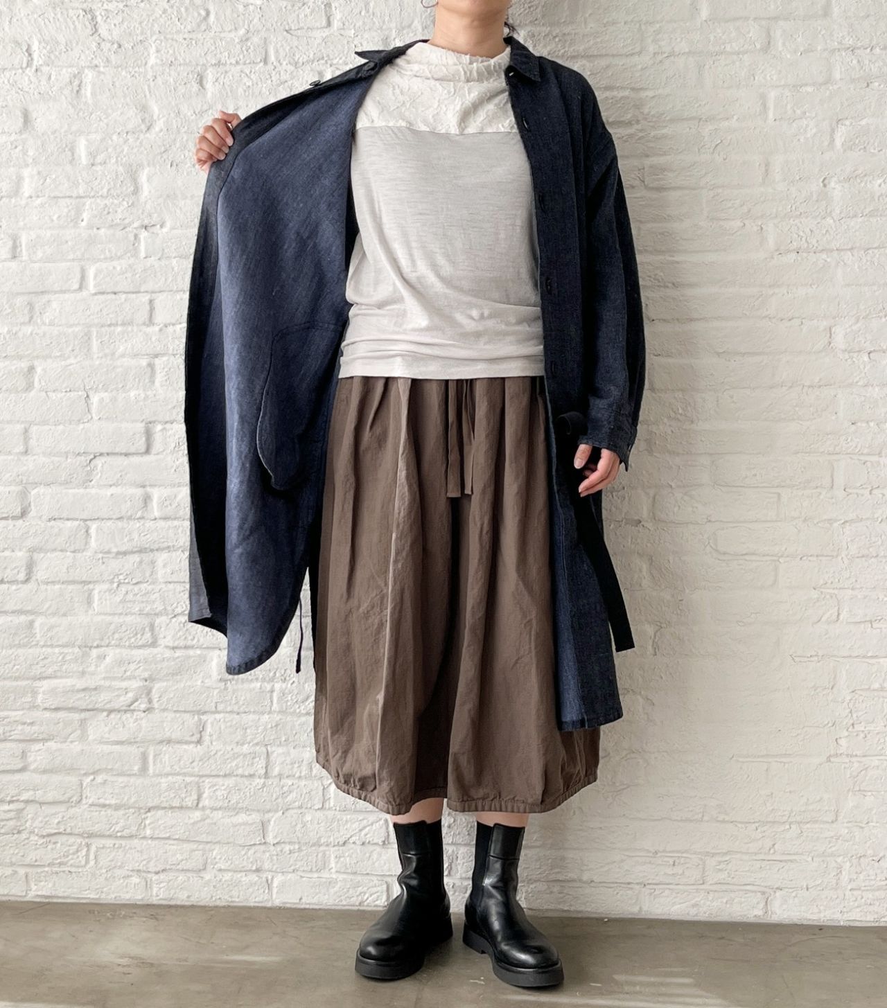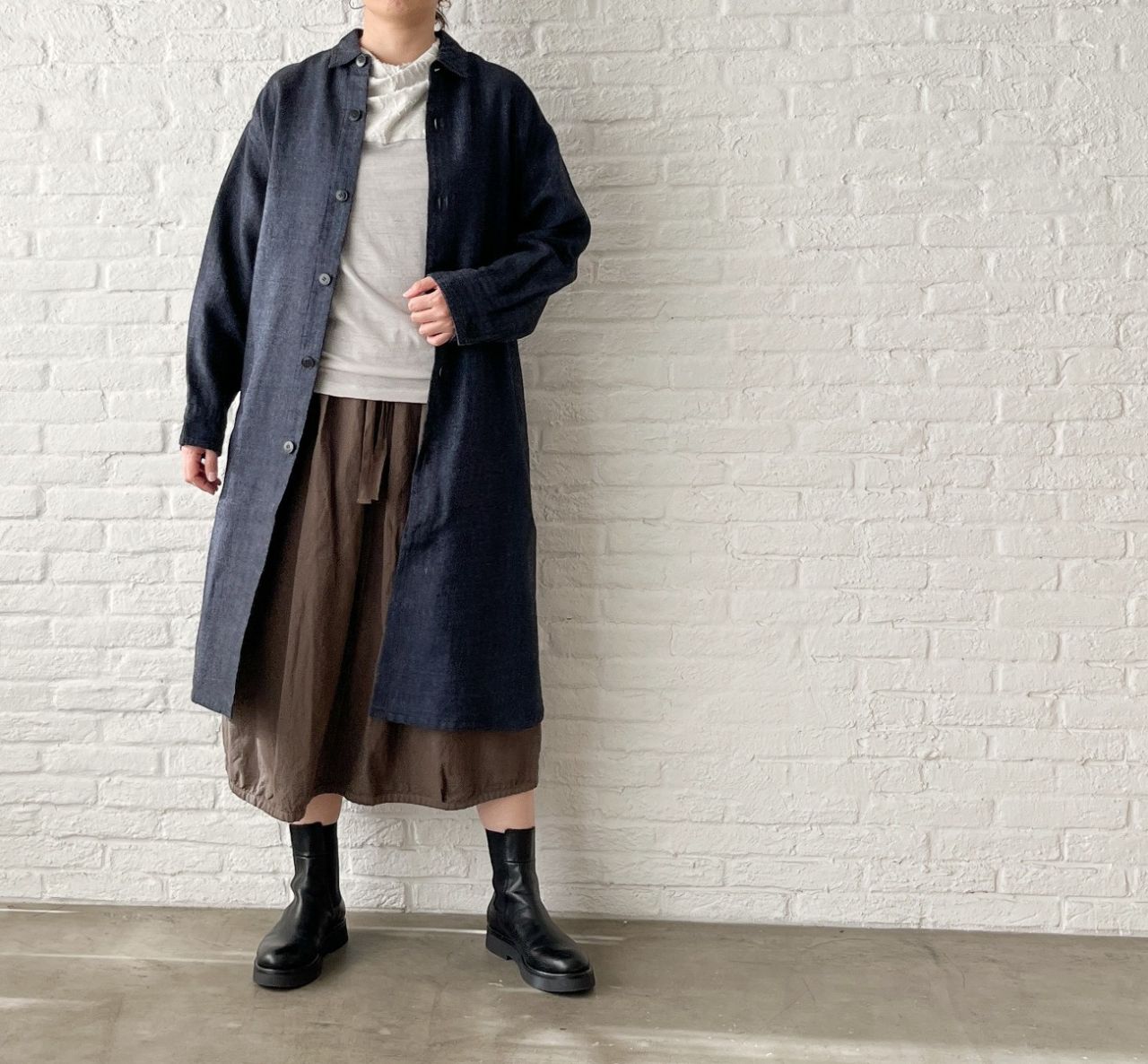 裏地がないので、冬はシャツワンピースとして上からアウターを羽織ったり、中にタートルネックを重ねて。