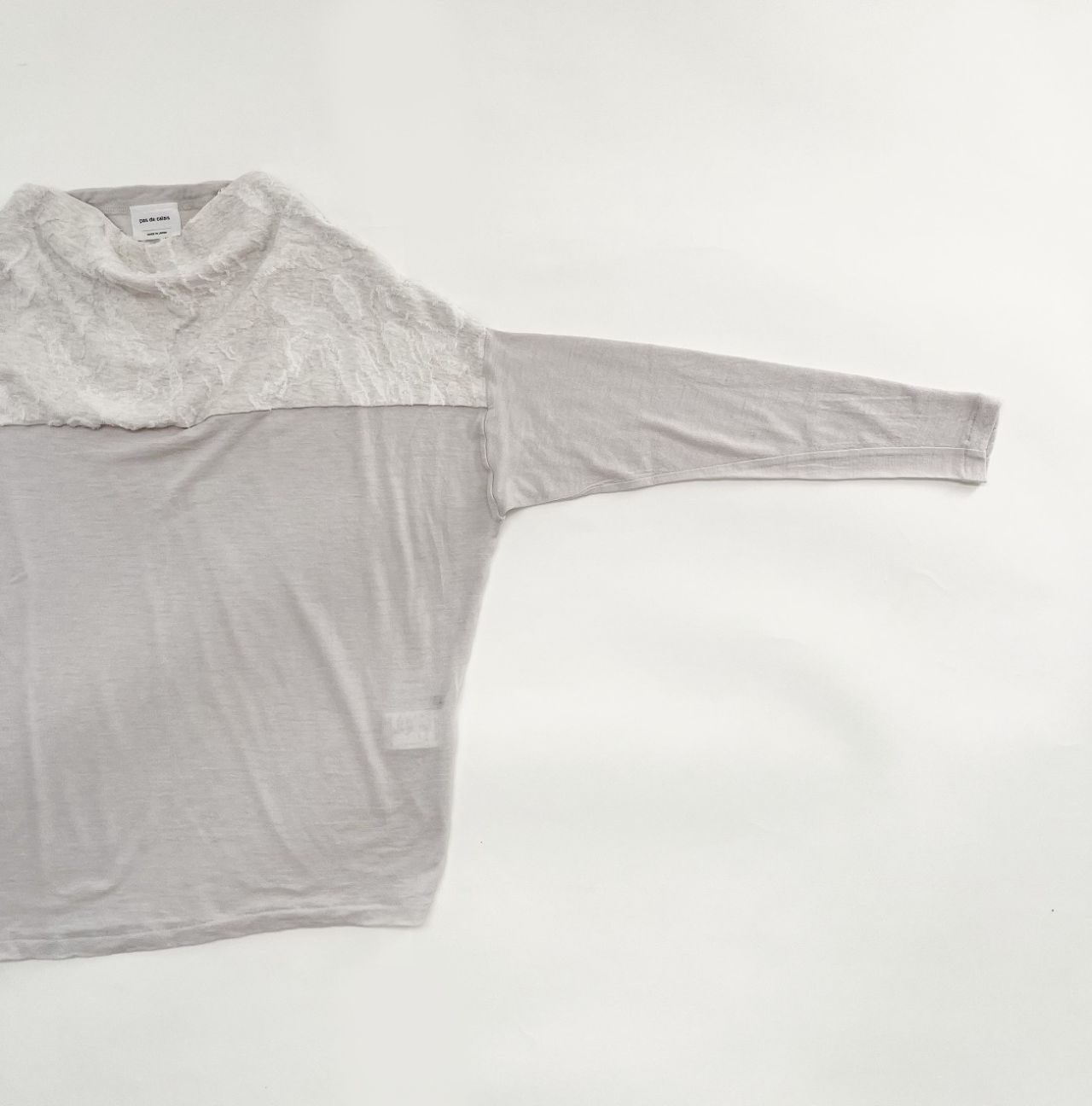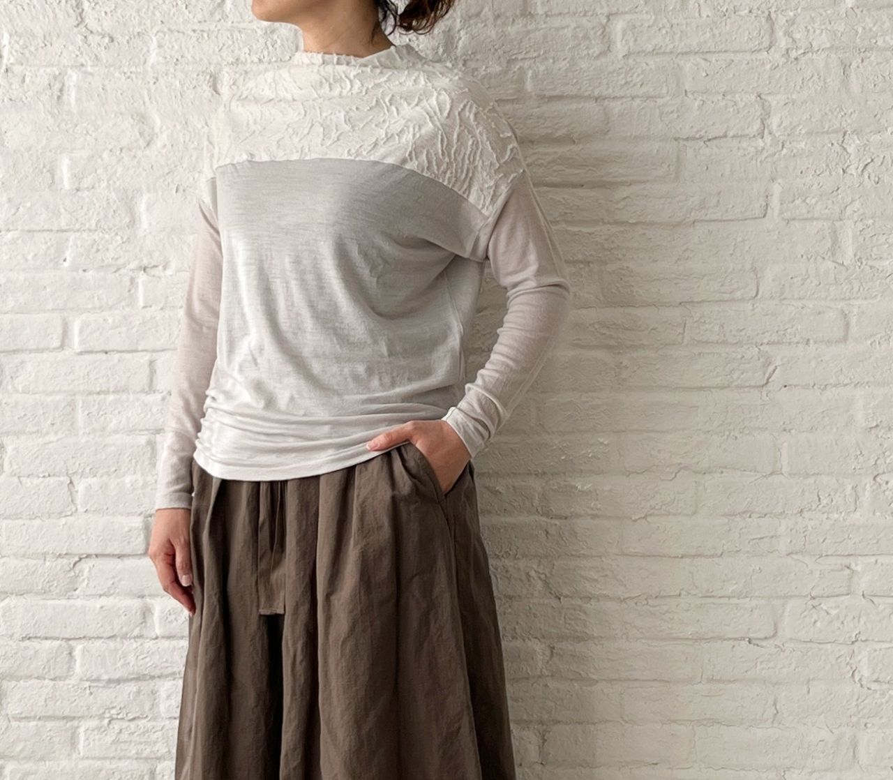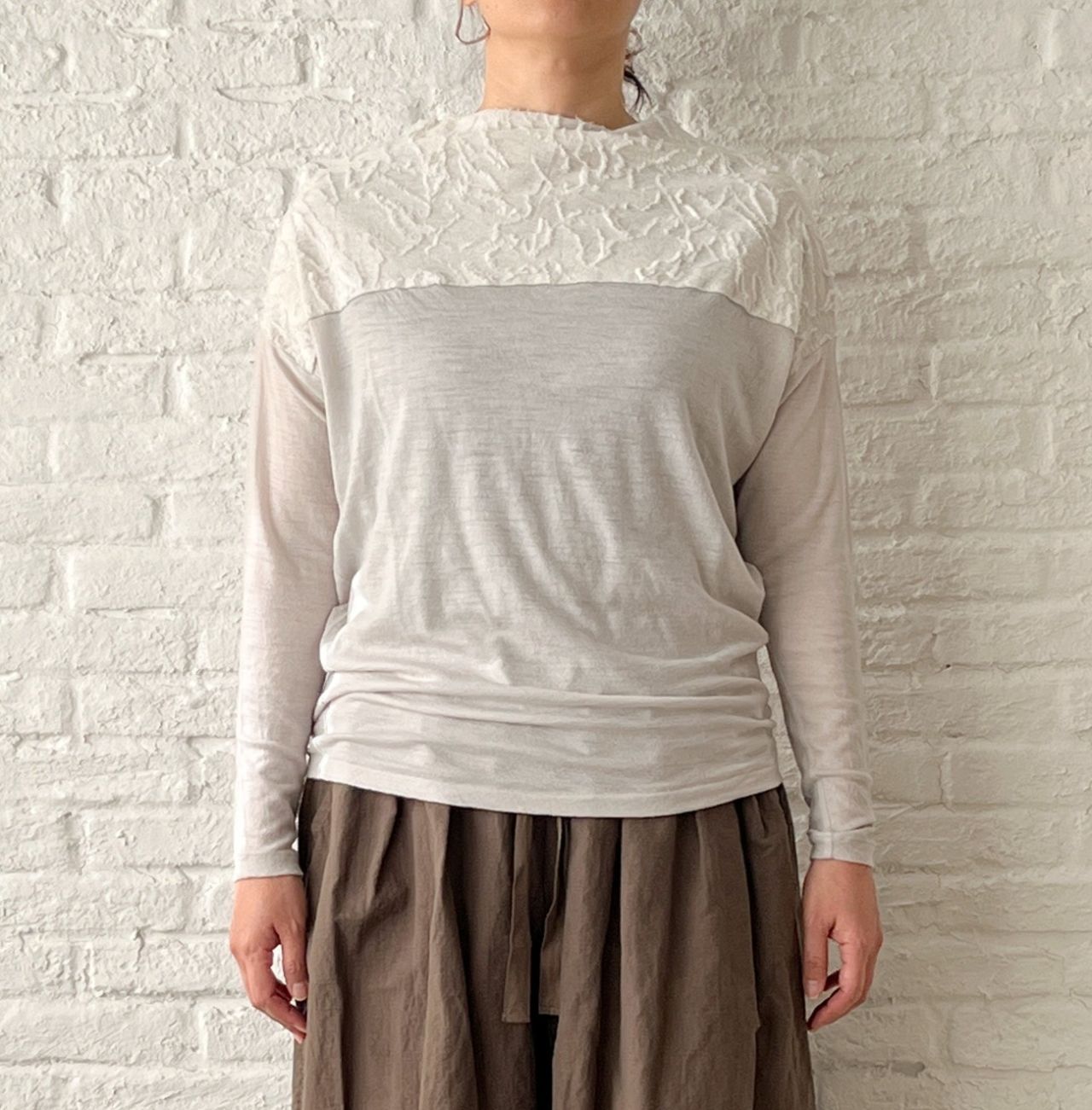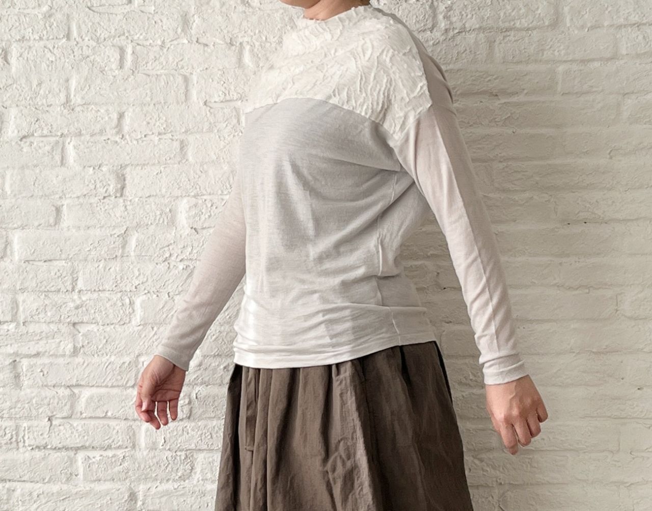 クシュッと自然な落ち感が出る襟元と、JQ素材との切り替えがポイント。