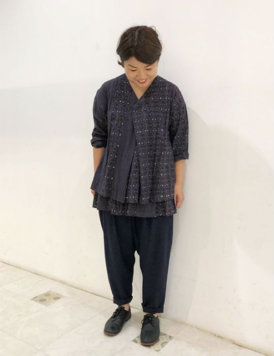 本日は、再入荷 したブロックプリントのブラウスでコーディネートのご紹介です。
