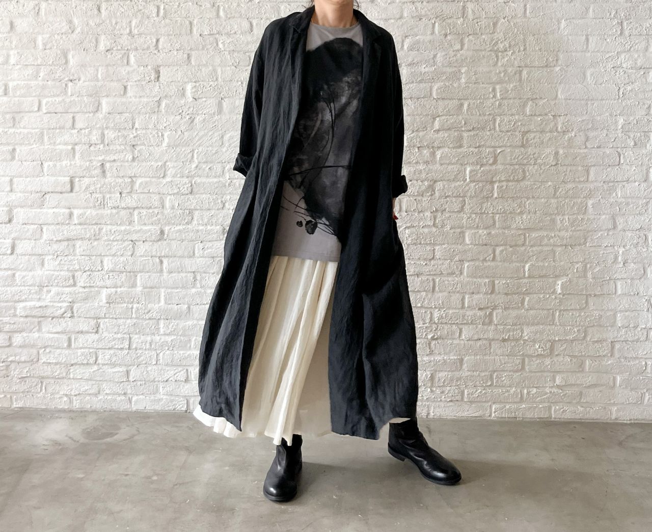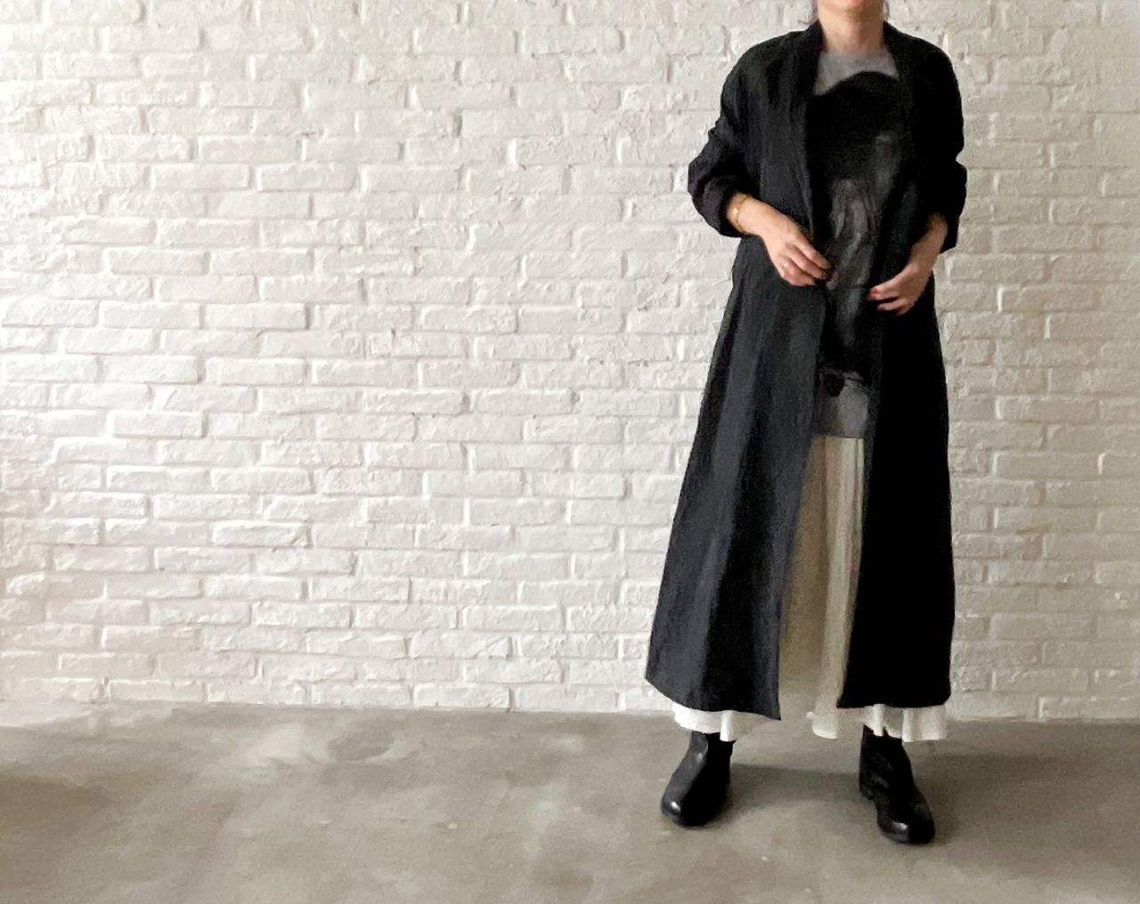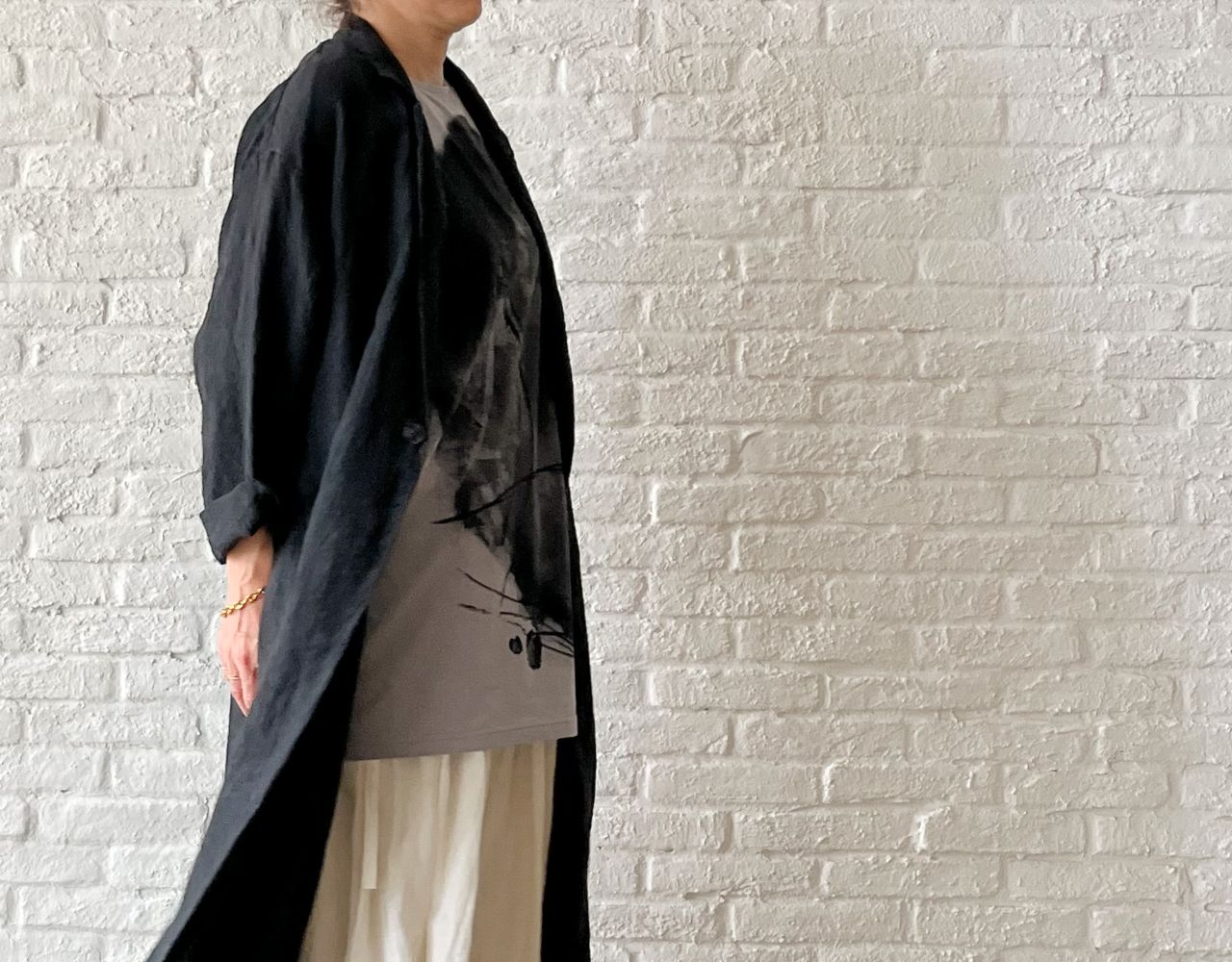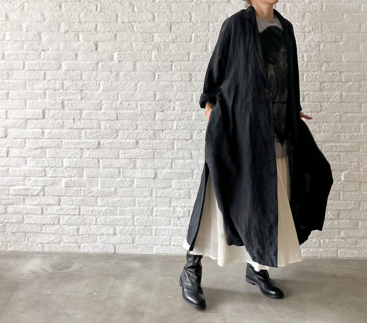 細めのテーラード襟や深いスリットデザインも、ラフな雰囲気が出て普段着使いに◎。