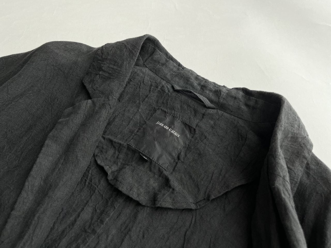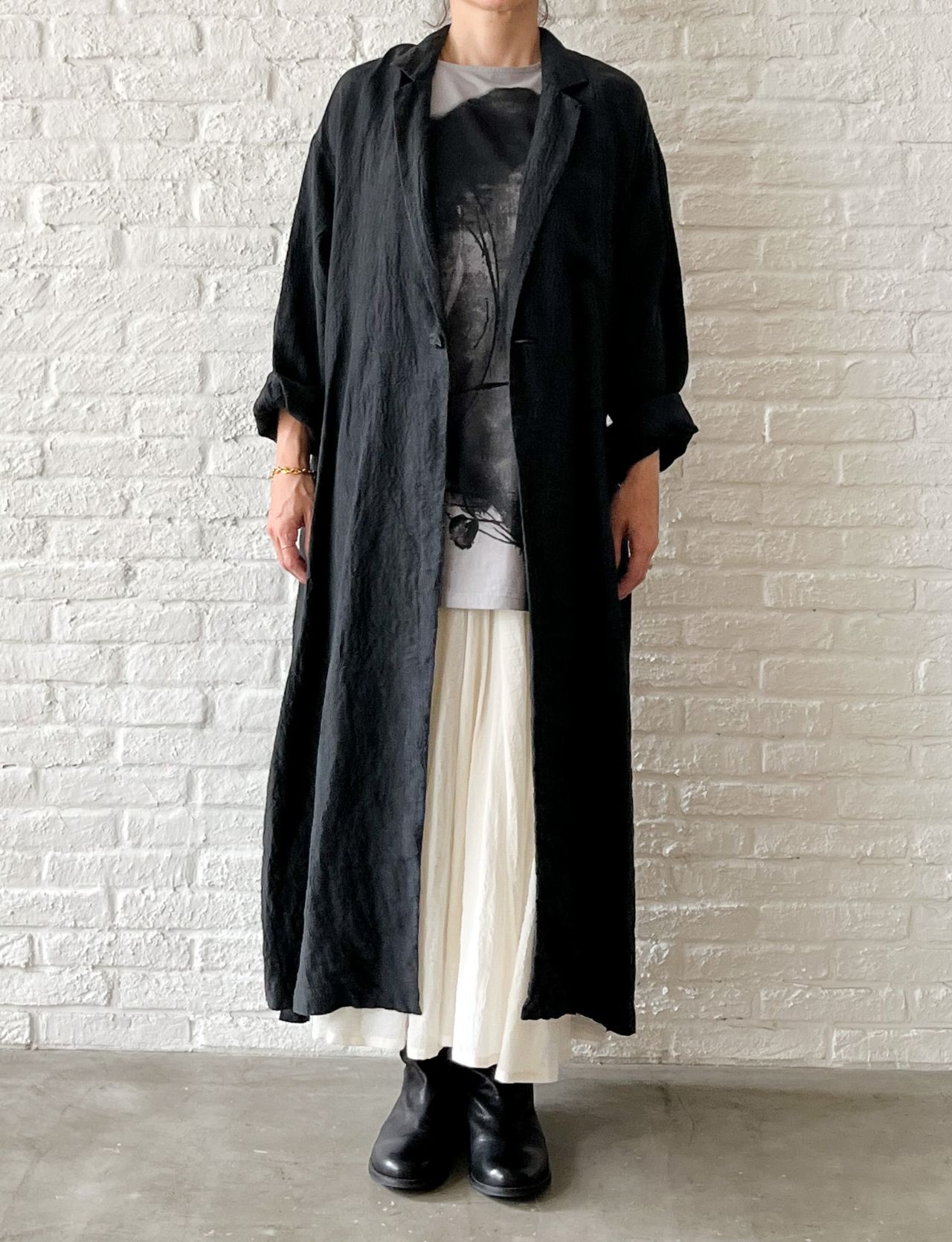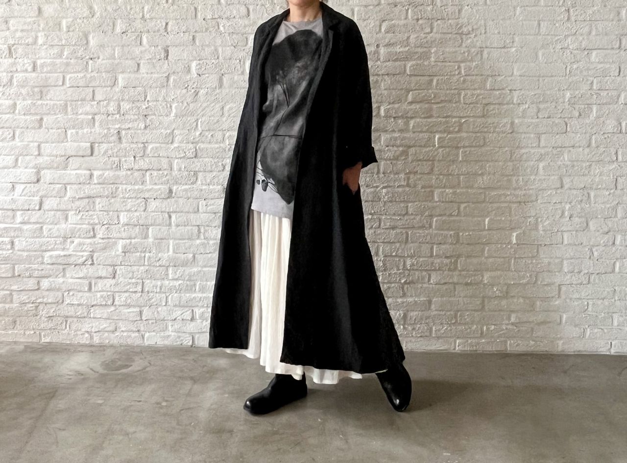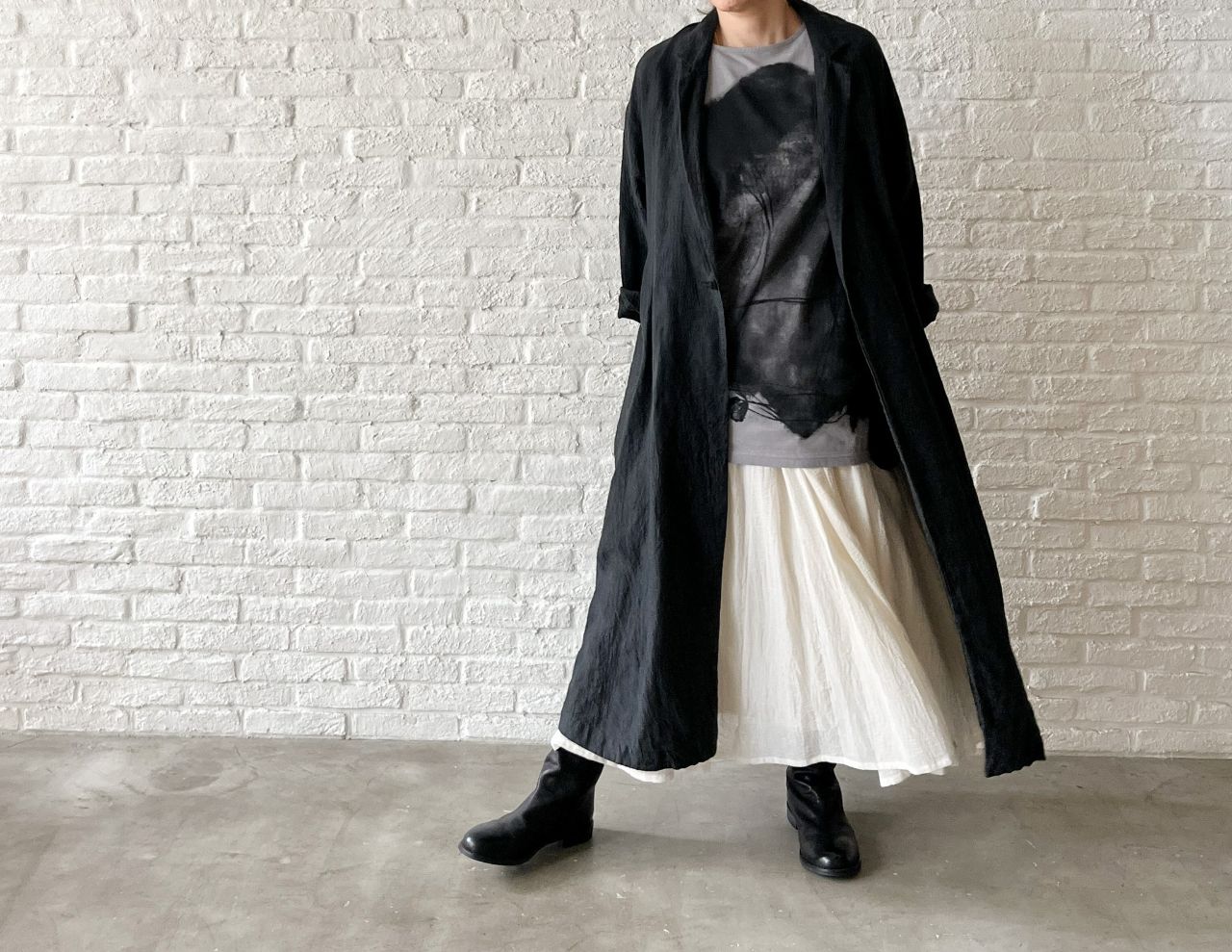 細めのテーラード襟や深いスリットデザインも、ラフな雰囲気が出て普段着使いに◎。