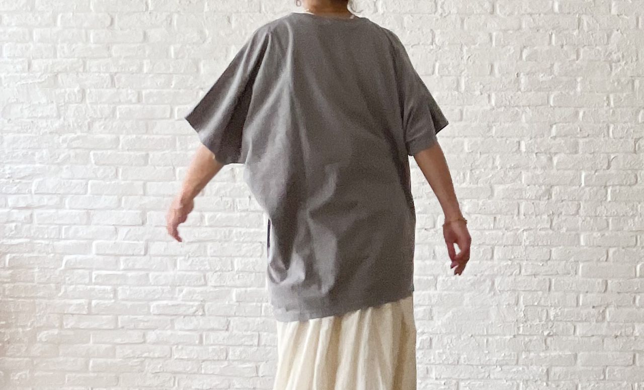 たっぷりした身幅はドルマンスリーブなので、腕周りもゆとりがあります。