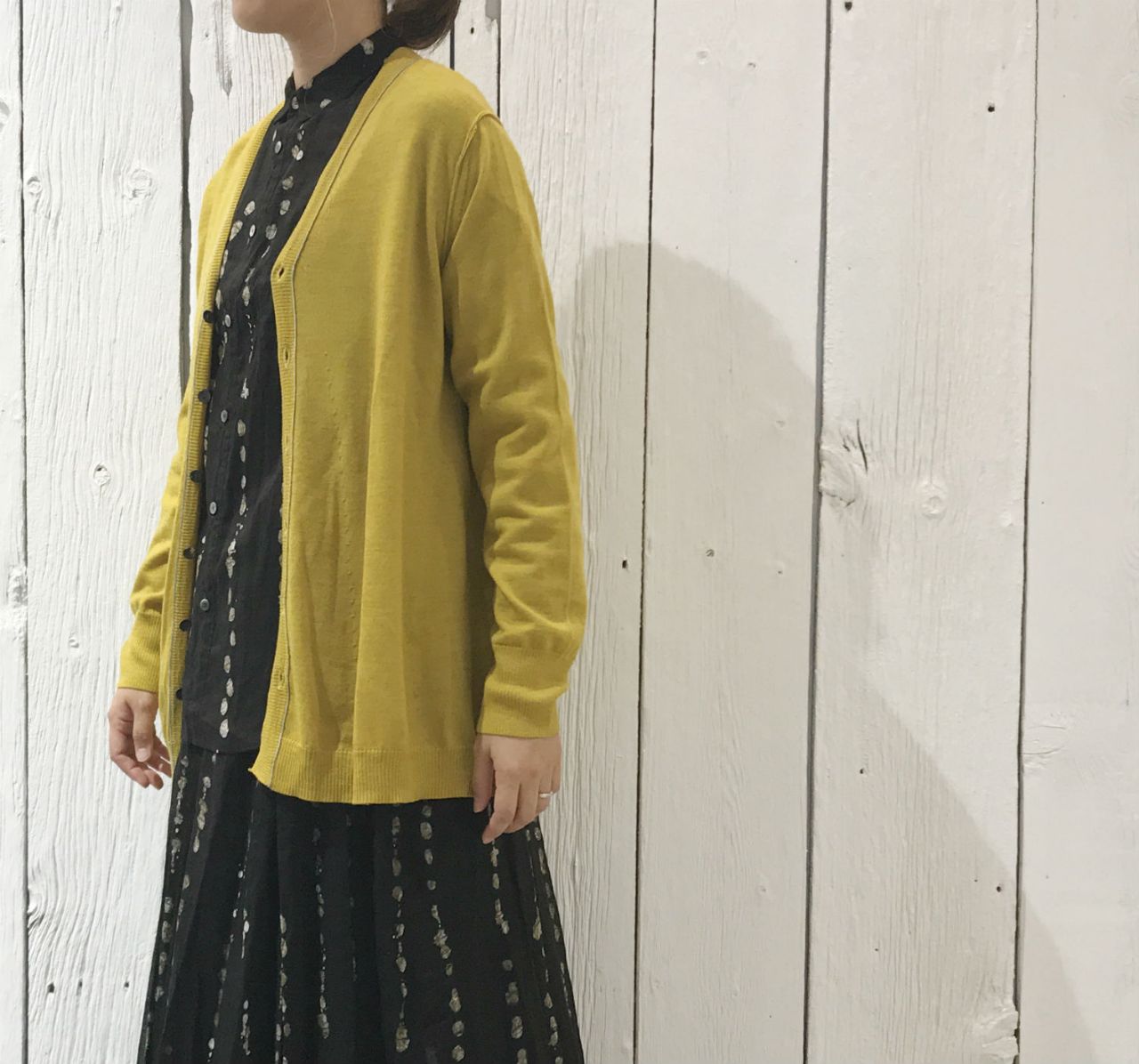 着丈も短すぎずにゆとりもあるので、中にニットを着ていただいても。