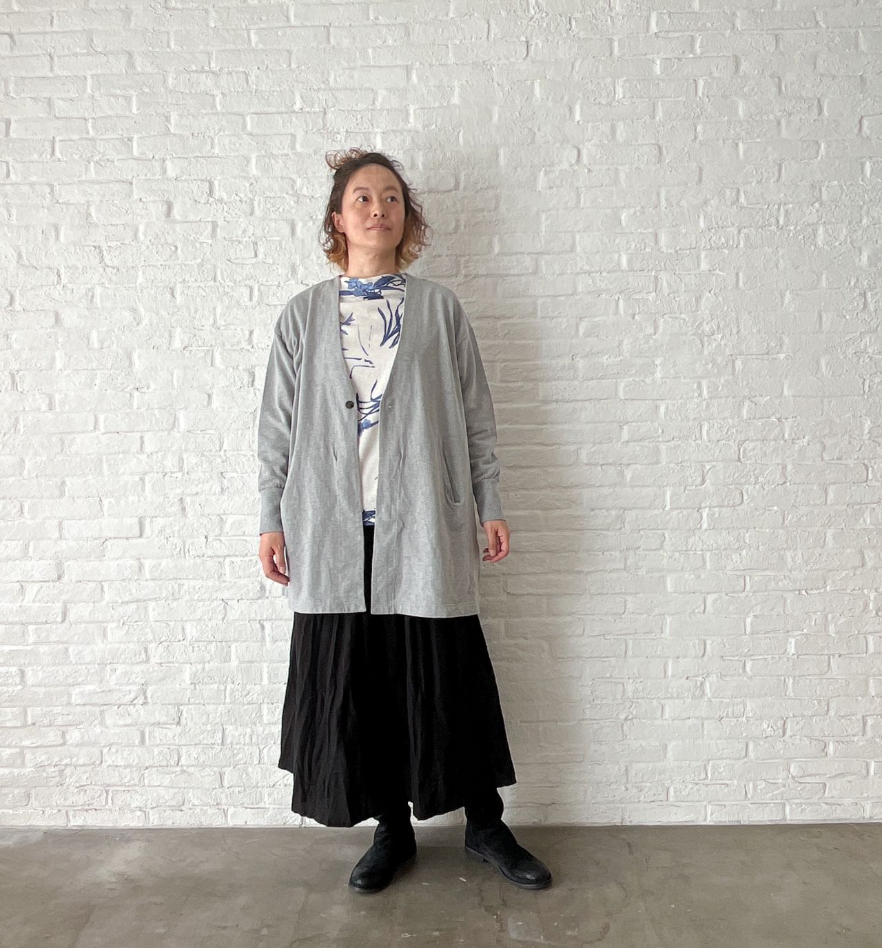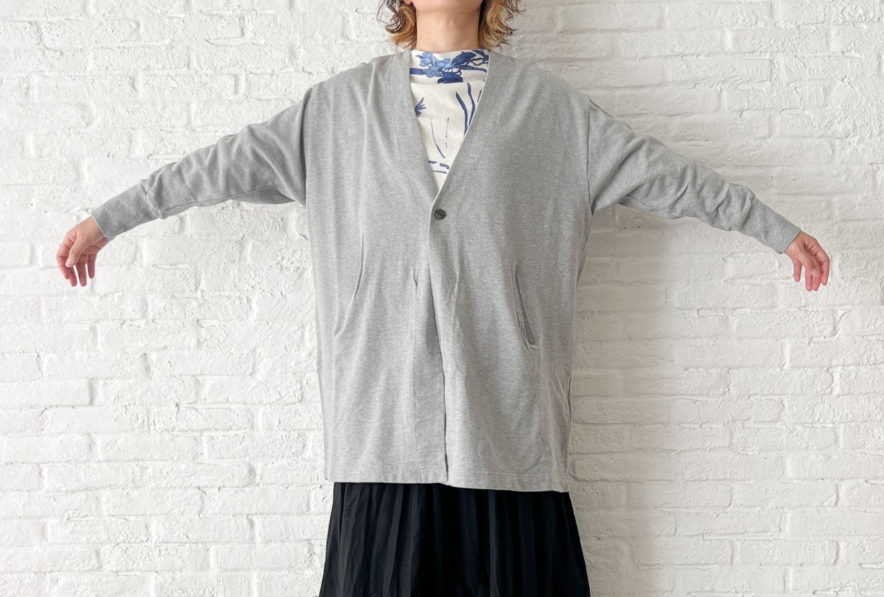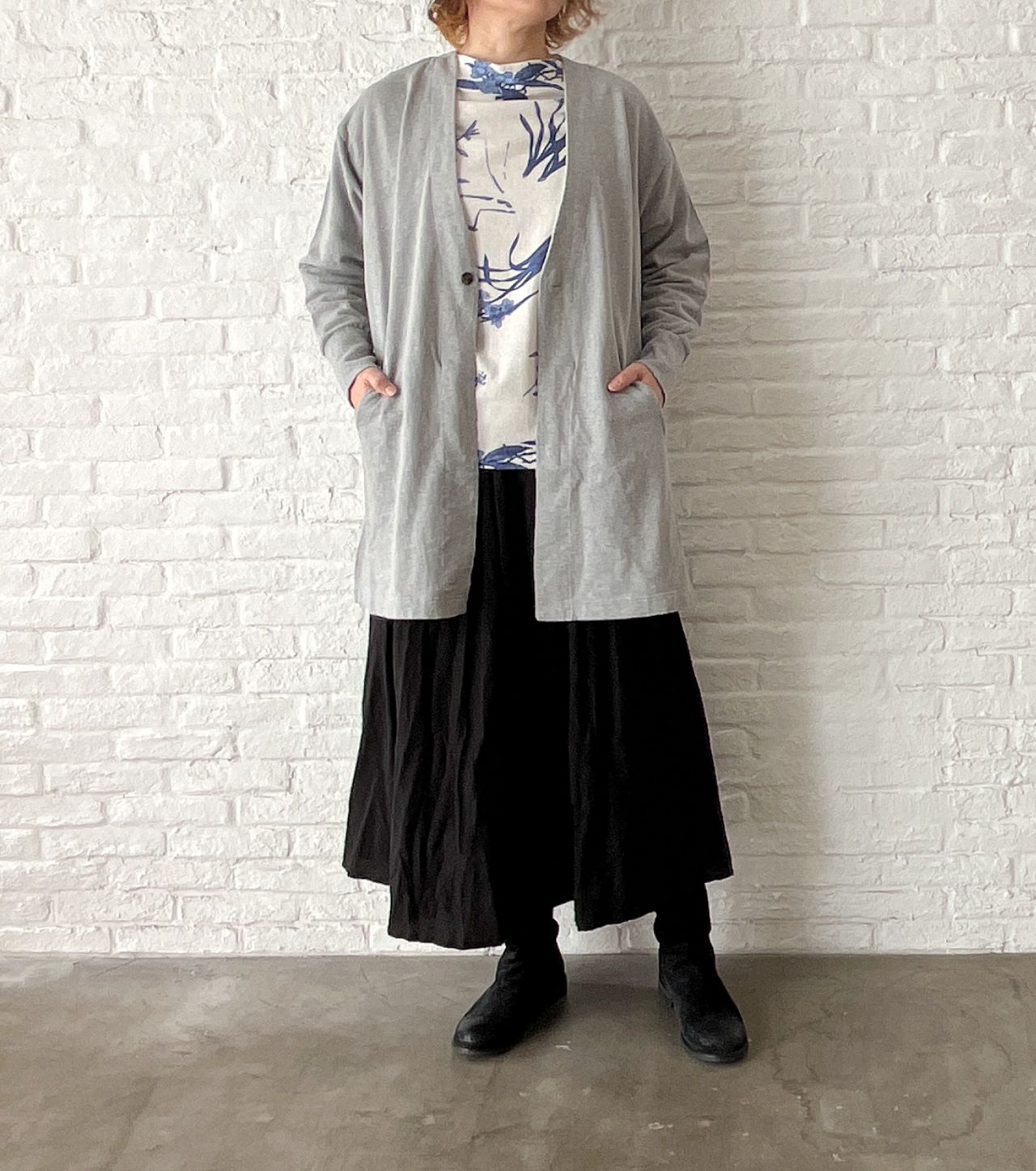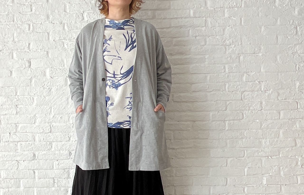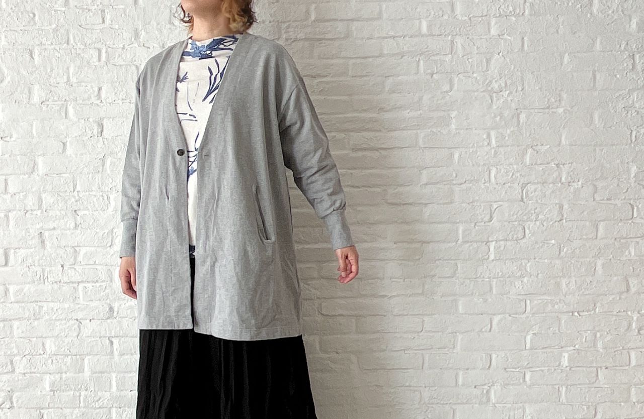 端境期の不安定な時期に便利な、厚すぎず薄すぎない、アウターインにもできるしアウターとしても着ていただけて便利です。