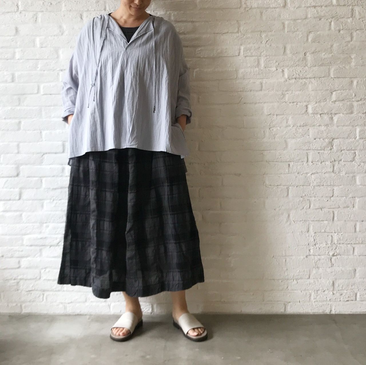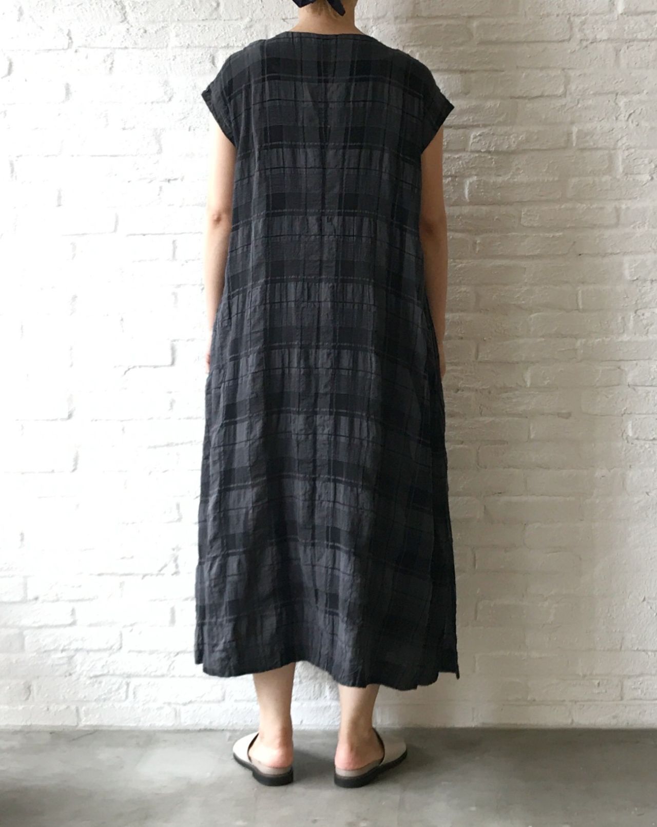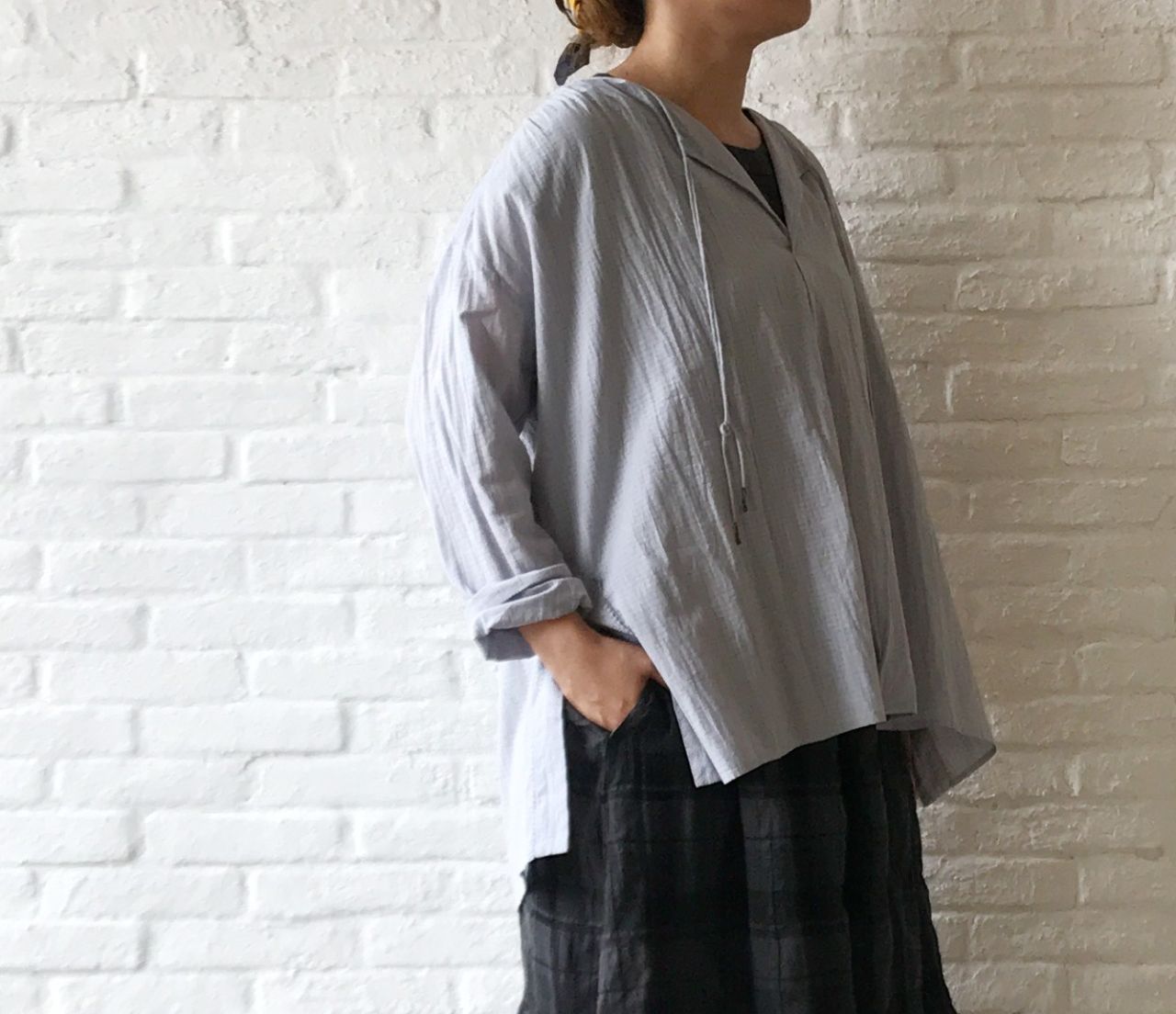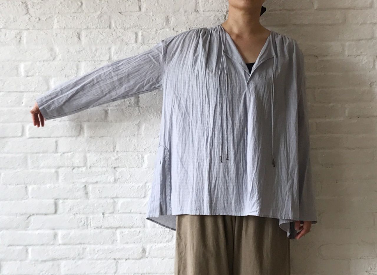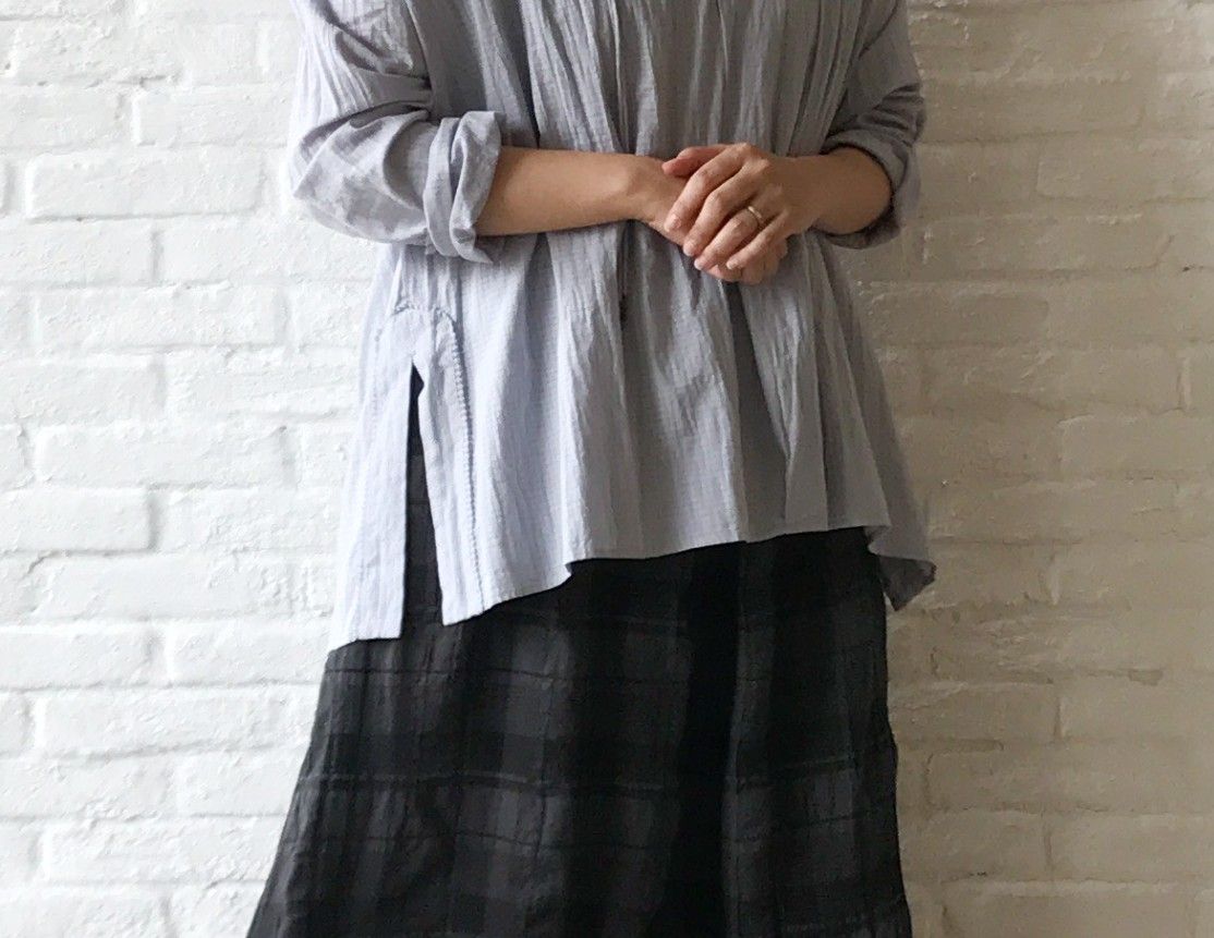 ドビーチェック生地をメインに、ヨークとスリット部分にはドビーストライプ生地を使用しています。