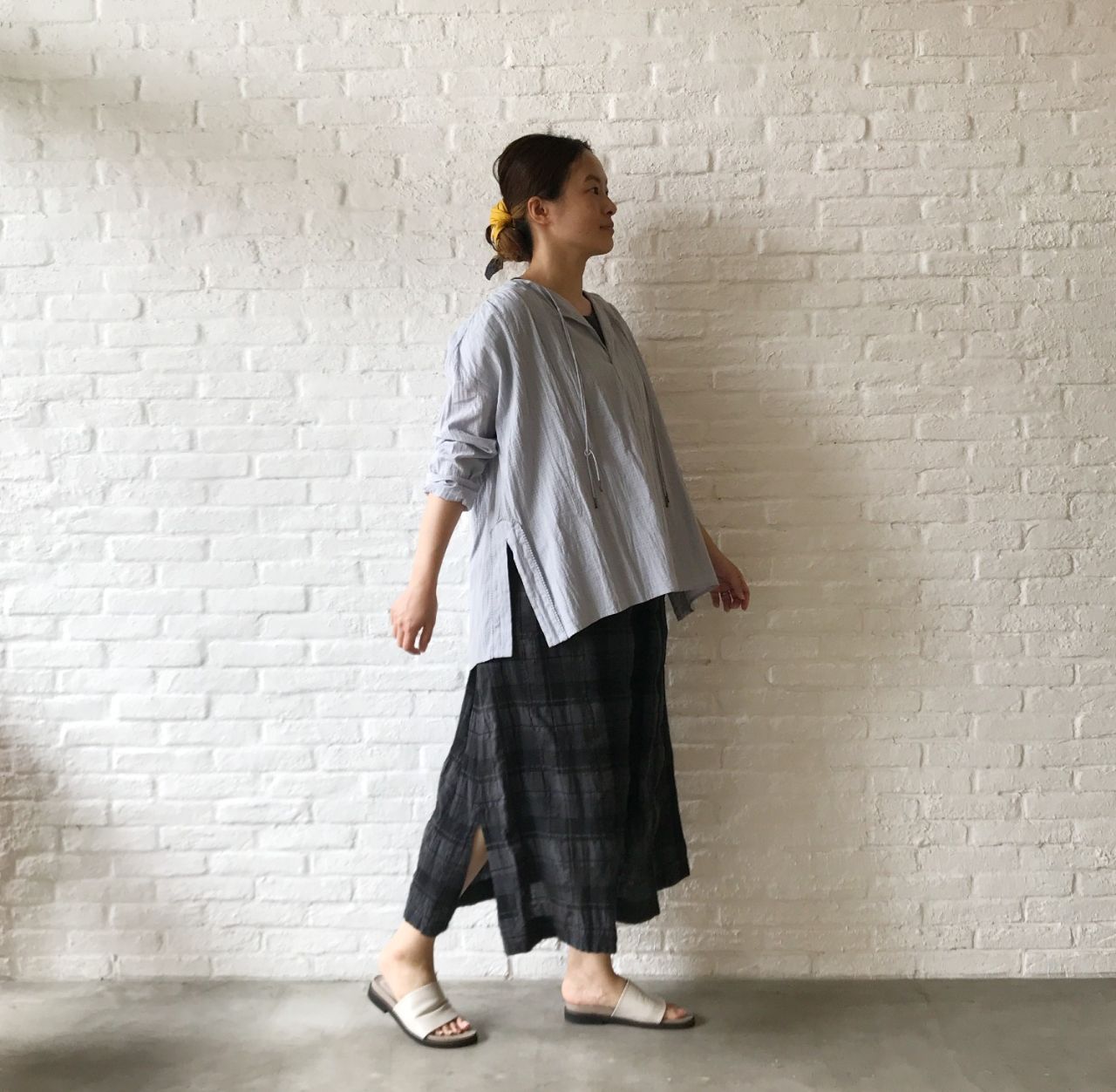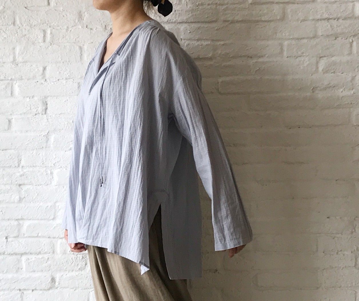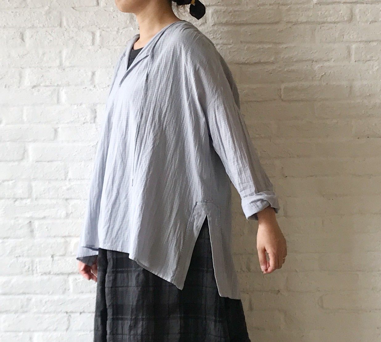 被りで着ていただけるスモックタイプに、両サイドのスリットを入れてアクセントにしました。