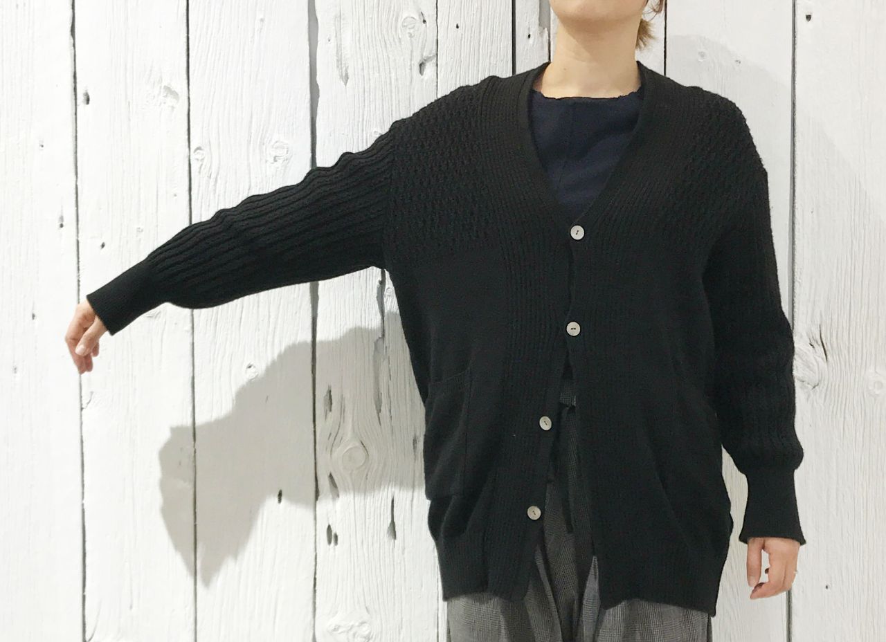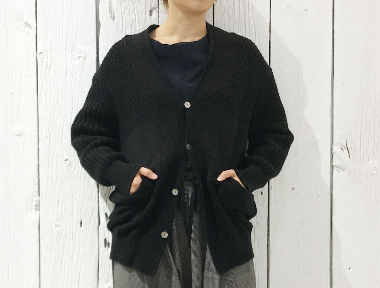 ”あると便利な”黒いカーディガンは、パッチワーク柄。