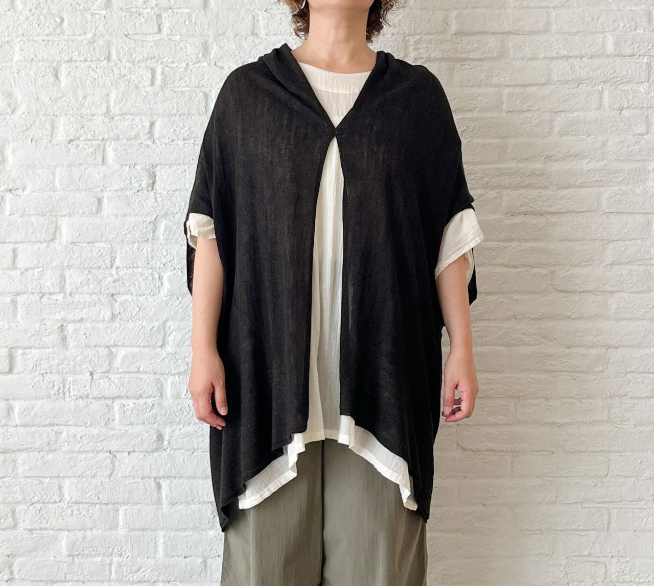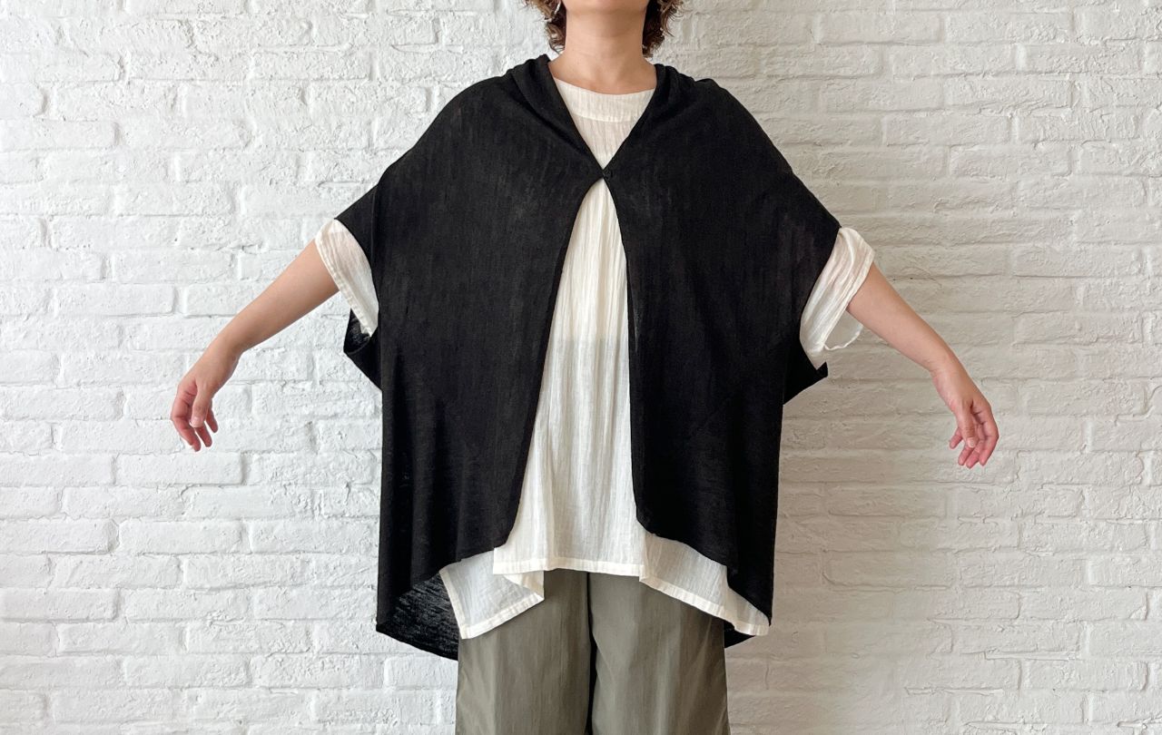 天然植物繊維の麻の風合いを生かしてサラッとして吸湿性に富み、さらにそこにレーヨンのドレープ感をプラスしてデザインに活かしました。