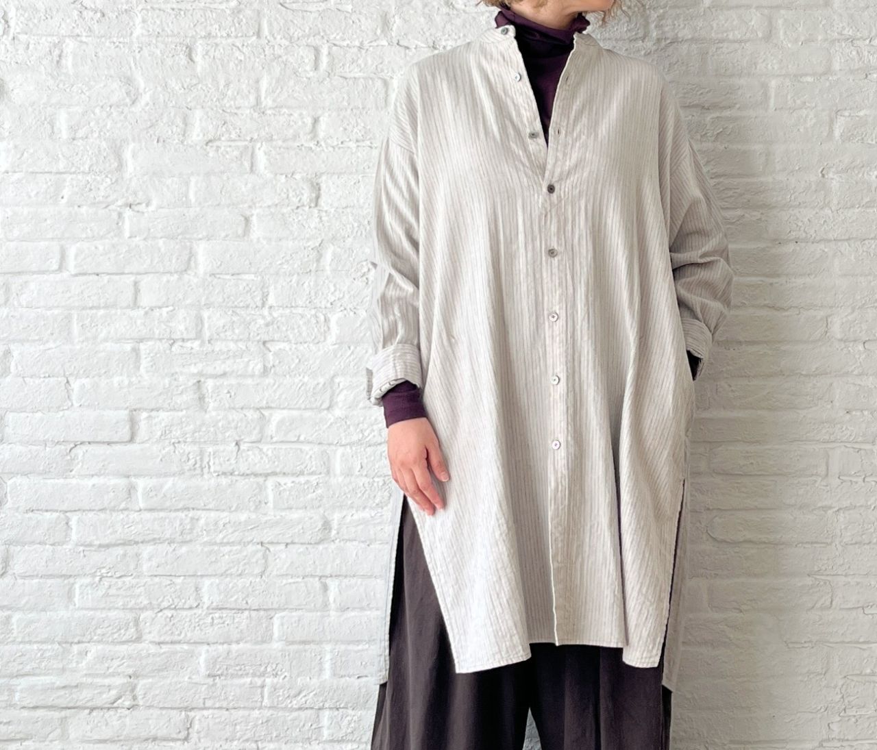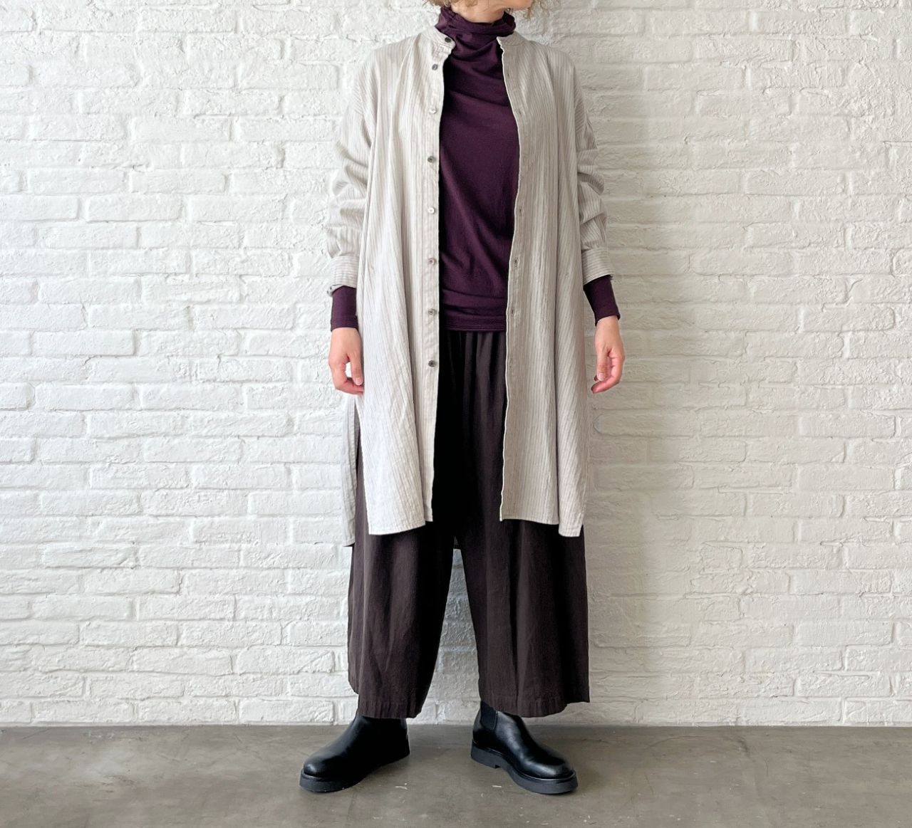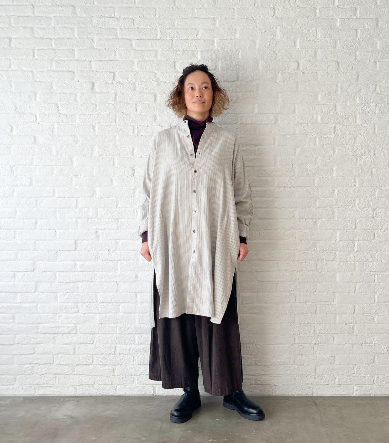 シャツワンピースの中に合わせて、衿元を少し深めに開けてインナーをのぞかせました。