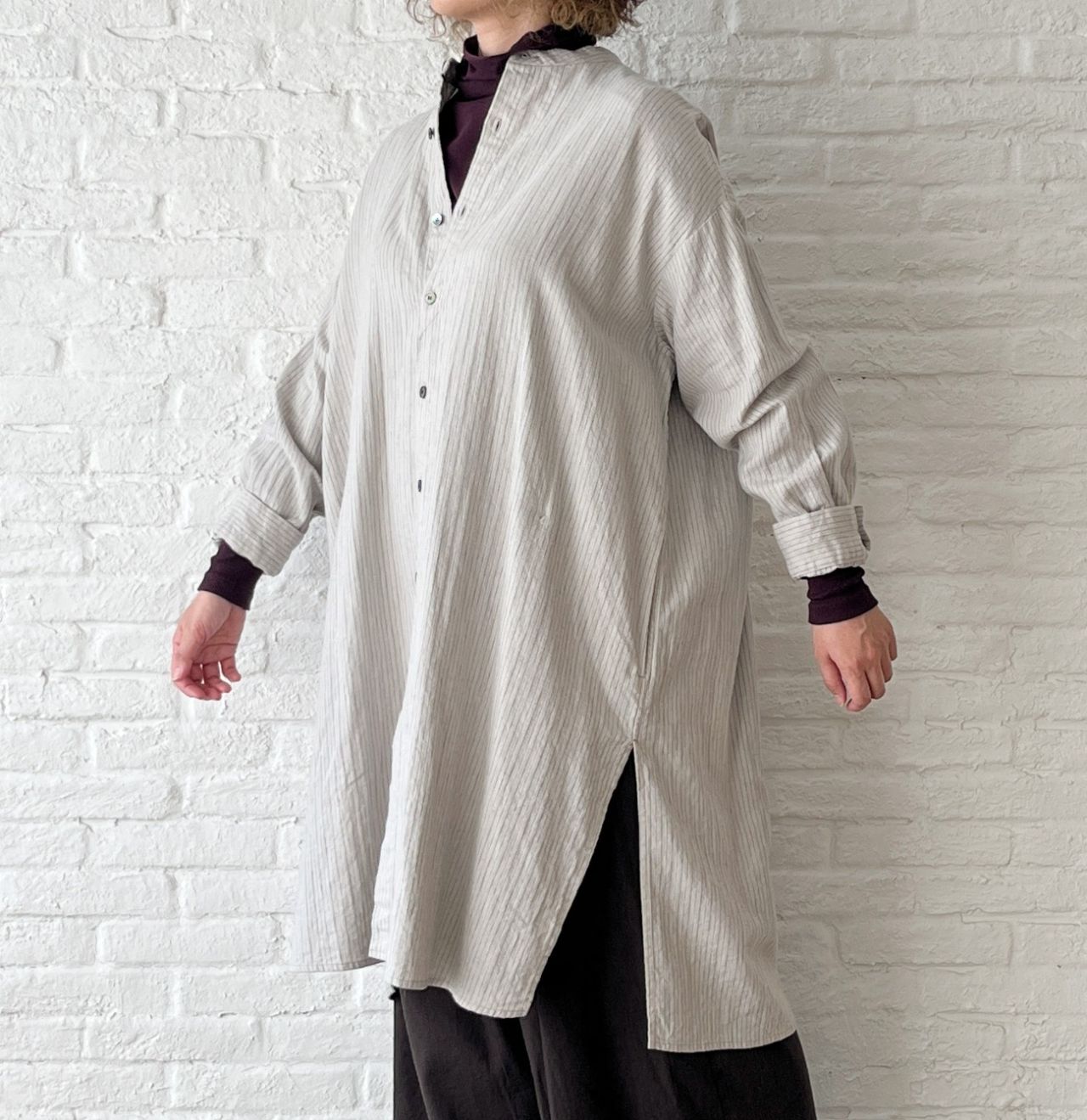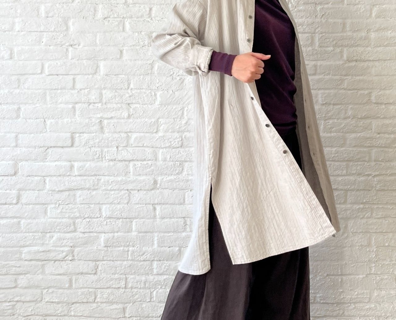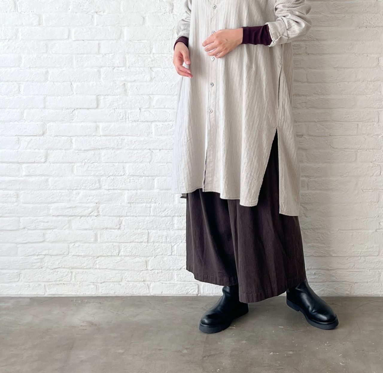 シャツワンピースの中に合わせて、衿元を少し深めに開けてインナーをのぞかせました。