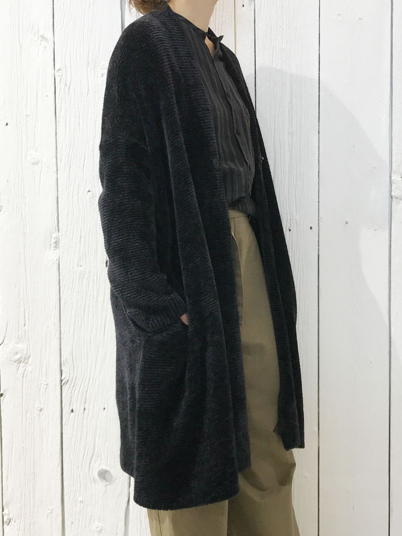 秋冬は、モサッとした厚手のニットカーディガンを。
