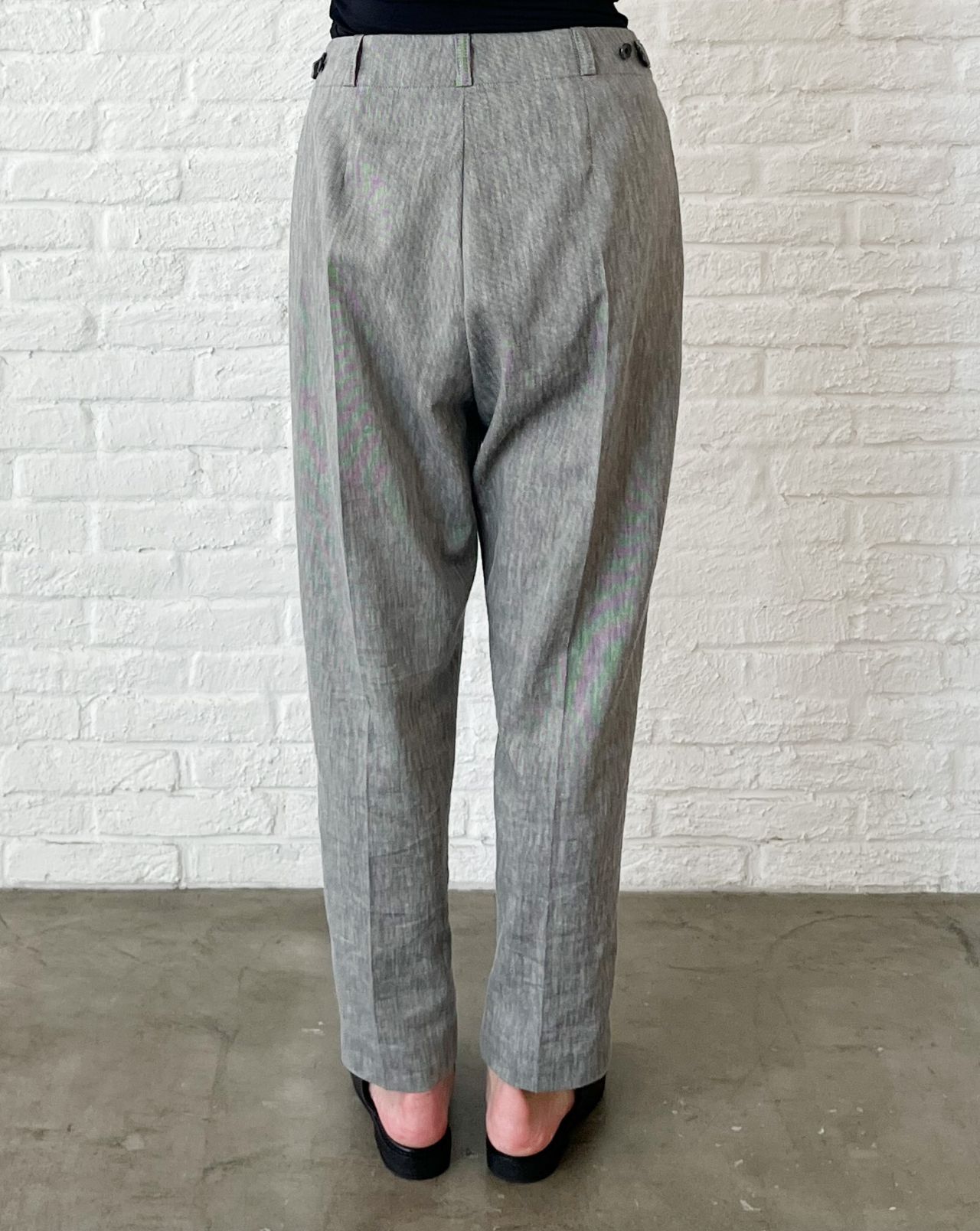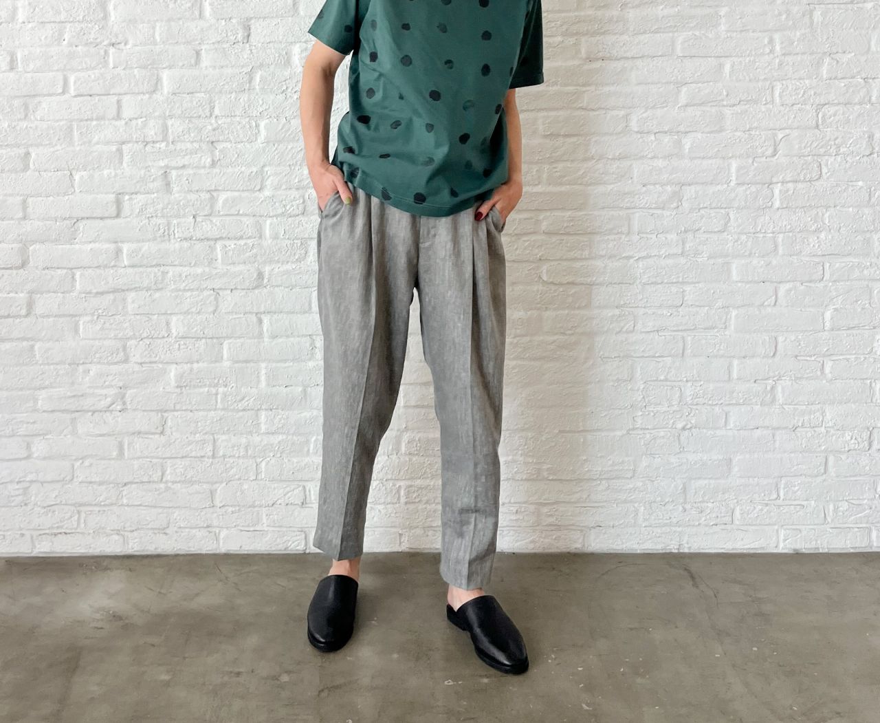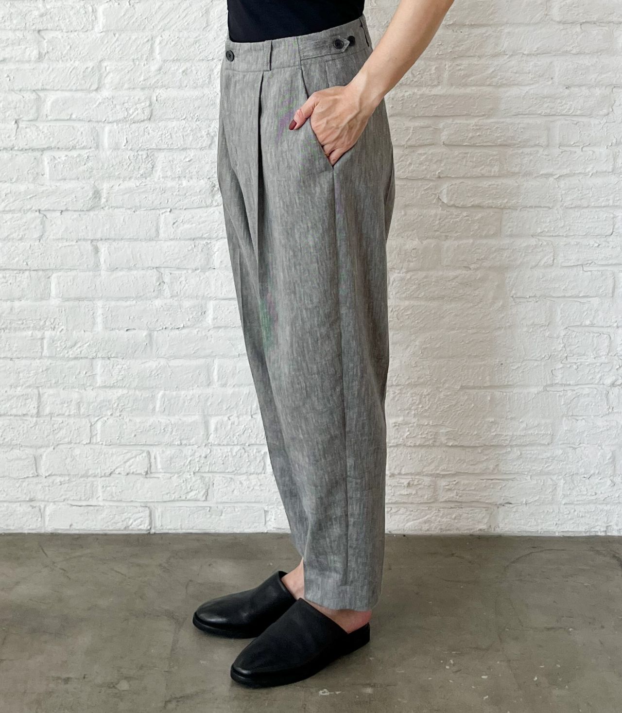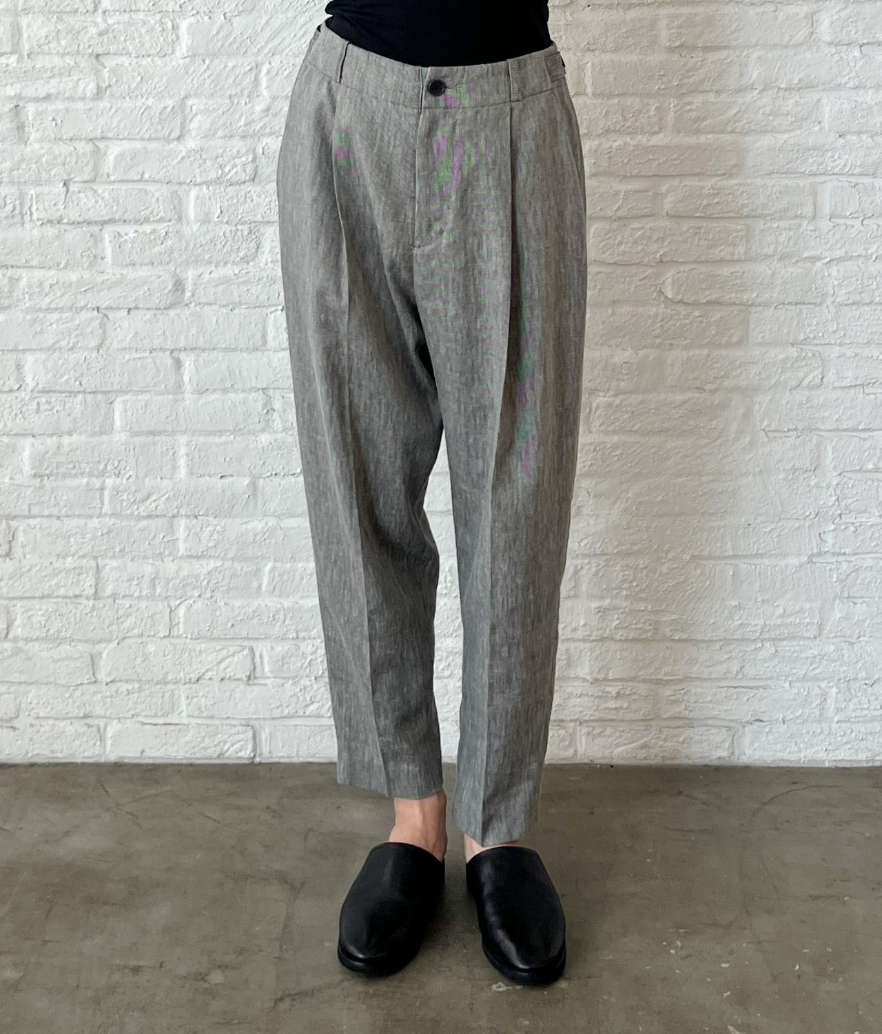 シャンブレー感ある明るいグレーのセンタープレスパンツ。