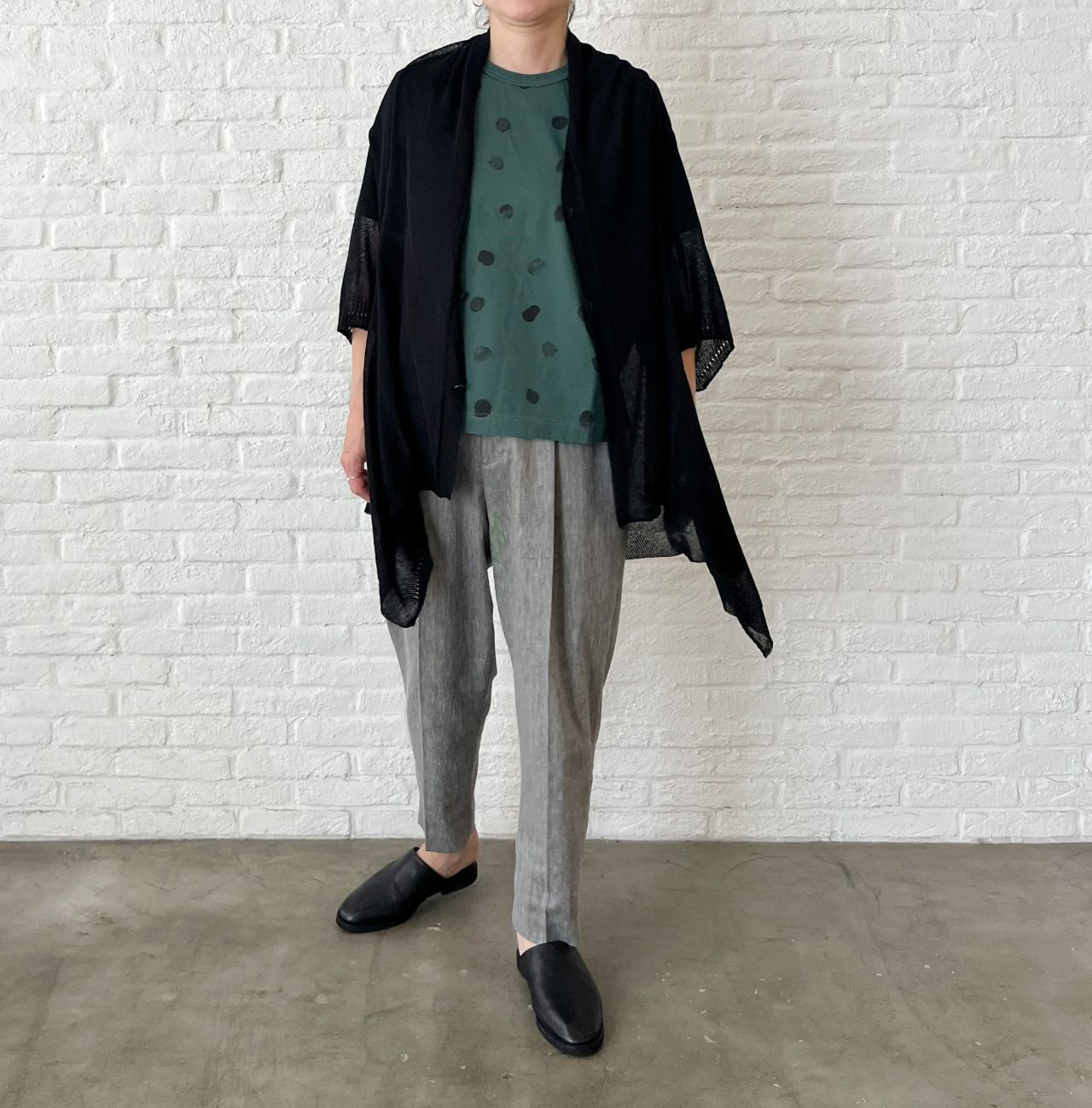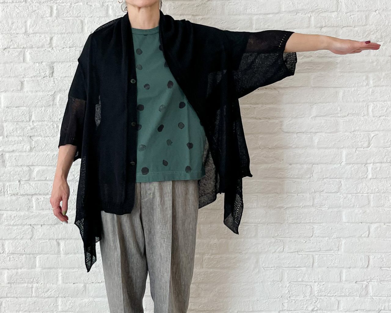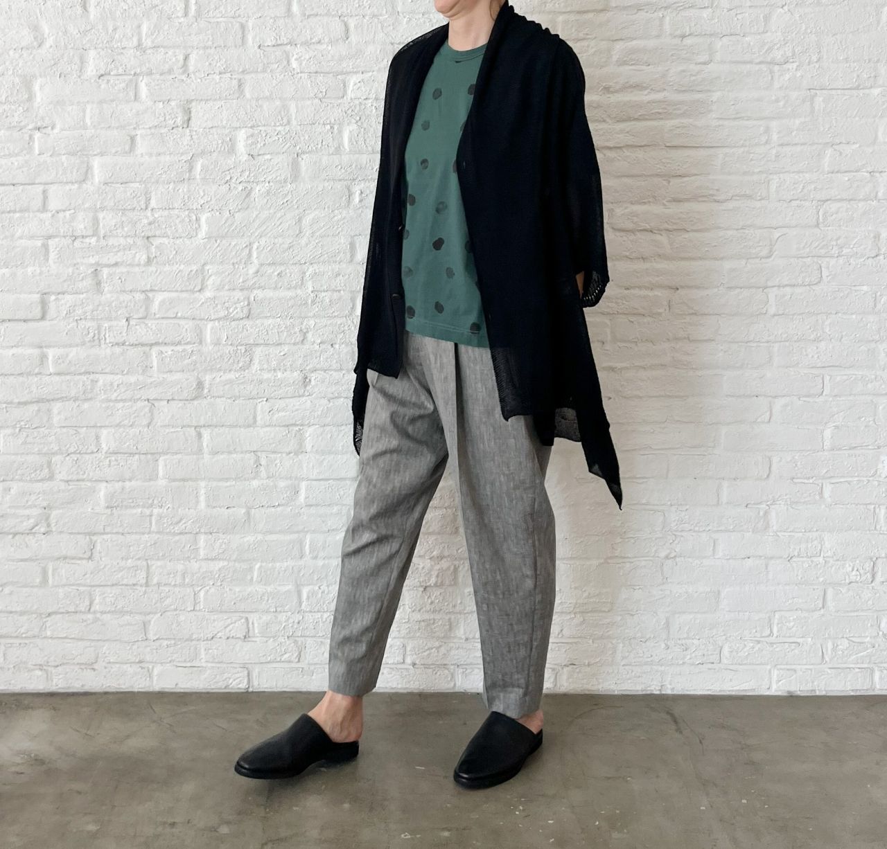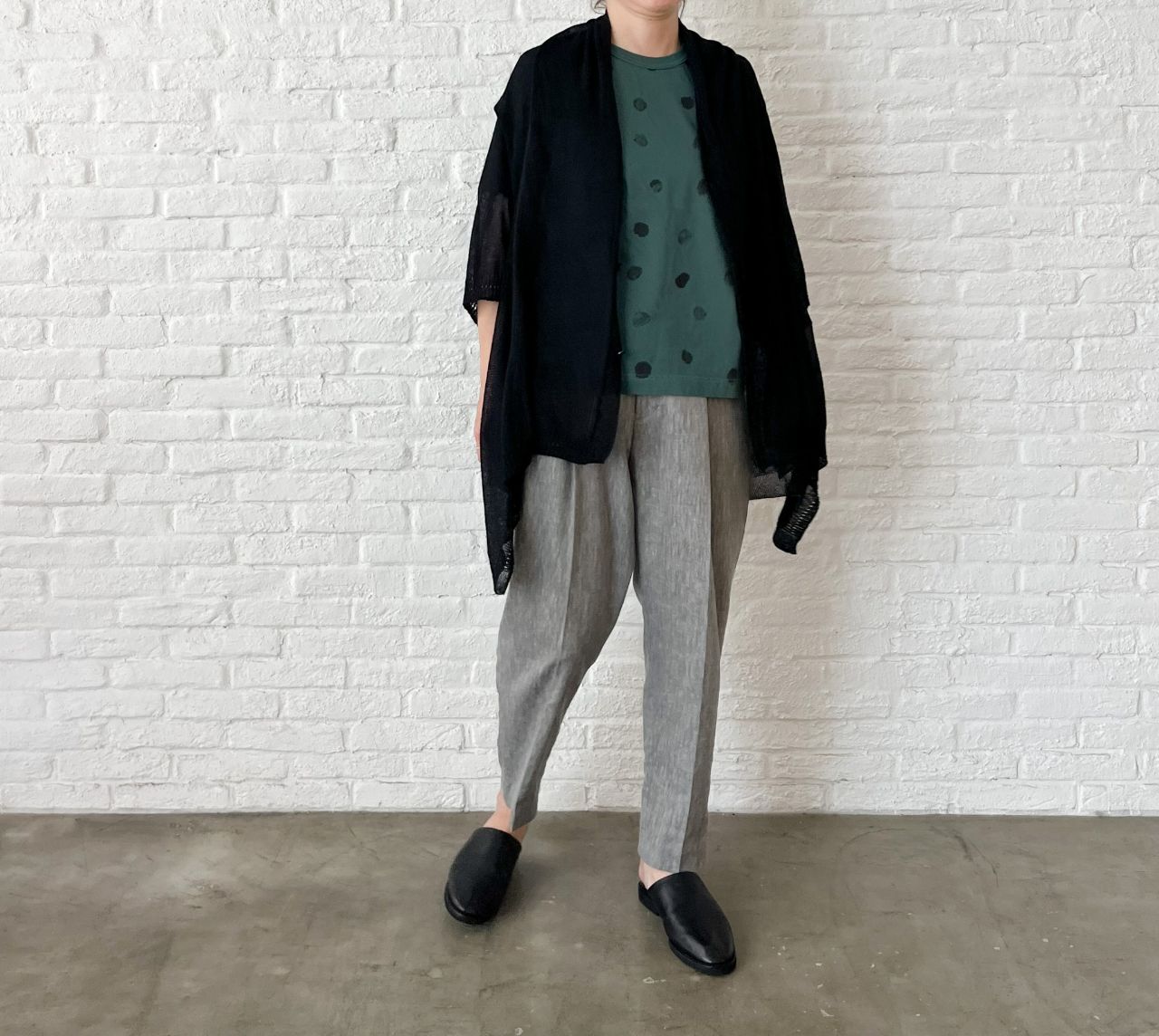 まだ入荷していない商品ですが、リネン混の透け感あるたっぷりカーディガンを羽織るとナチュラルな印象に。